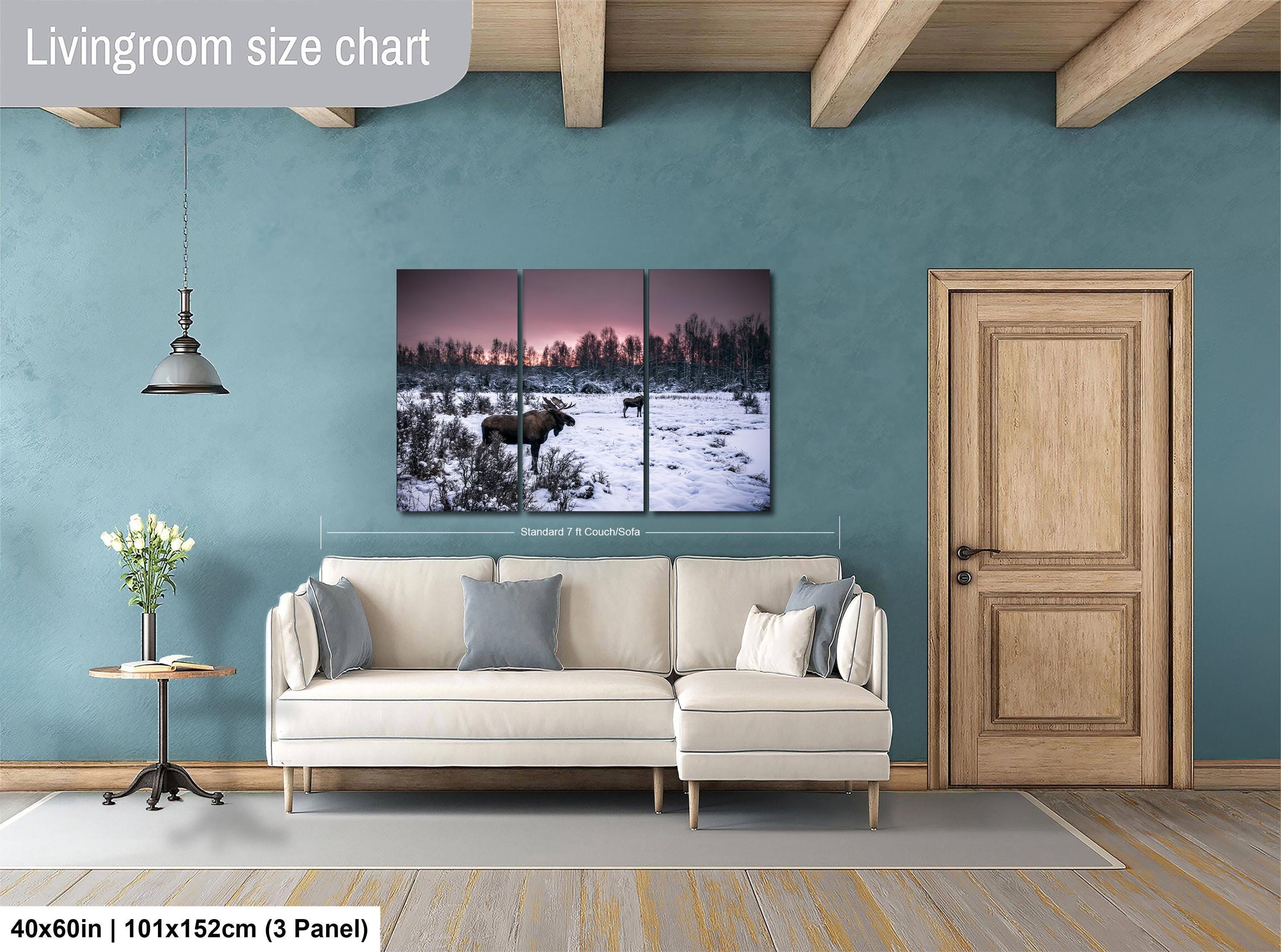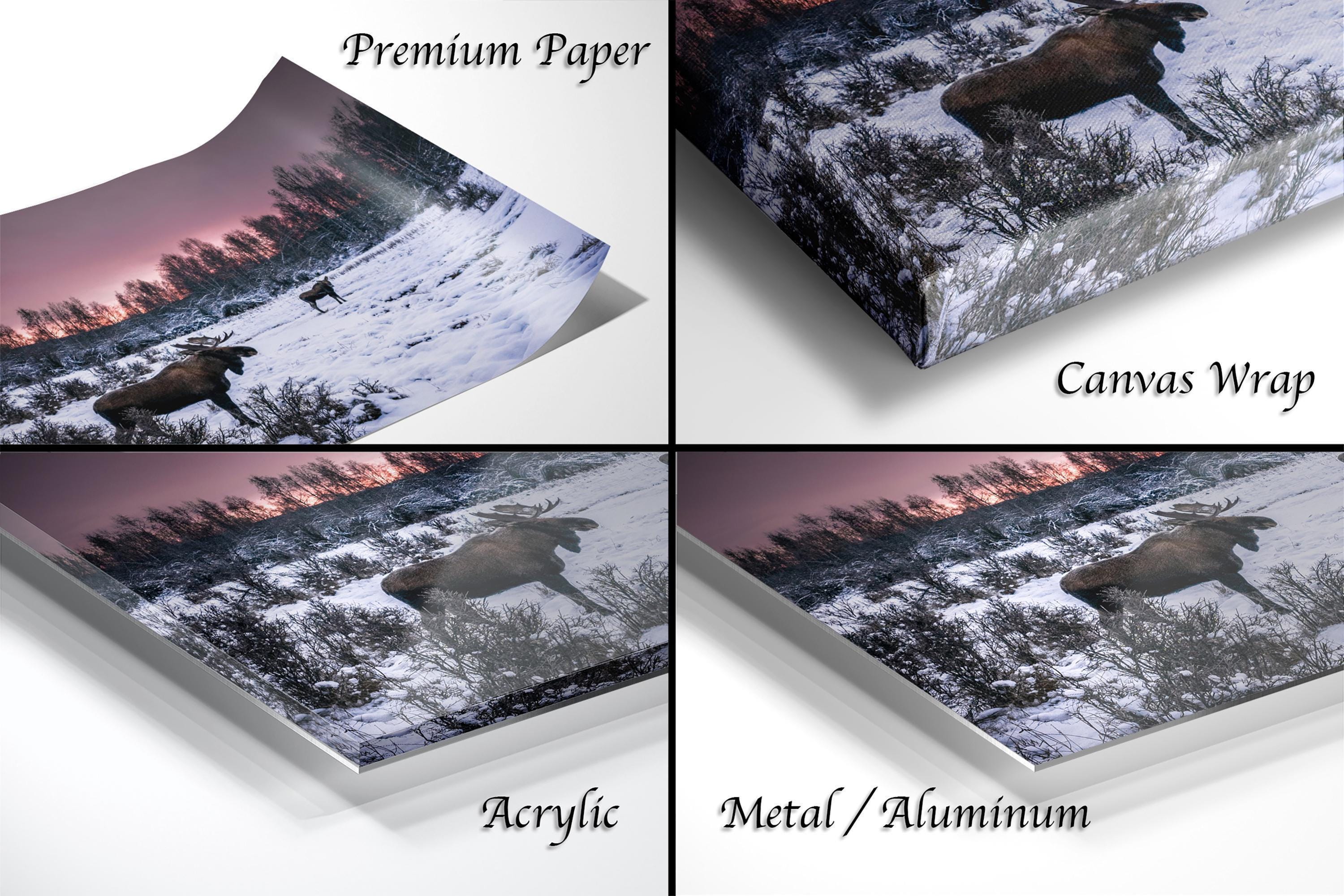 Step into the wild with this stunning snowy mountain print that brings the tranquil Alaskan landscape right into your home. Featuring the impressive moose antlers art, this piece highlights the majesty of one of nature's most iconic animals.