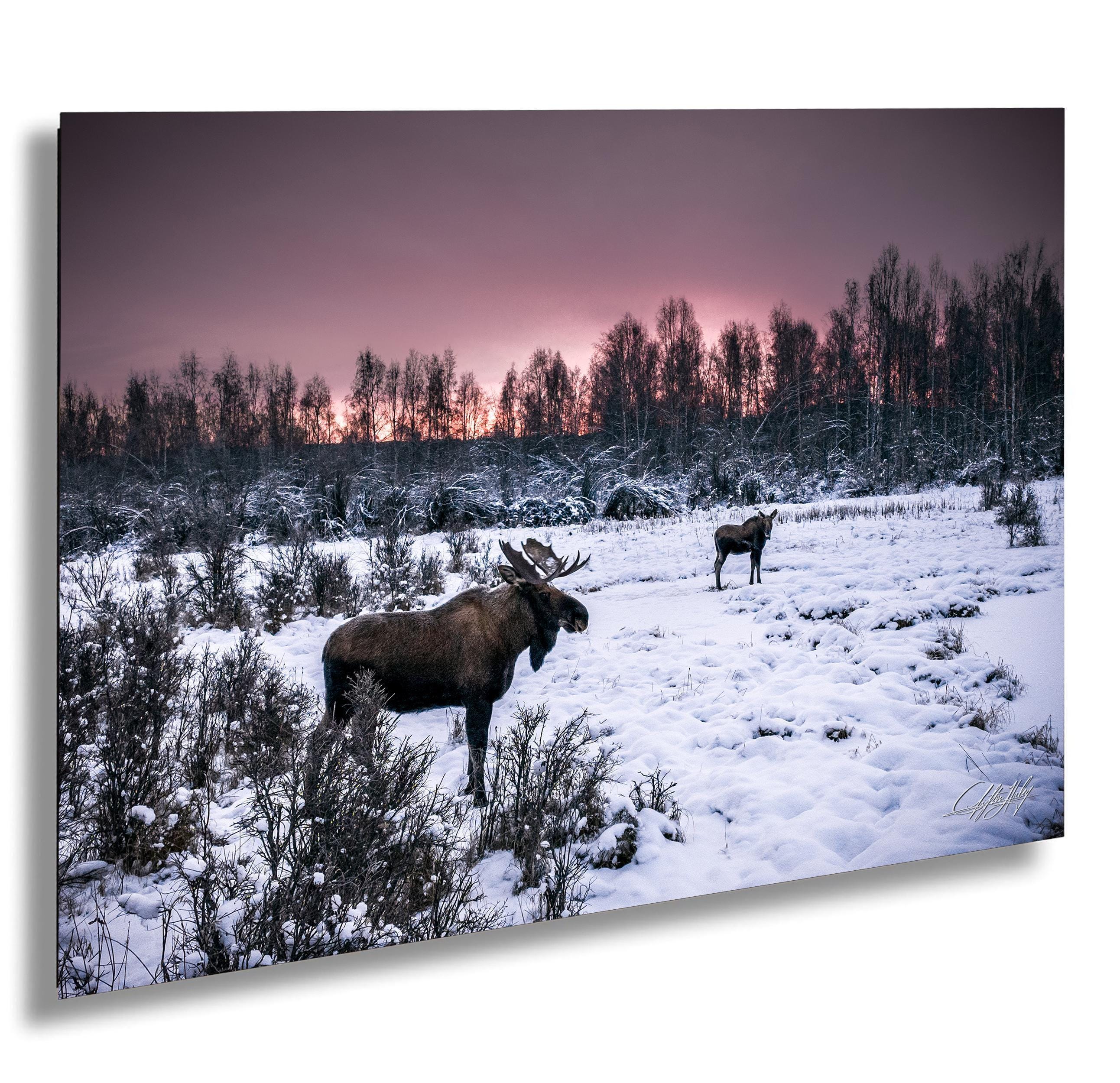 Experience the serene beauty of an Alaskan bull moose at sunrise, captured in this majestic wildlife art perfect for rustic lodge decor and nature wall hanging lovers.