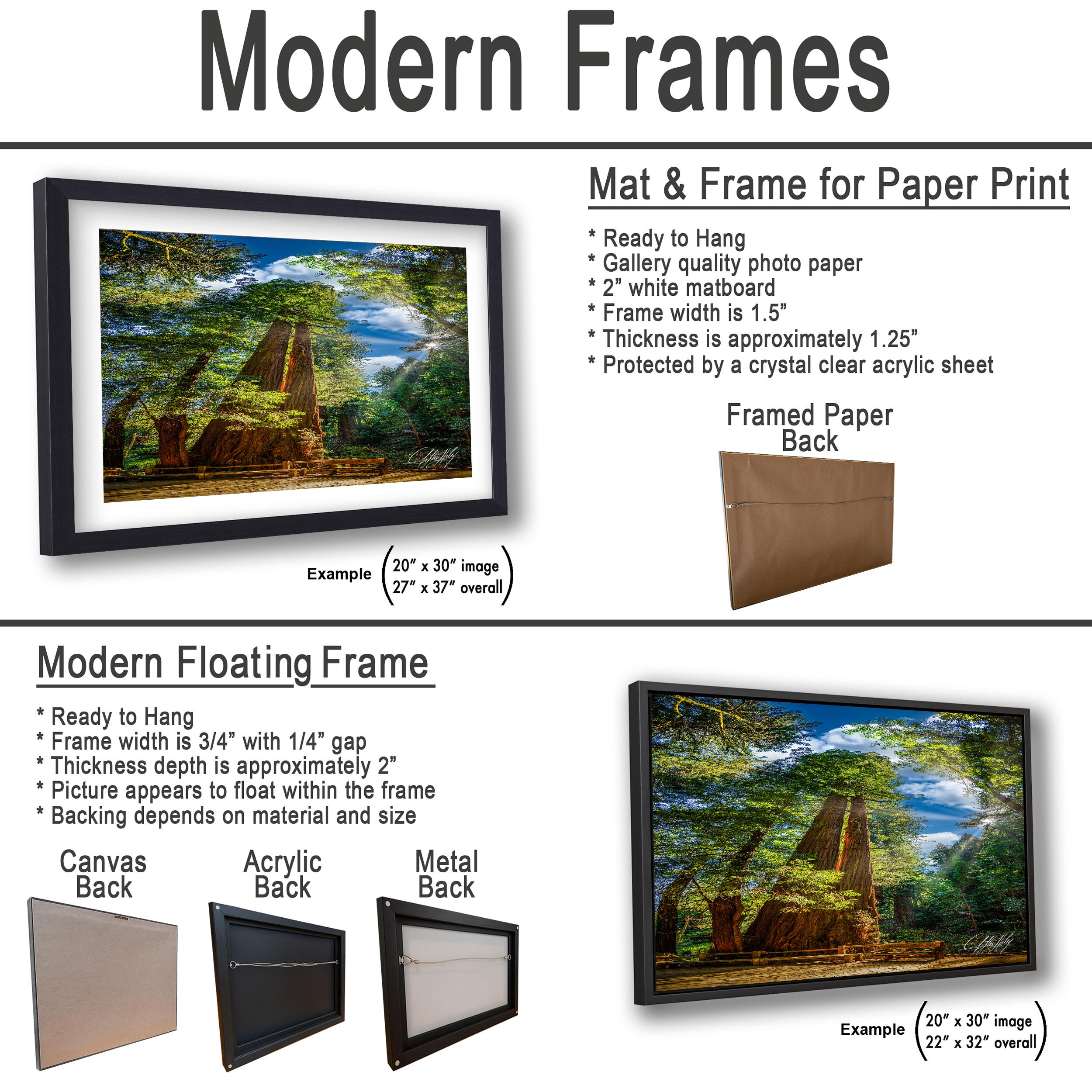3.1) Only framed paper prints, acrylics and aluminum/metal prints will have a 2" white mat border. 3.2) Canvas prints will be a flush mounted (no mat border) to the frame.