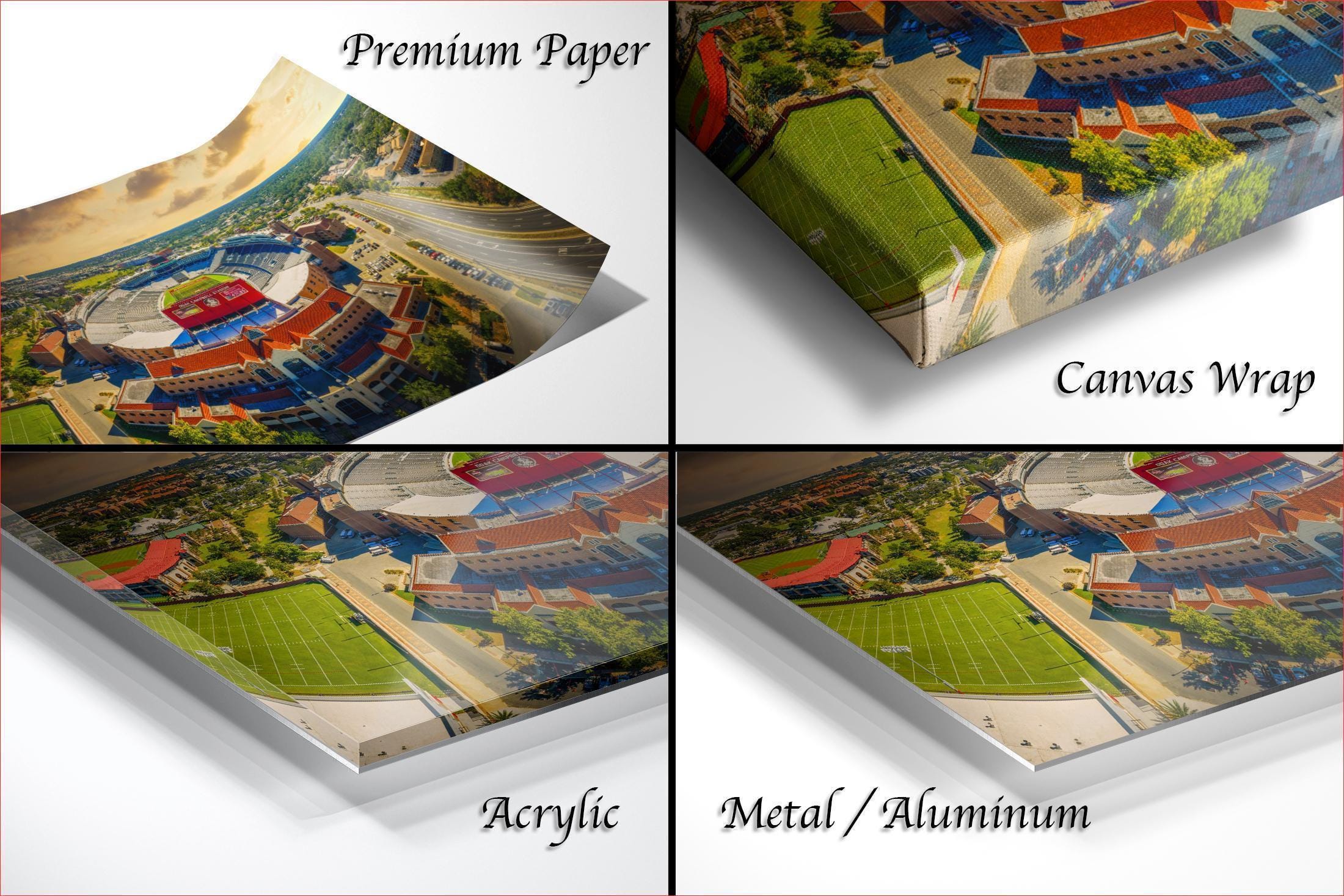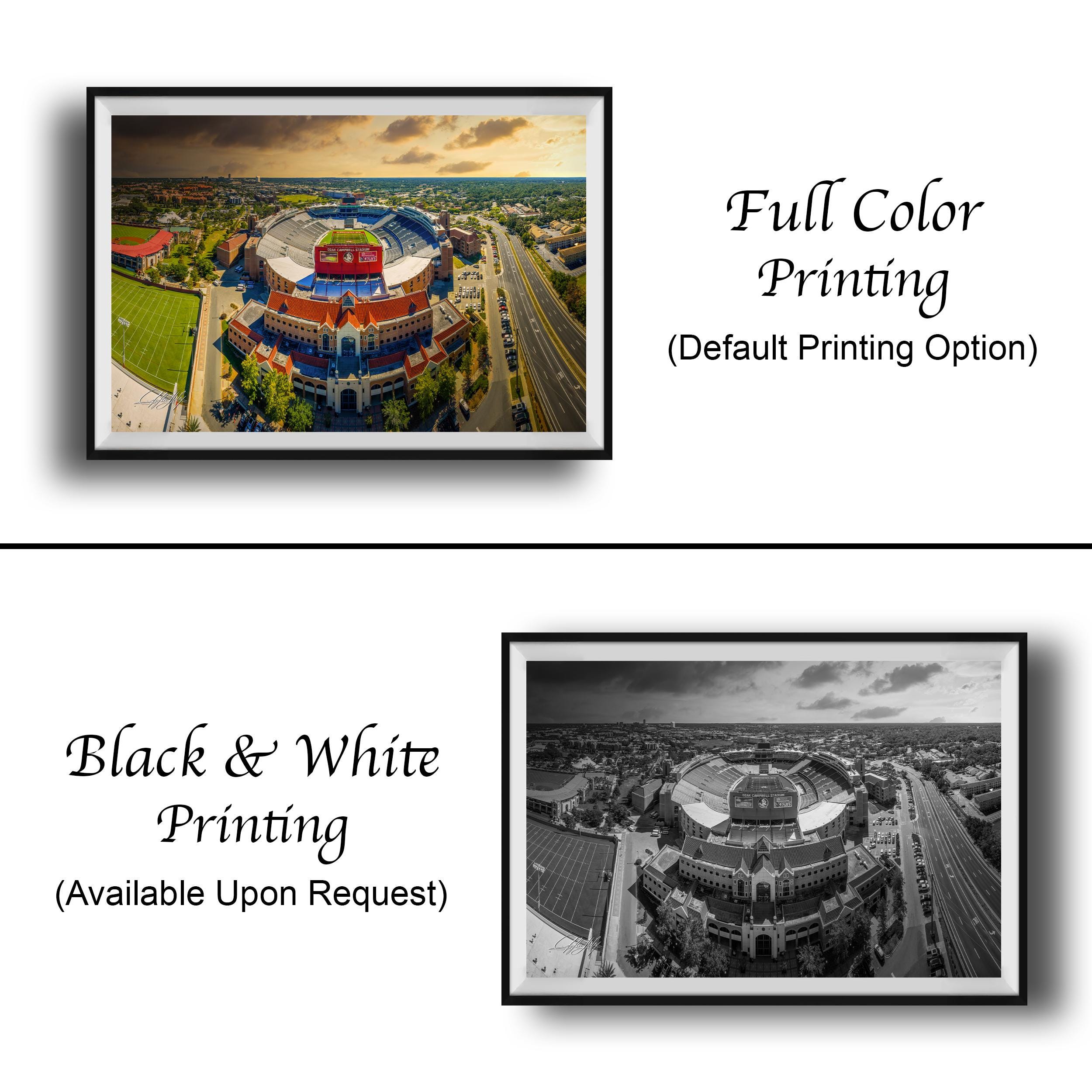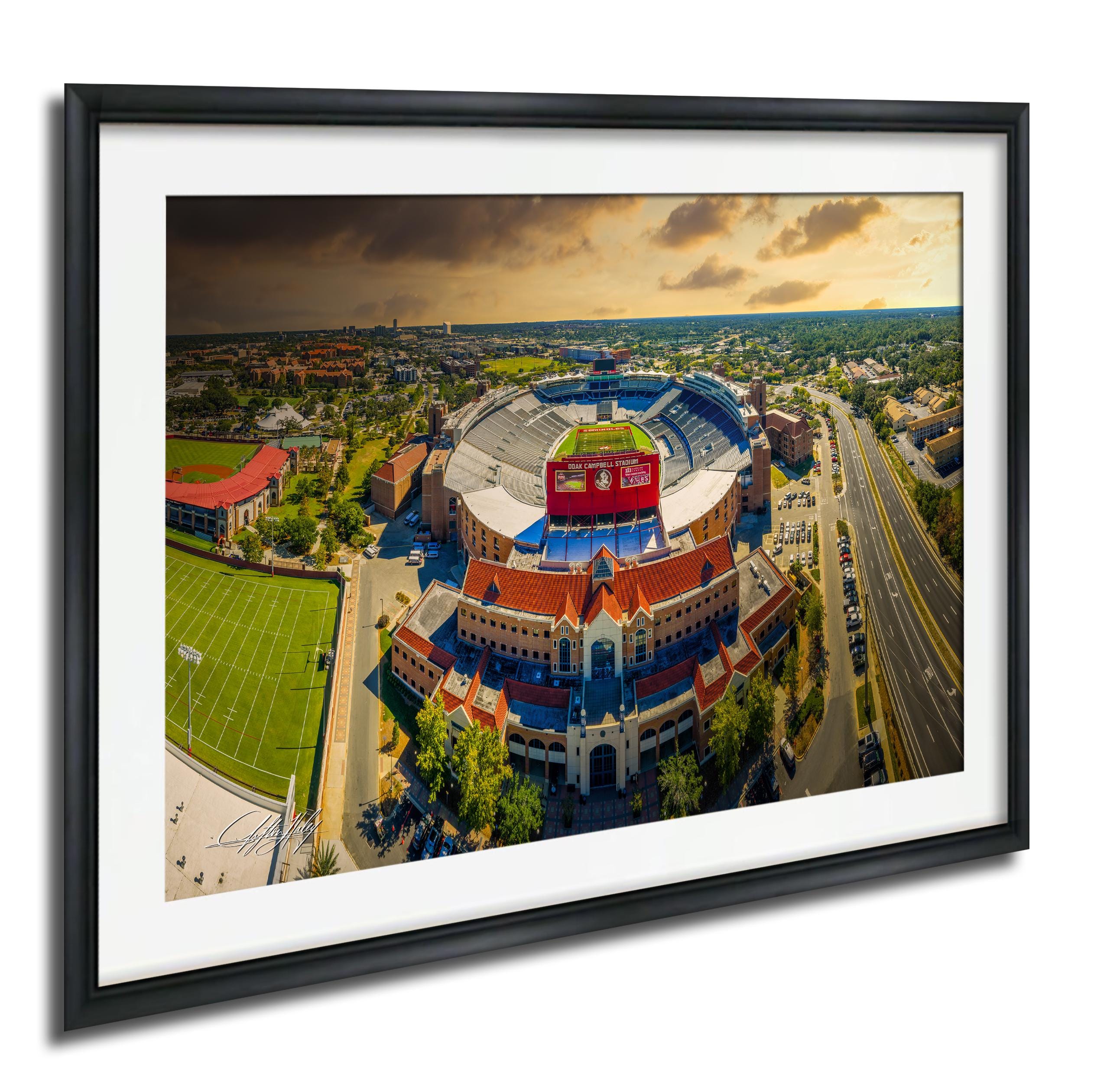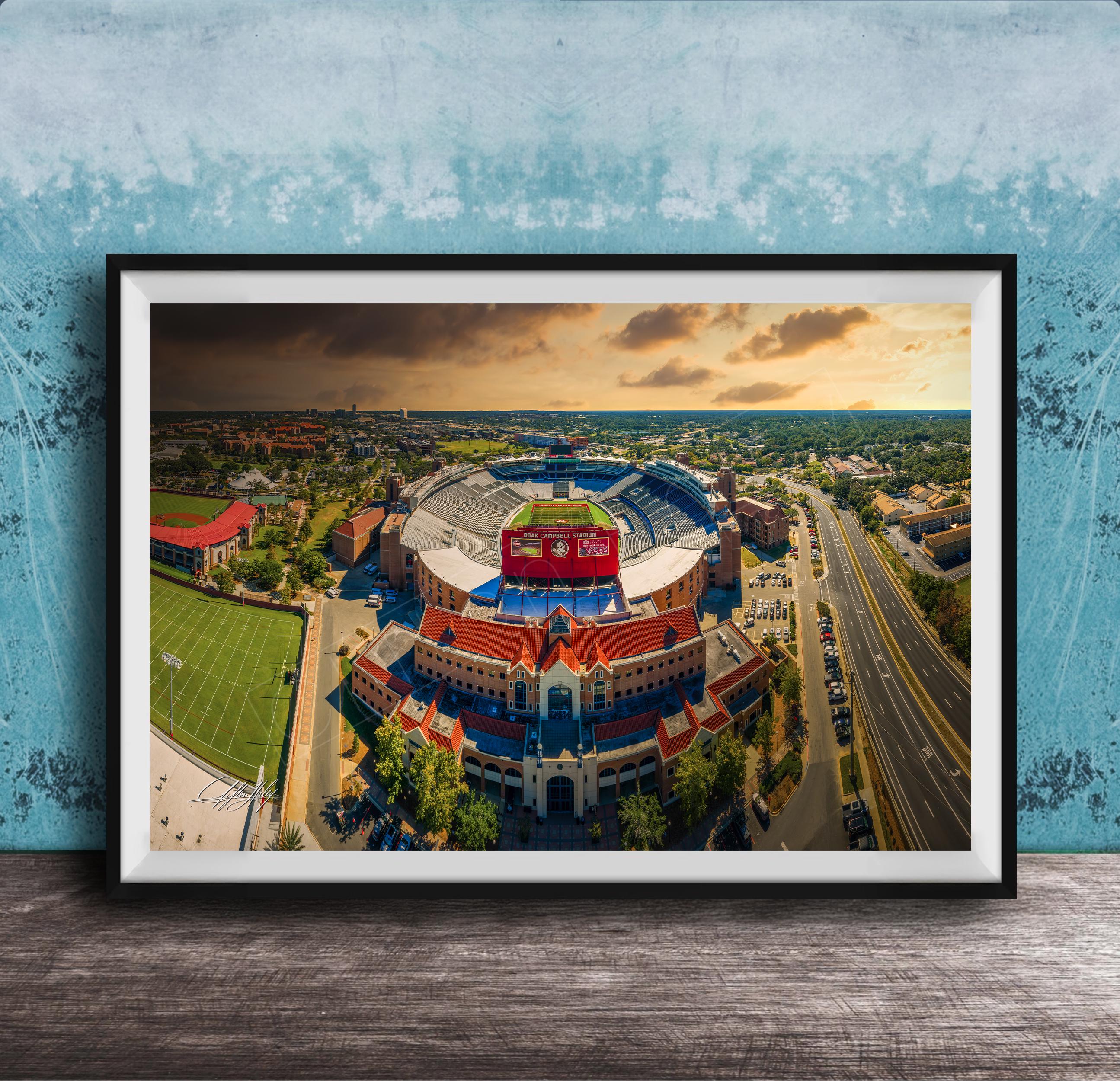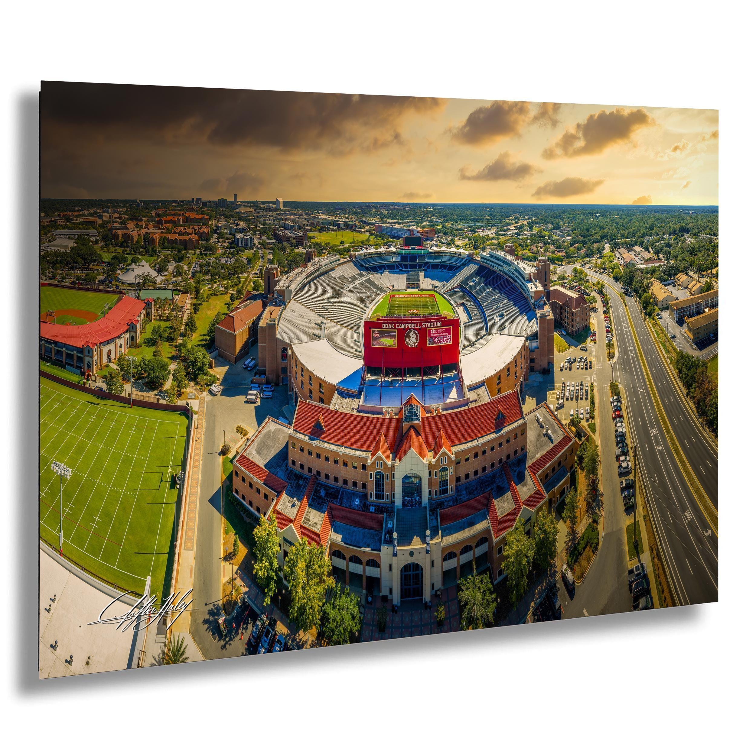 Capturing the essence of Florida State pride, this fine art photograph of Doak Campbell Stadium at sunset brings home the spirit of the Seminoles. The golden light bathing the iconic stadium creates a breathtaking scene that embodies the heart of Tallahassee and the legacy of Fear the Spear. Perfect for fans seeking Seminoles wall decor that celebrates tradition and passion.