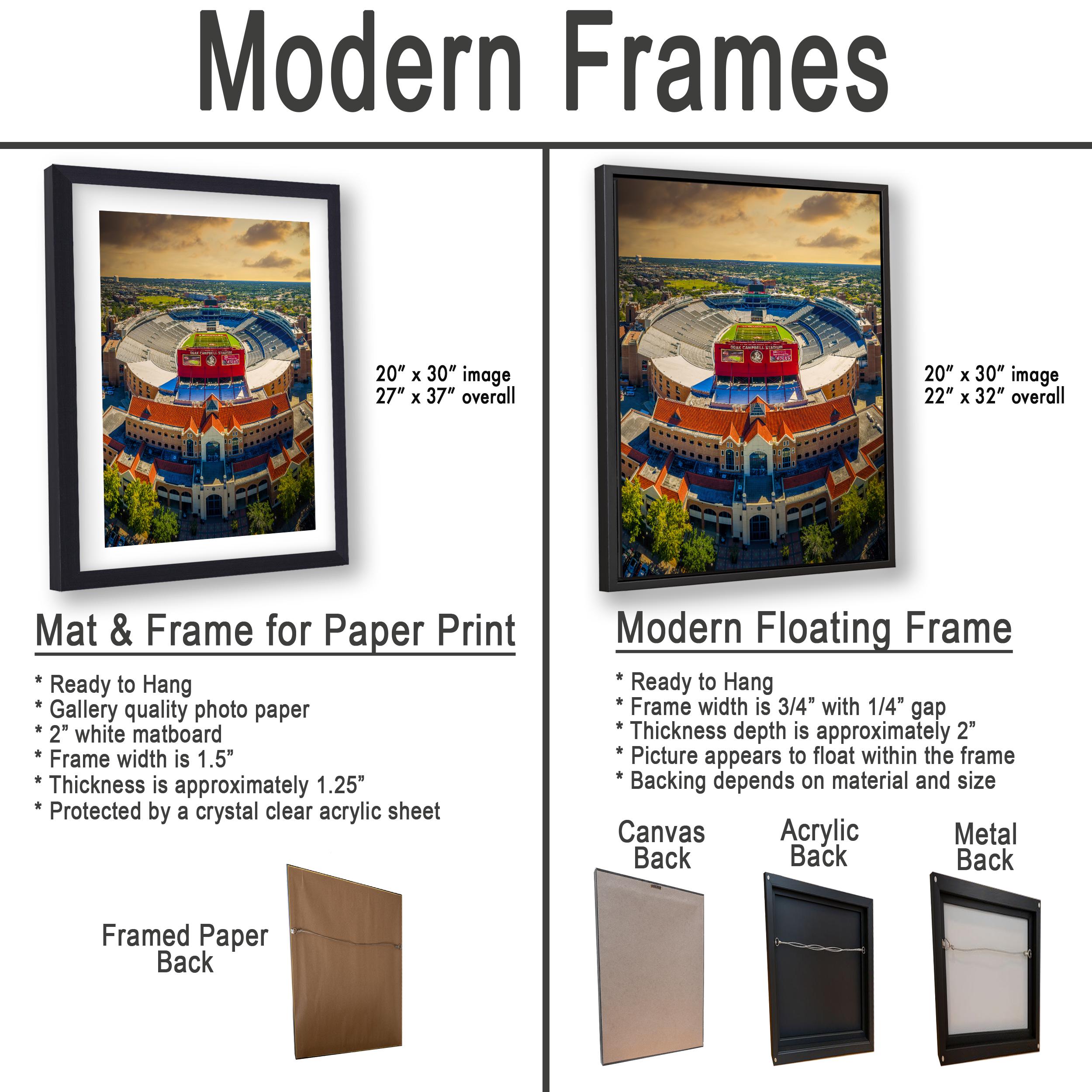 3.1) Only framed paper prints, acrylics and aluminum/metal prints will have a 2" white mat border. 3.2) Canvas prints will be a flush mounted (no mat border) to the frame.