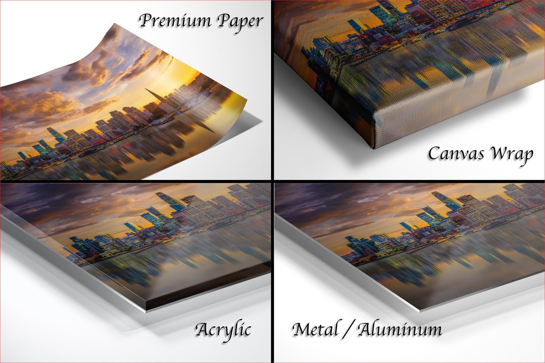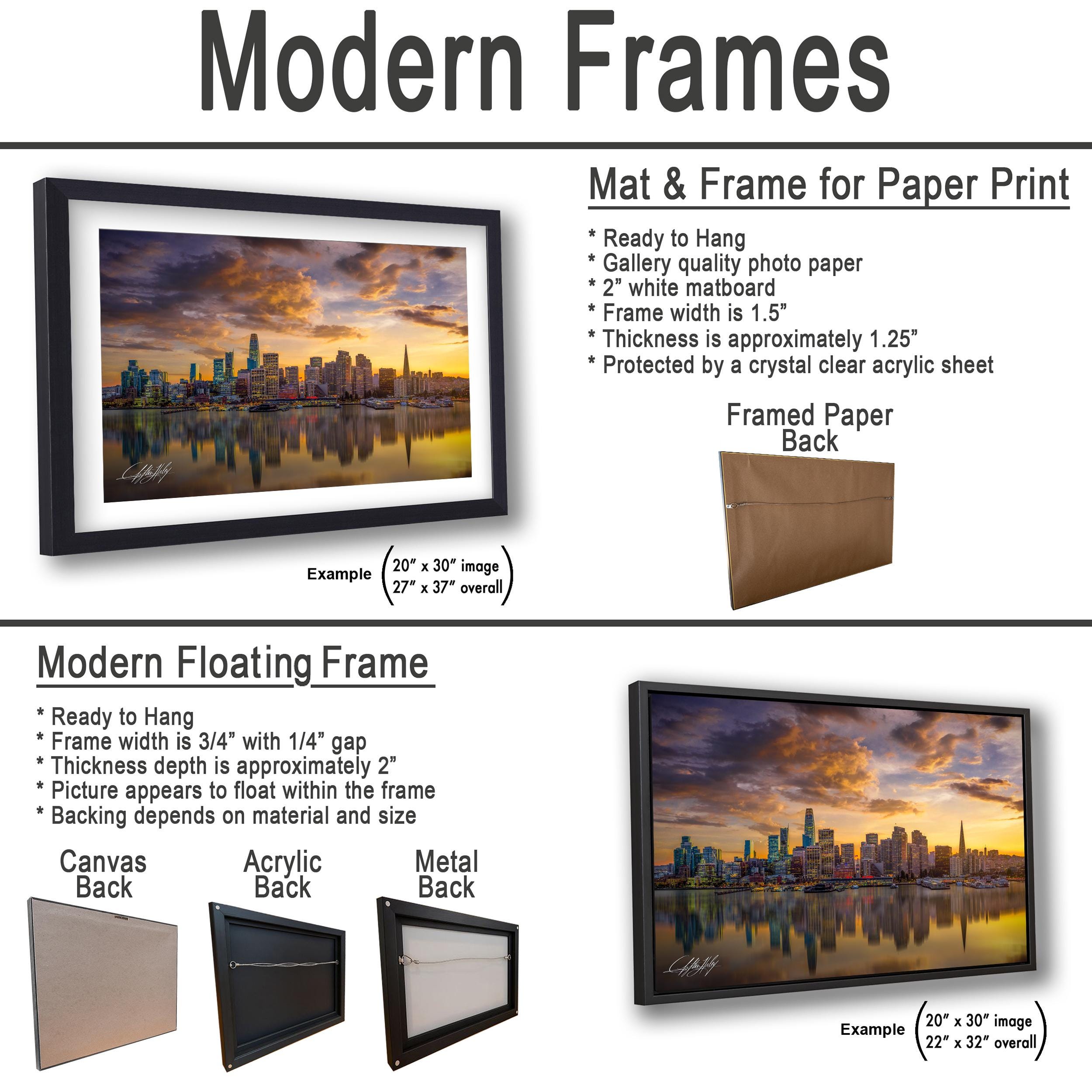 3.1) Only framed paper prints, acrylics and aluminum/metal prints will have a 2" white mat border. 3.2) Canvas prints will be a flush mounted (no mat border) to the frame.