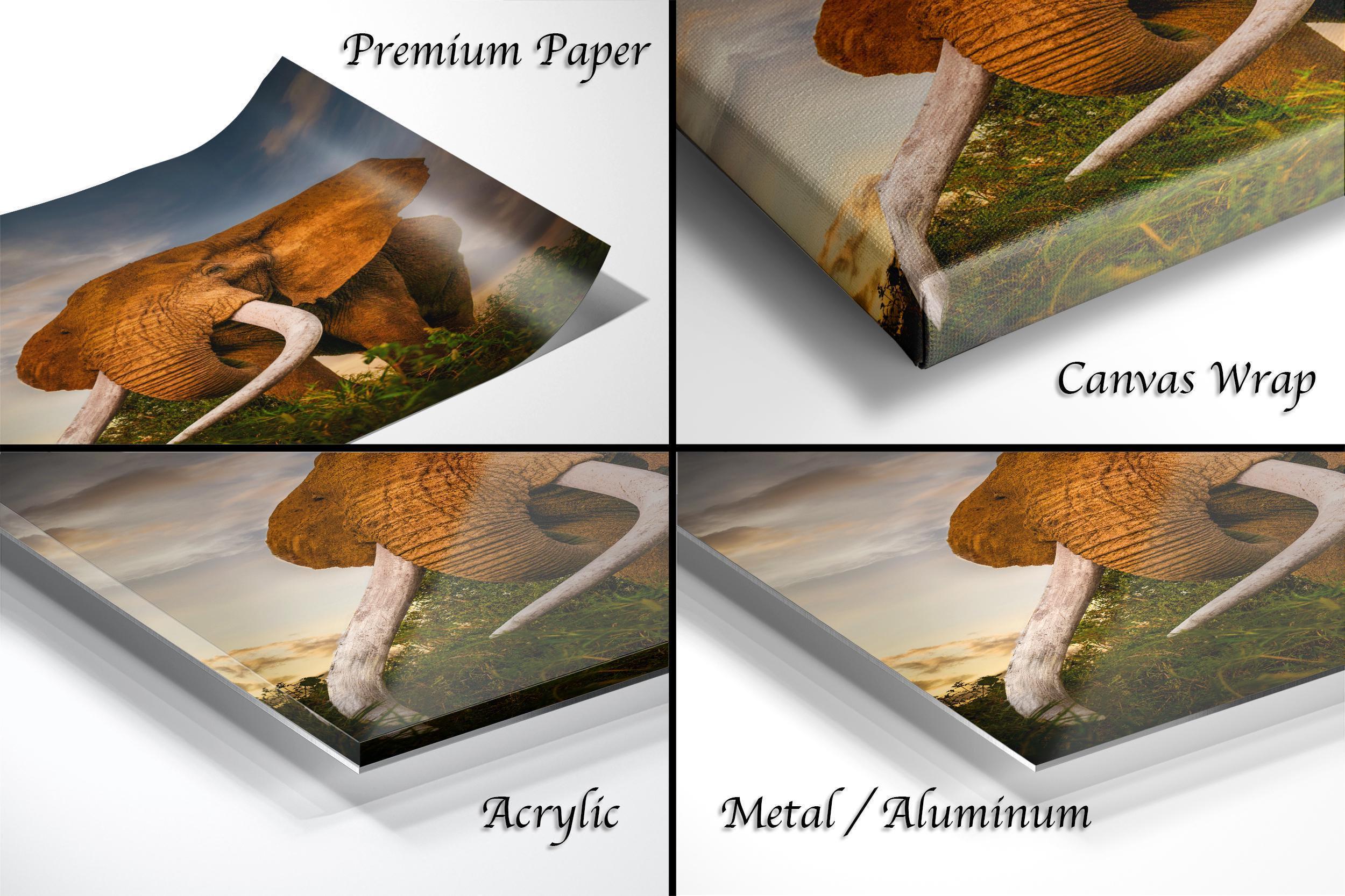 • Hand-signed artwork authenticates every print, adding value and a personal connection to the artist’s vision. • Available as framed paper prints, acrylics, aluminum/metal prints with a 2" white mat border, or canvas prints with a flush-mounted frame for a sleek finish. • Dimensions and customization options are available upon request to perfectly suit your space. • This large animal canvas portrays Craig, a rare big tusker elephant with tusks over 45 kilograms each, set against the vibrant Kenyan sunset—a tribute to Amboseli National Park’s iconic wildlife.