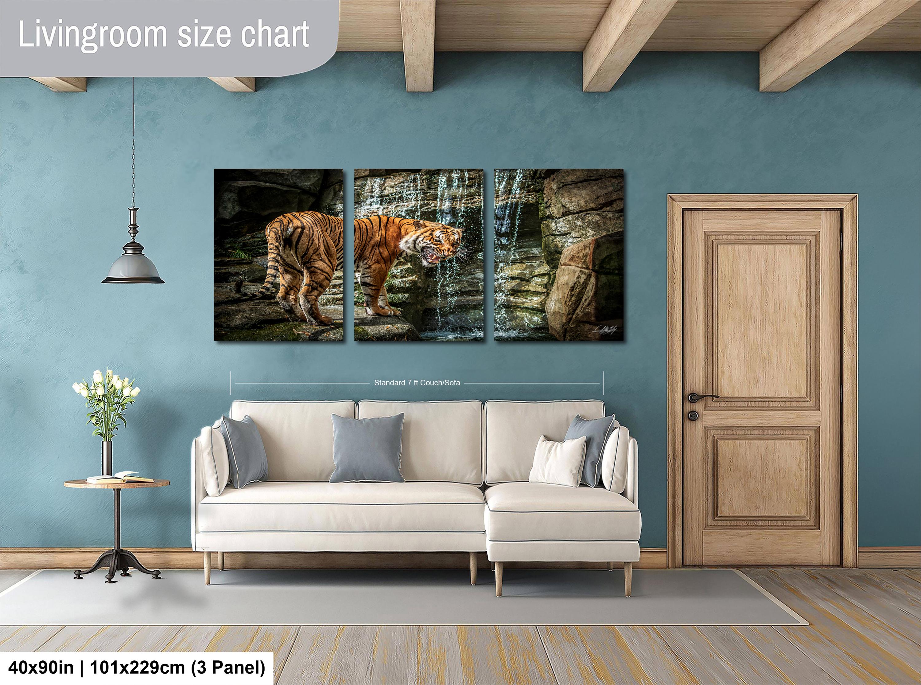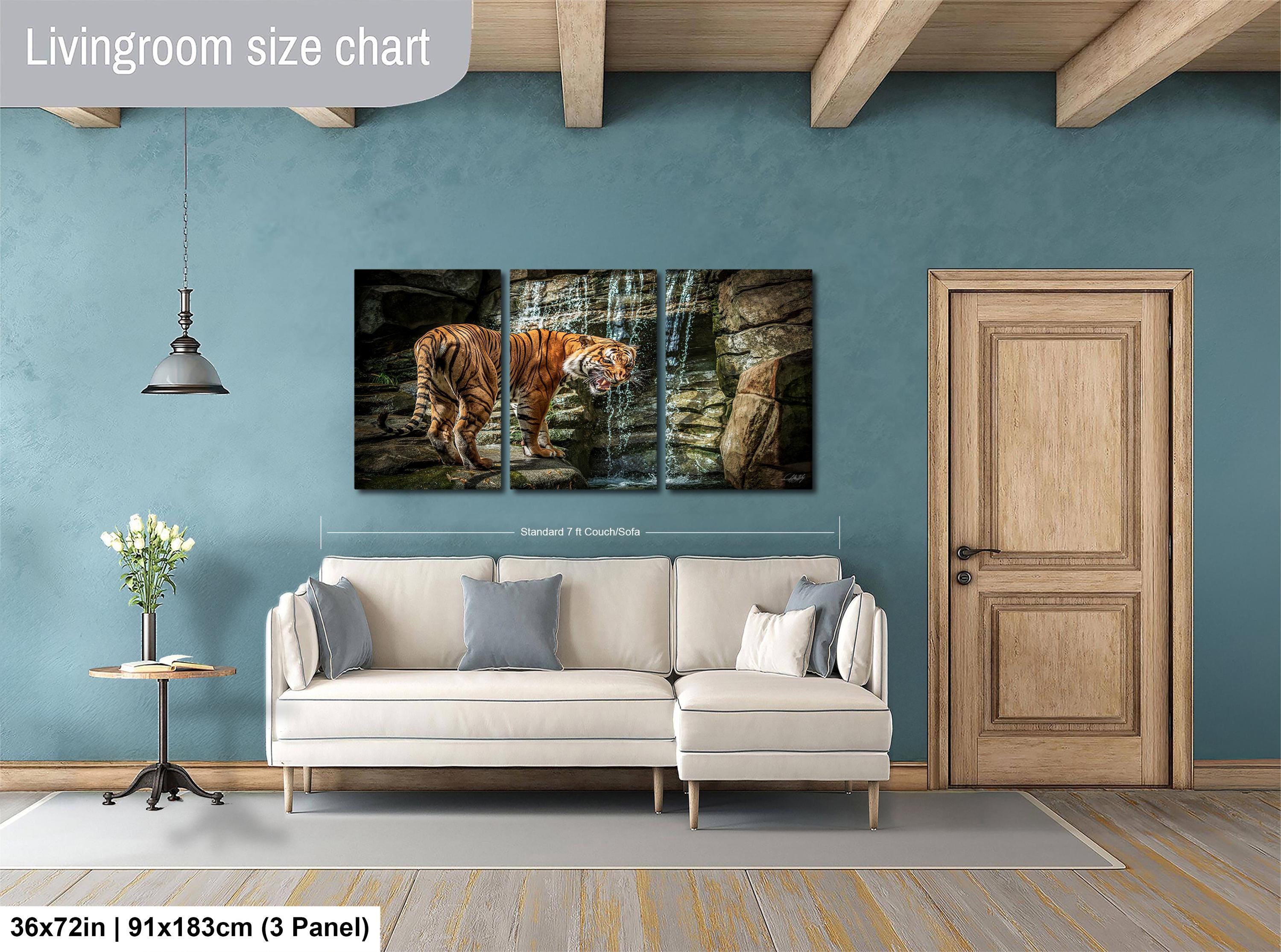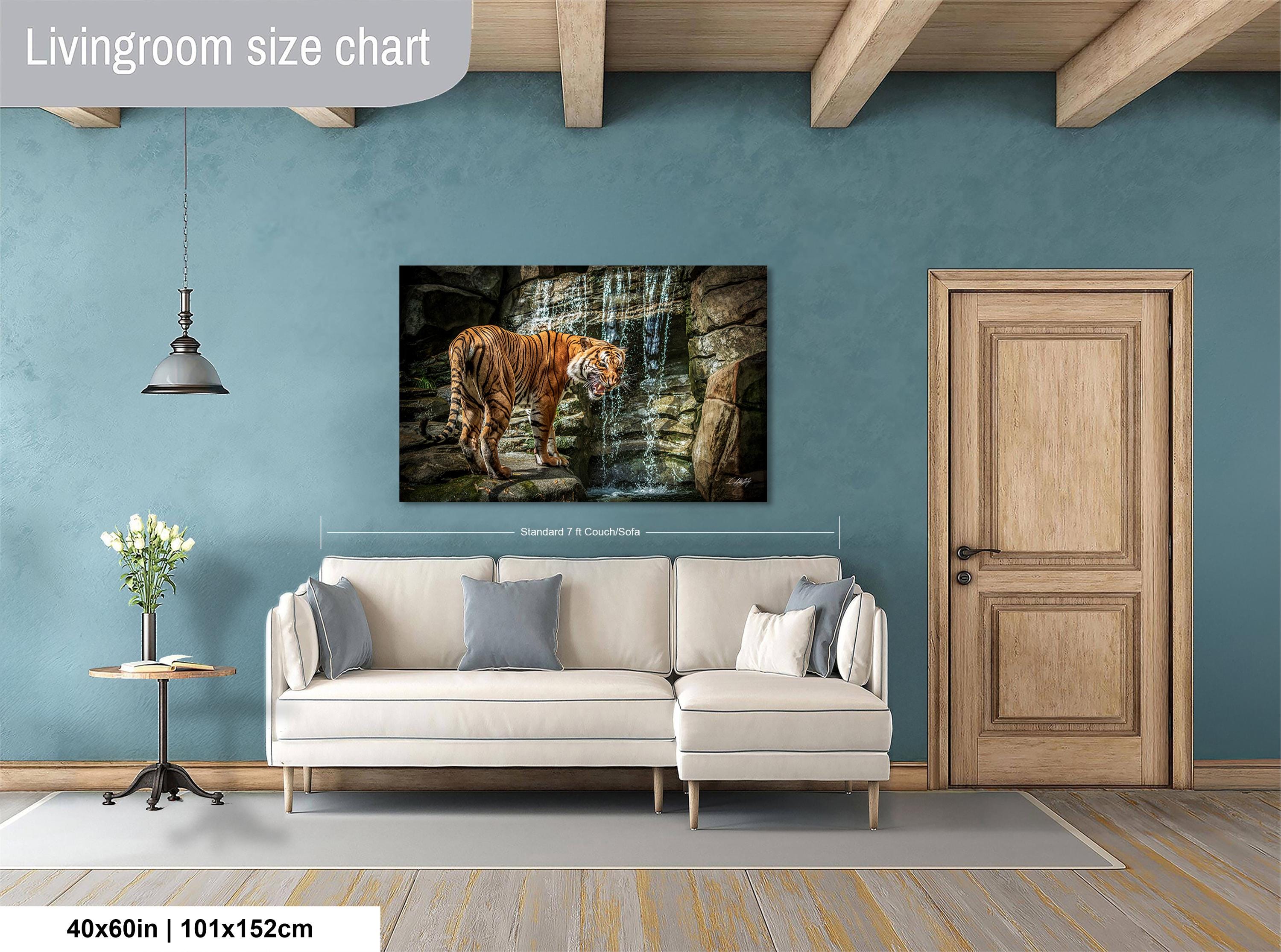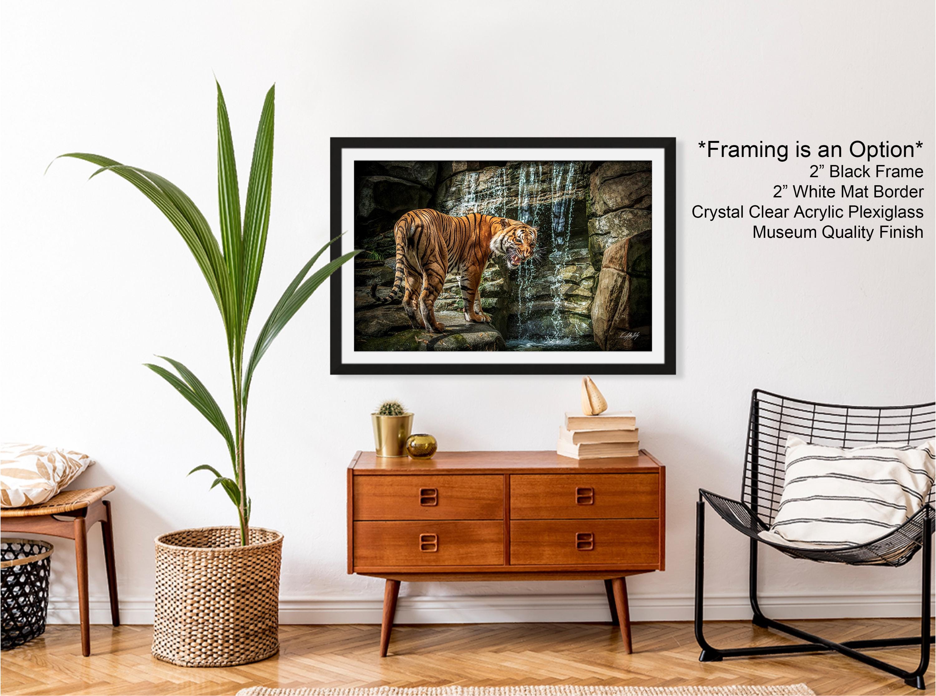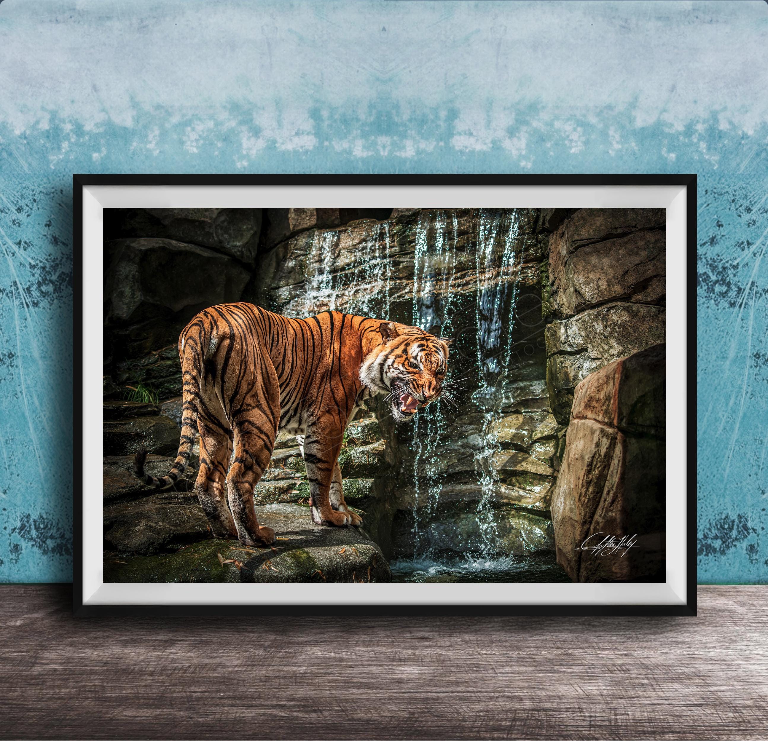 Immerse yourself in the vibrant world of the Sumatran jungle with this captivating tiger wall art, where the striking orange striped tiger emerges amidst lush tropical foliage and a serene waterfall. This fine art animal print draws inspiration from Indonesia's rich natural landscapes, perfectly blending boho tropical decor with a touch of wild elegance. Ideal for nature lovers and anyone seeking a unique handmade wall decor piece that tells a story of adventure and respect for majestic wildlife.