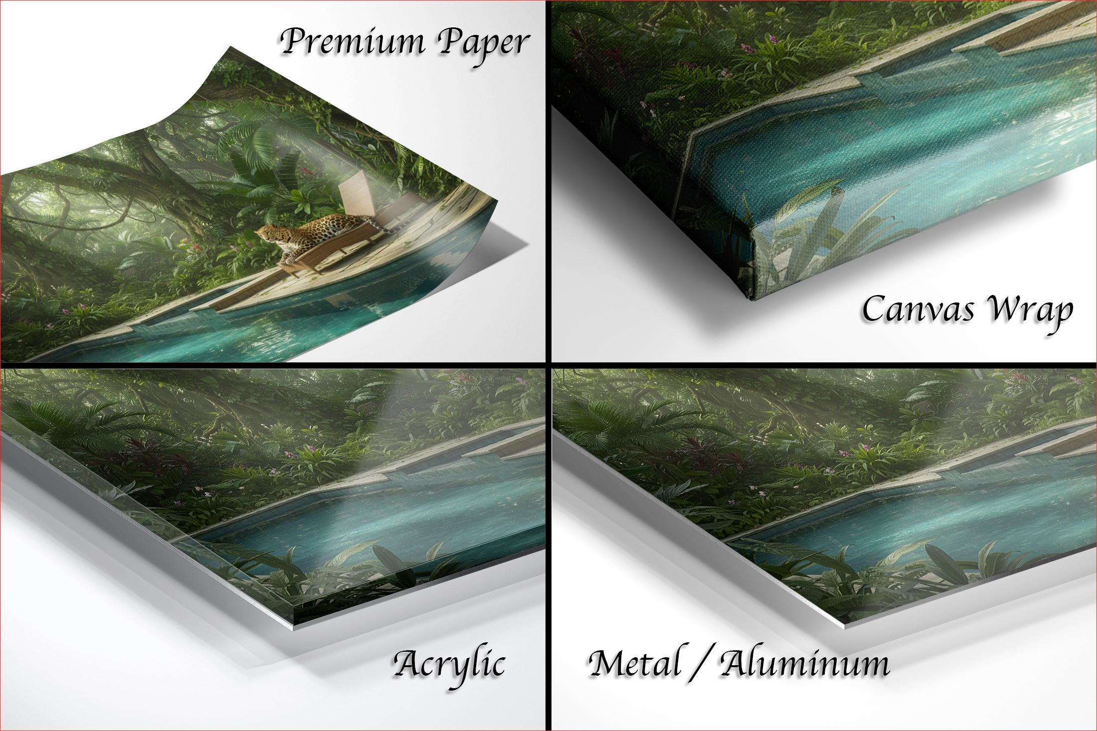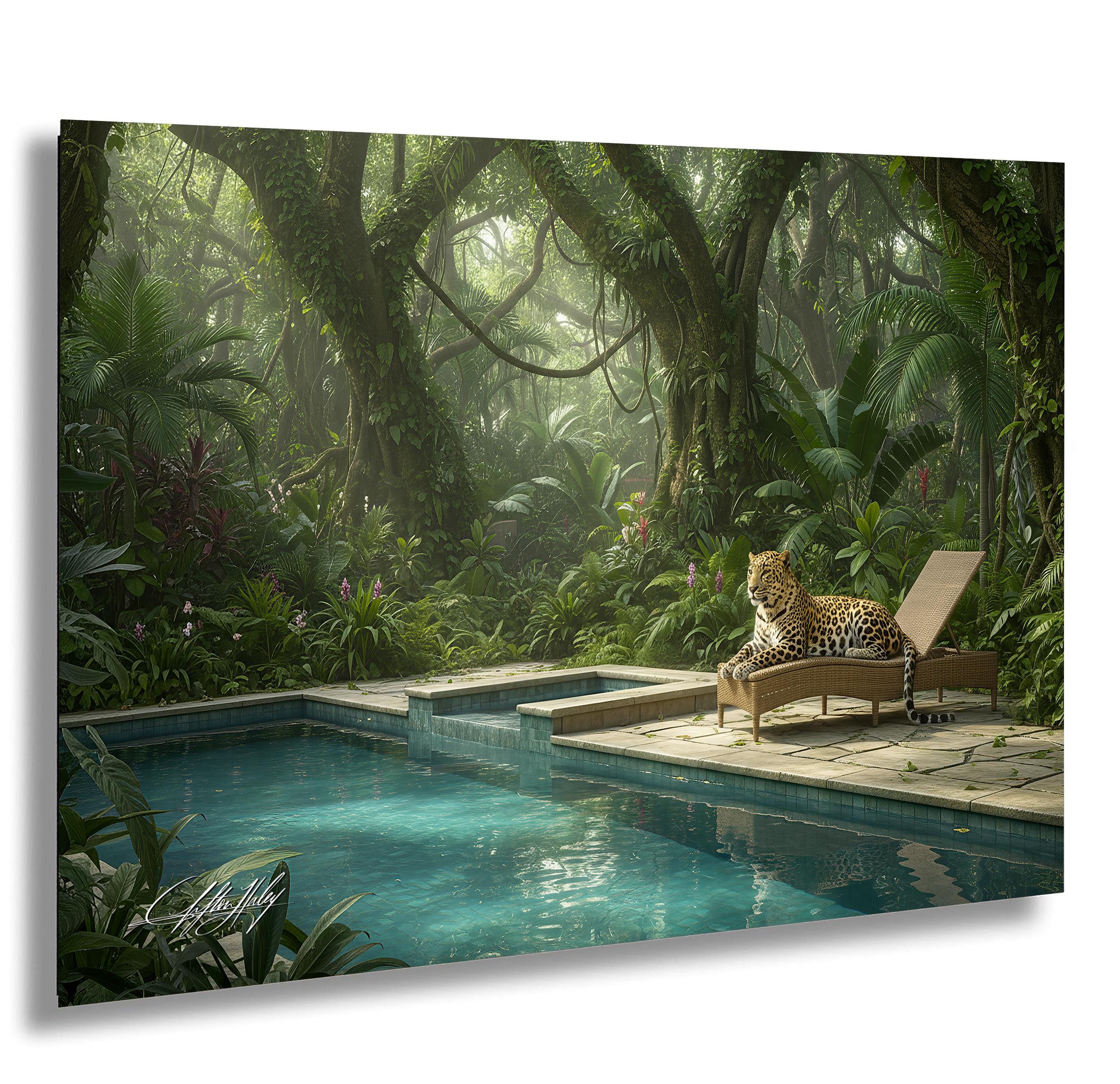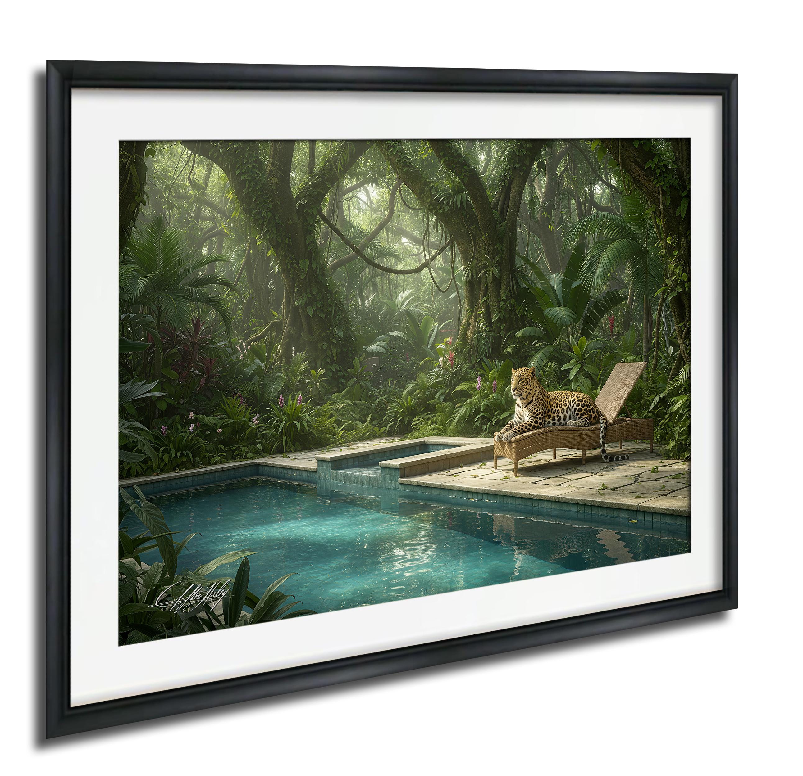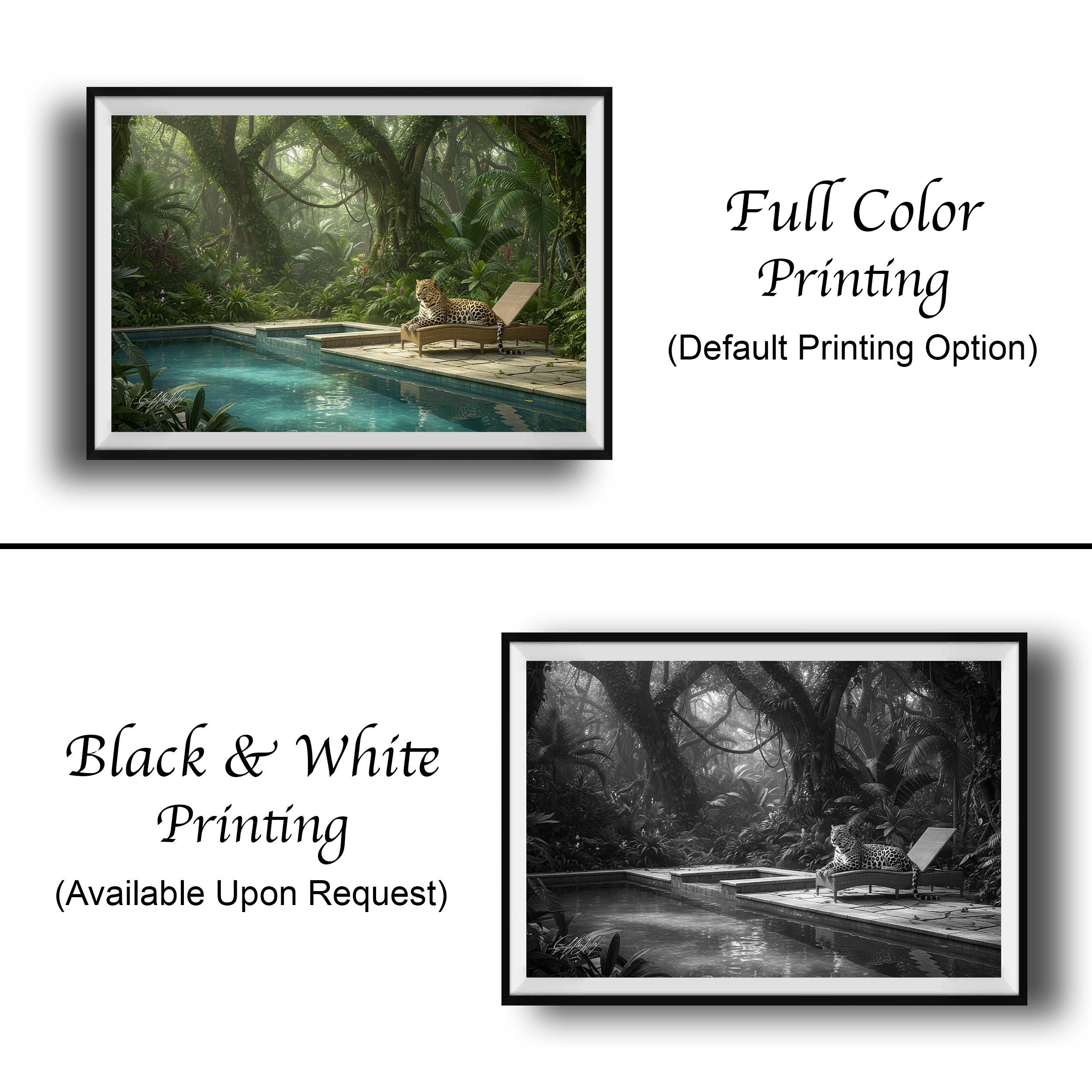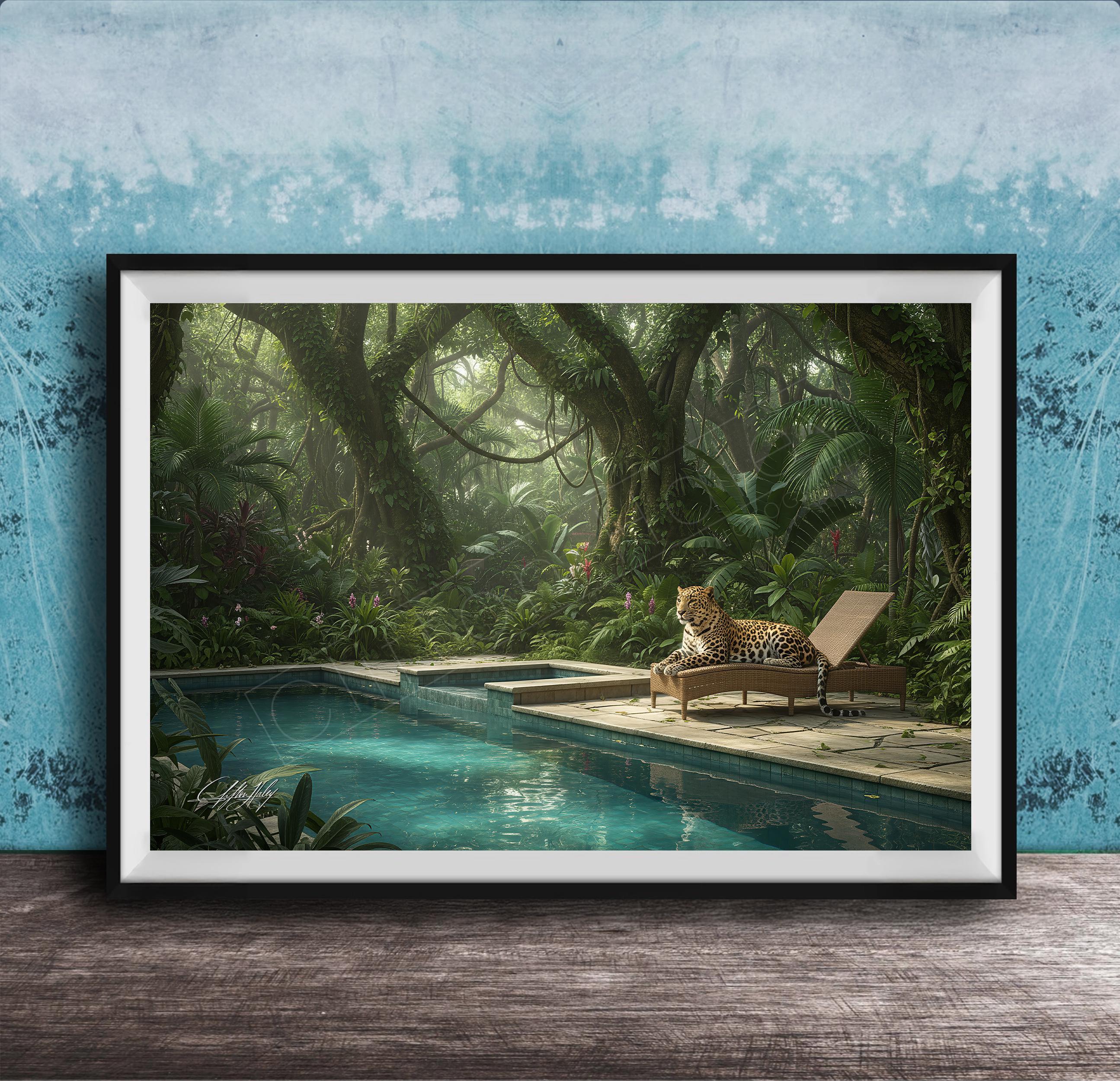 Step into a tranquil jungle forest scene with this captivating leopard at swimming pool AI wall art, designed to bring a touch of wild elegance to your living room art or nursery wall decor. This artist signed print blends vibrant green forest elements with a whimsical portrayal of African wildlife art, creating a unique wildlife gift that celebrates nature’s beauty. Each piece is thoughtfully crafted to evoke peaceful charm and inspire a connection with the outdoors.