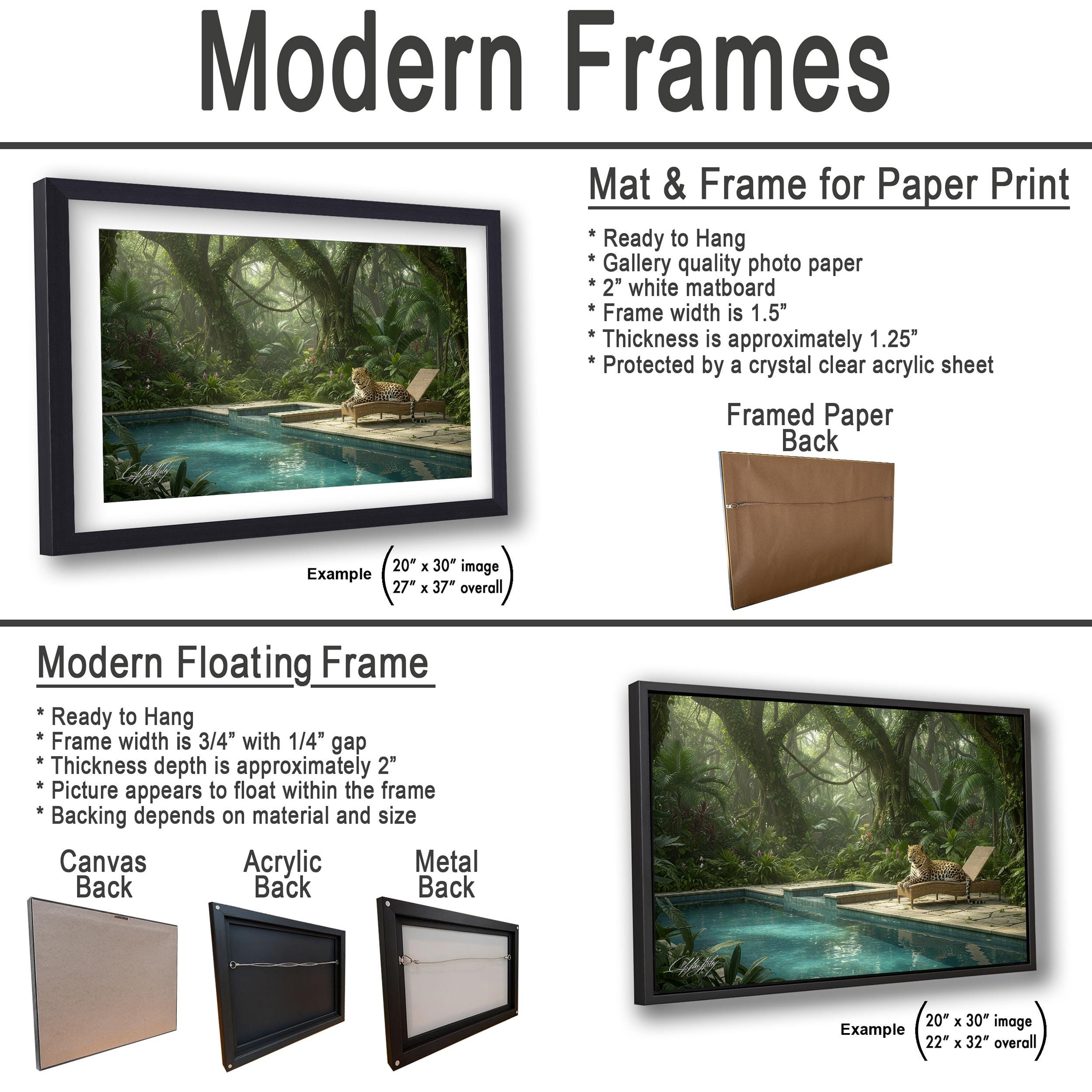 3.1) Only framed paper prints, acrylics and aluminum/metal prints will have a 2” white mat border. 3.2) Canvas prints will be a flush mounted (no mat border) to the frame.