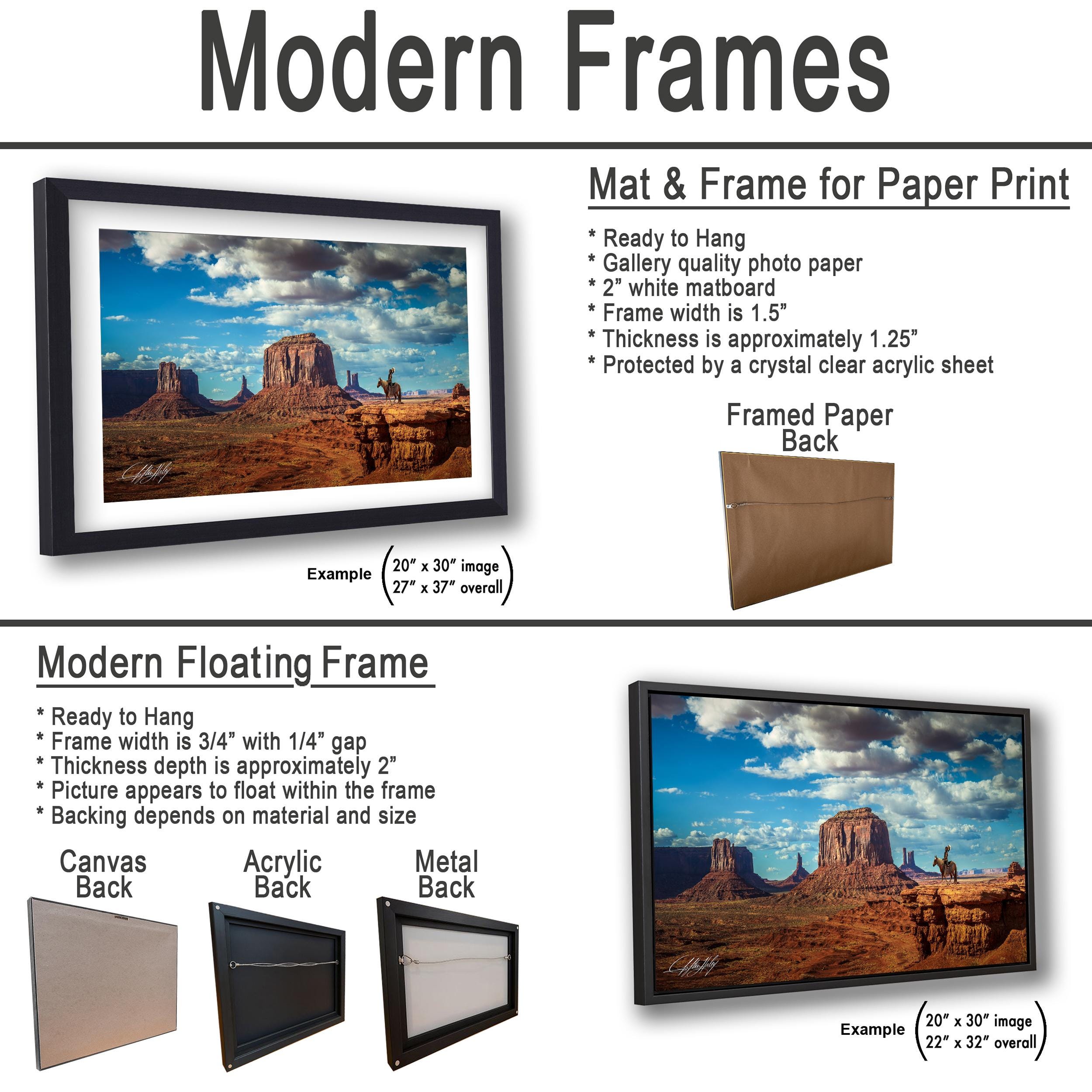 3.2) Canvas, acrylic and metal framed prints will be mounted on a "floating" style frame.