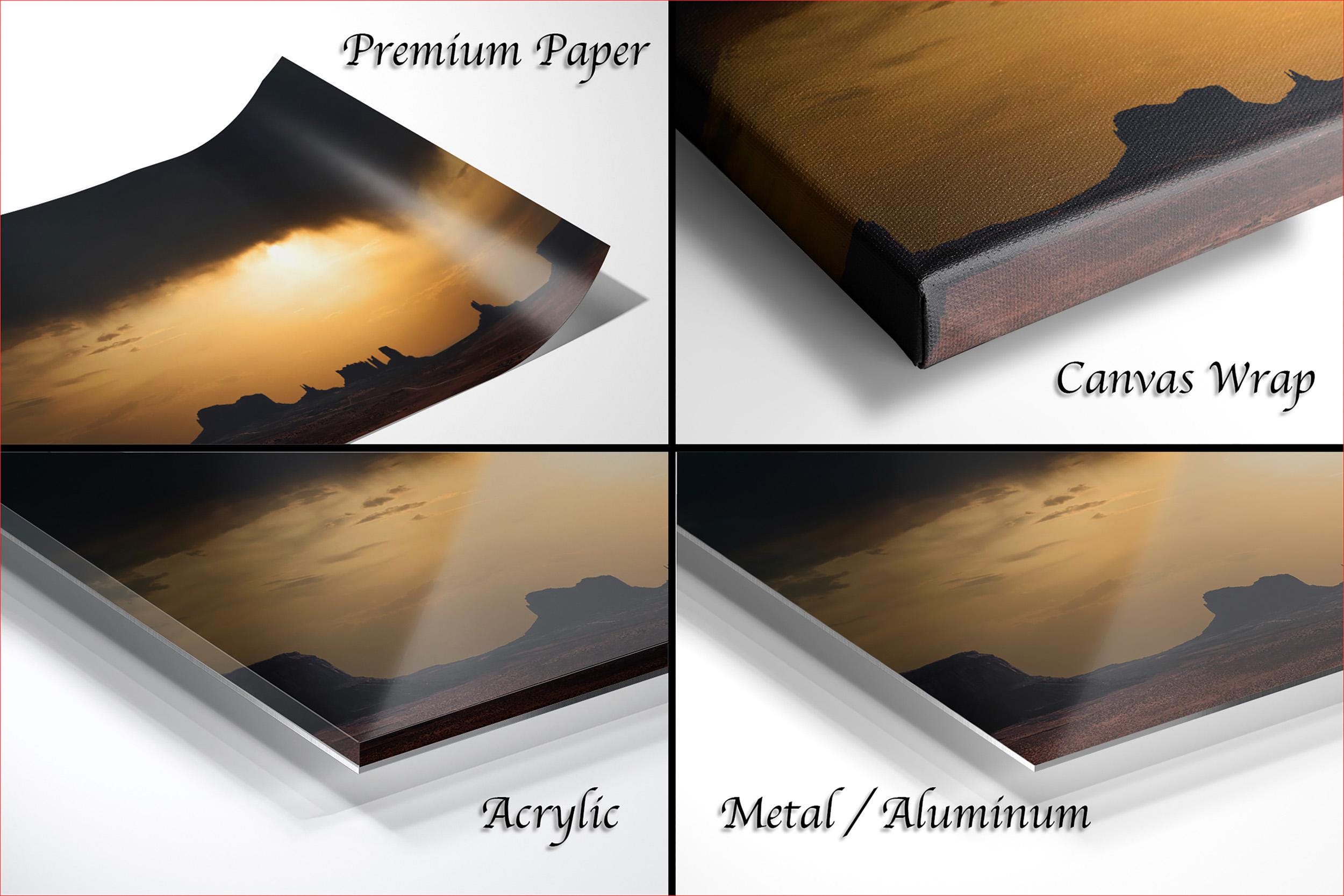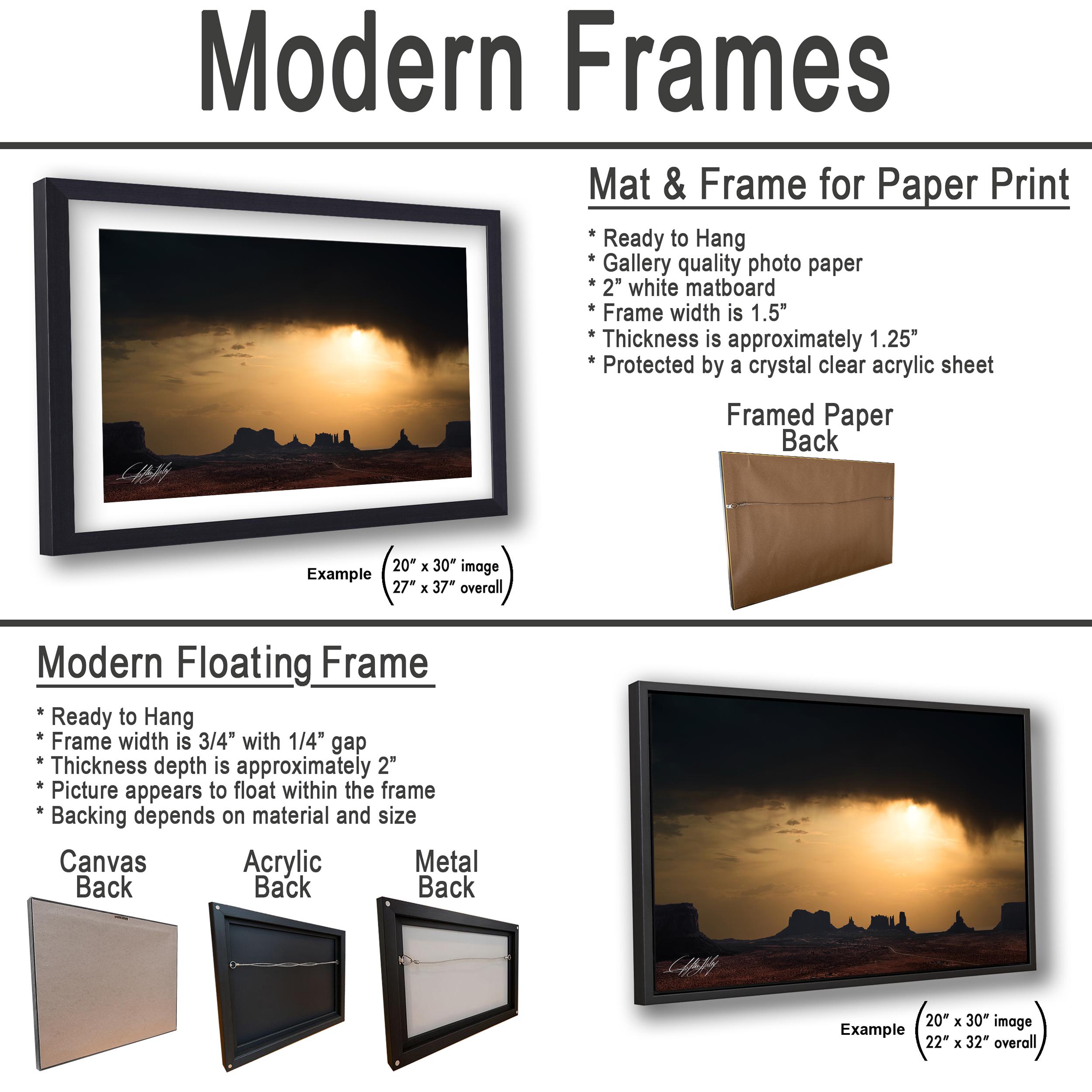 - ✅ Framed paper prints include a 2" white mat border; canvas, acrylic, and metal prints feature a floating style frame