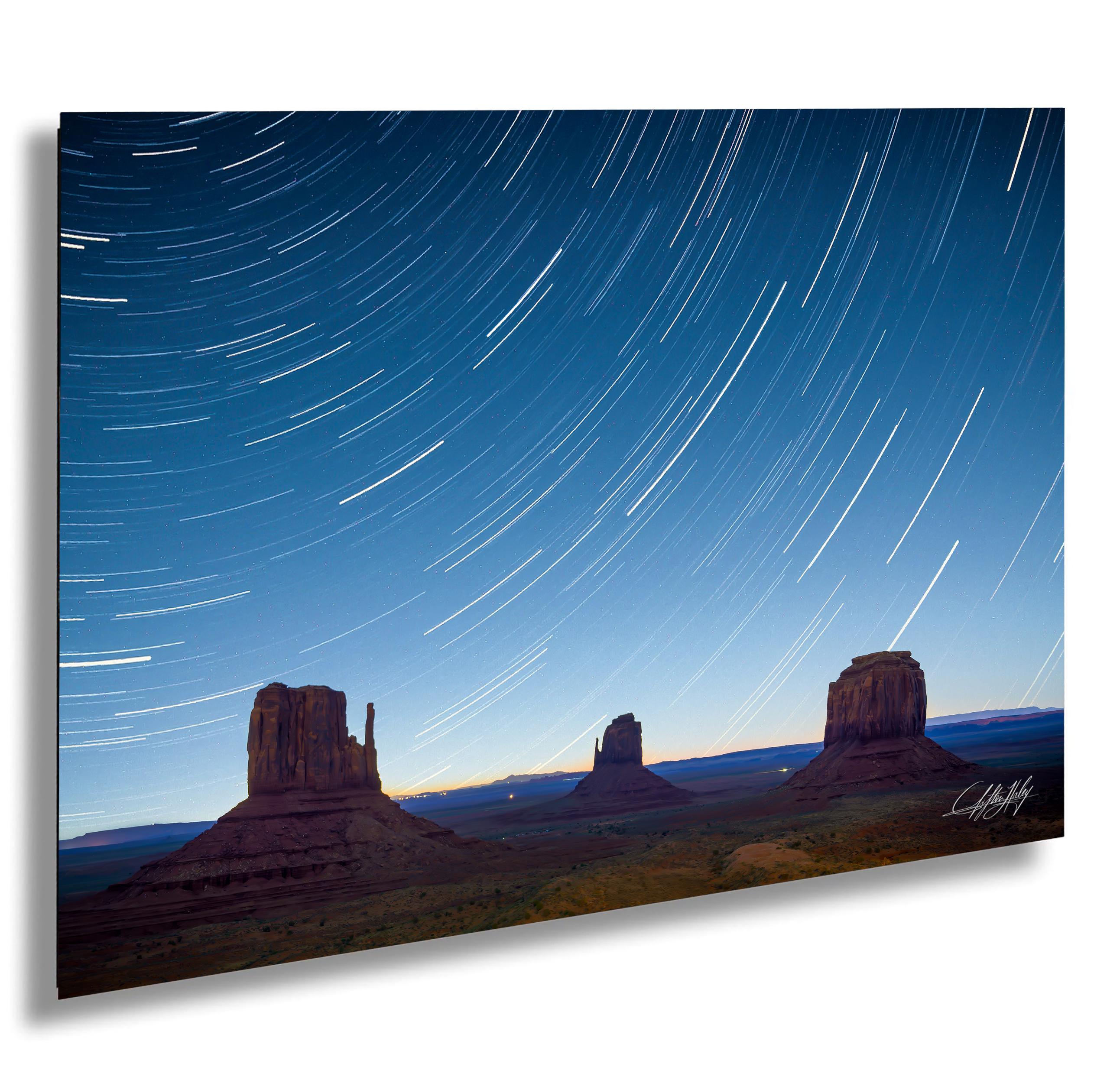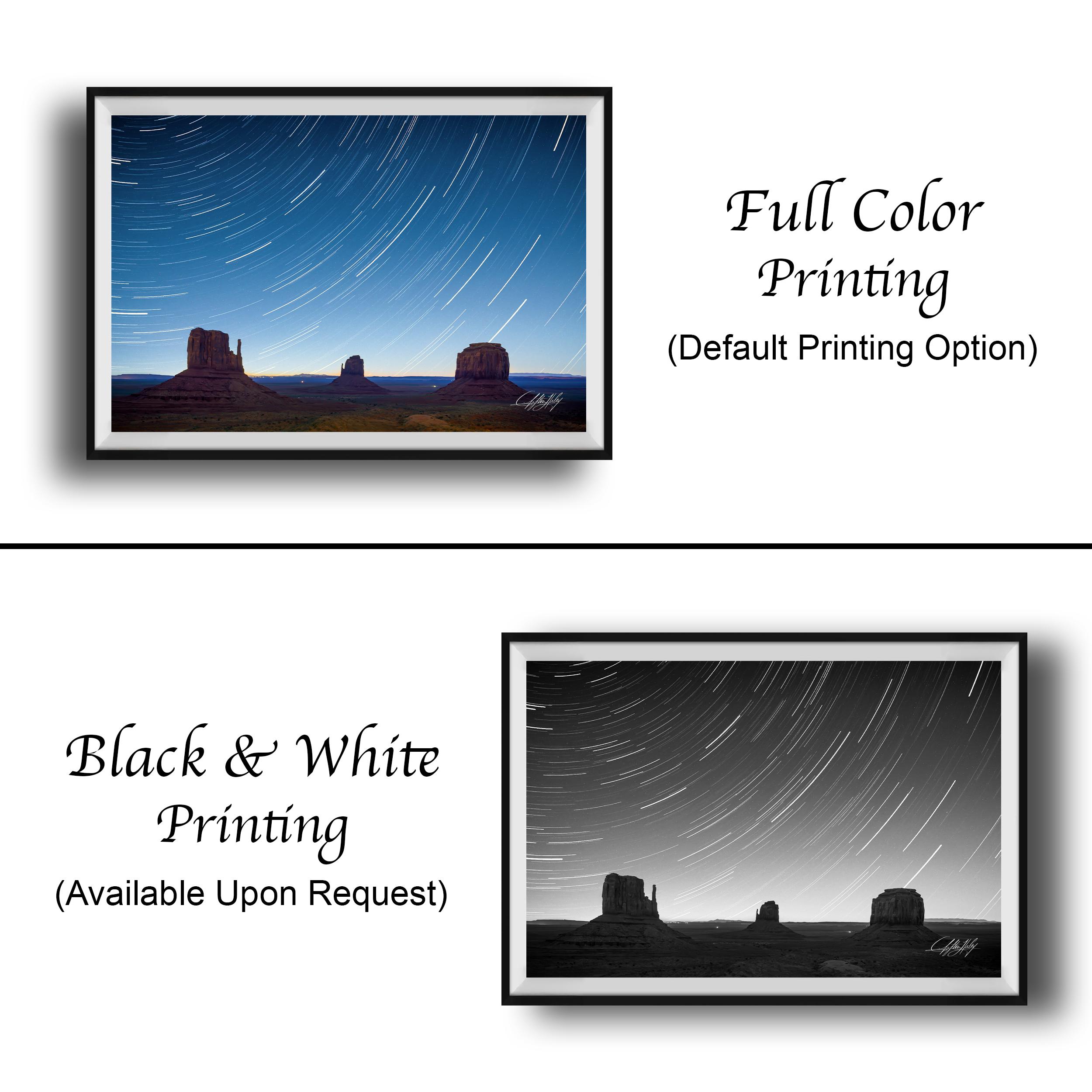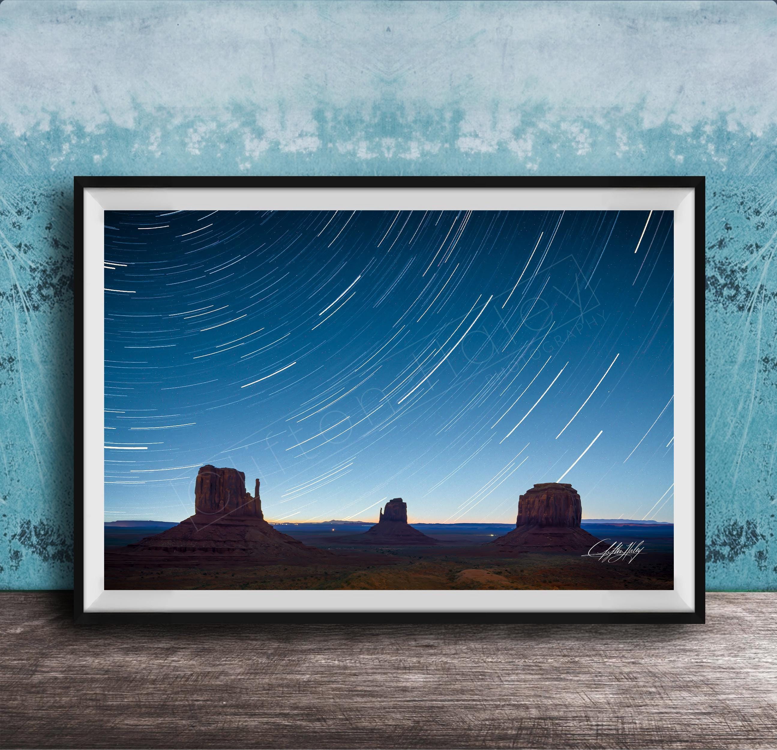 Beneath the vast desert night sky, this exquisite star trails print captures the swirling dance of galaxies above Monument Valley's iconic Mittens. Inspired by the sacred lands of the Navajo Nation, this artwork invites you to bring the serene magic of desert stars artwork into your living space. Perfect for lovers of Southwest wall art and night sky home decor, it tells a story of timeless natural beauty and celestial wonder.