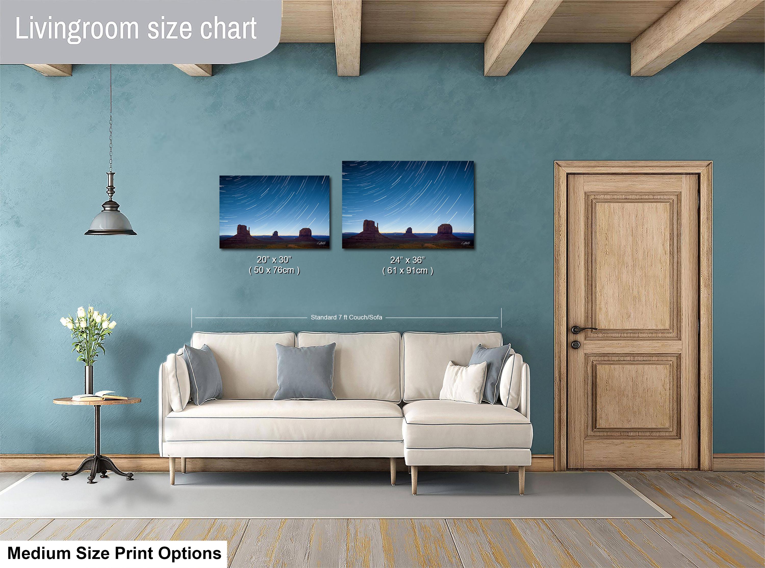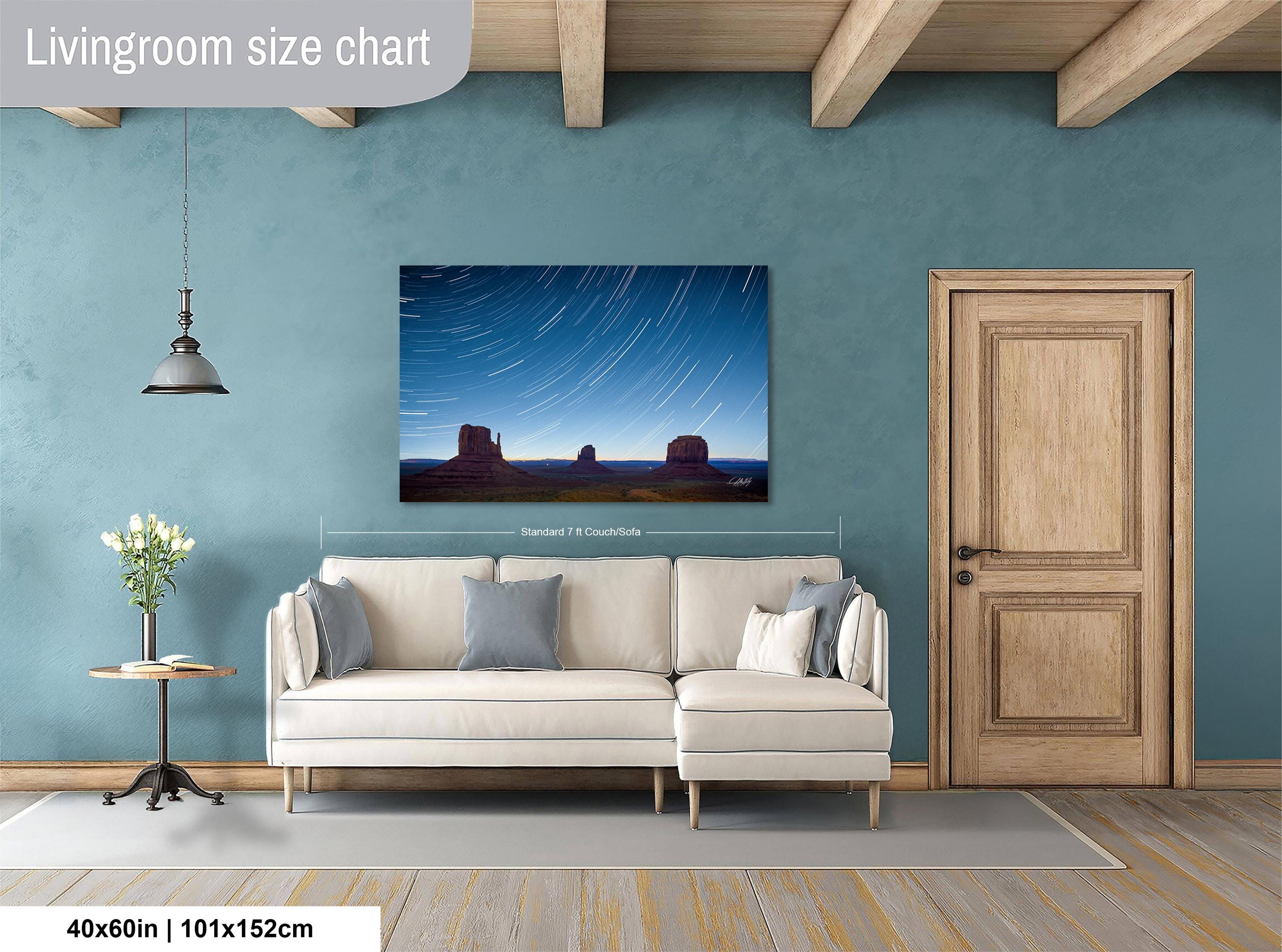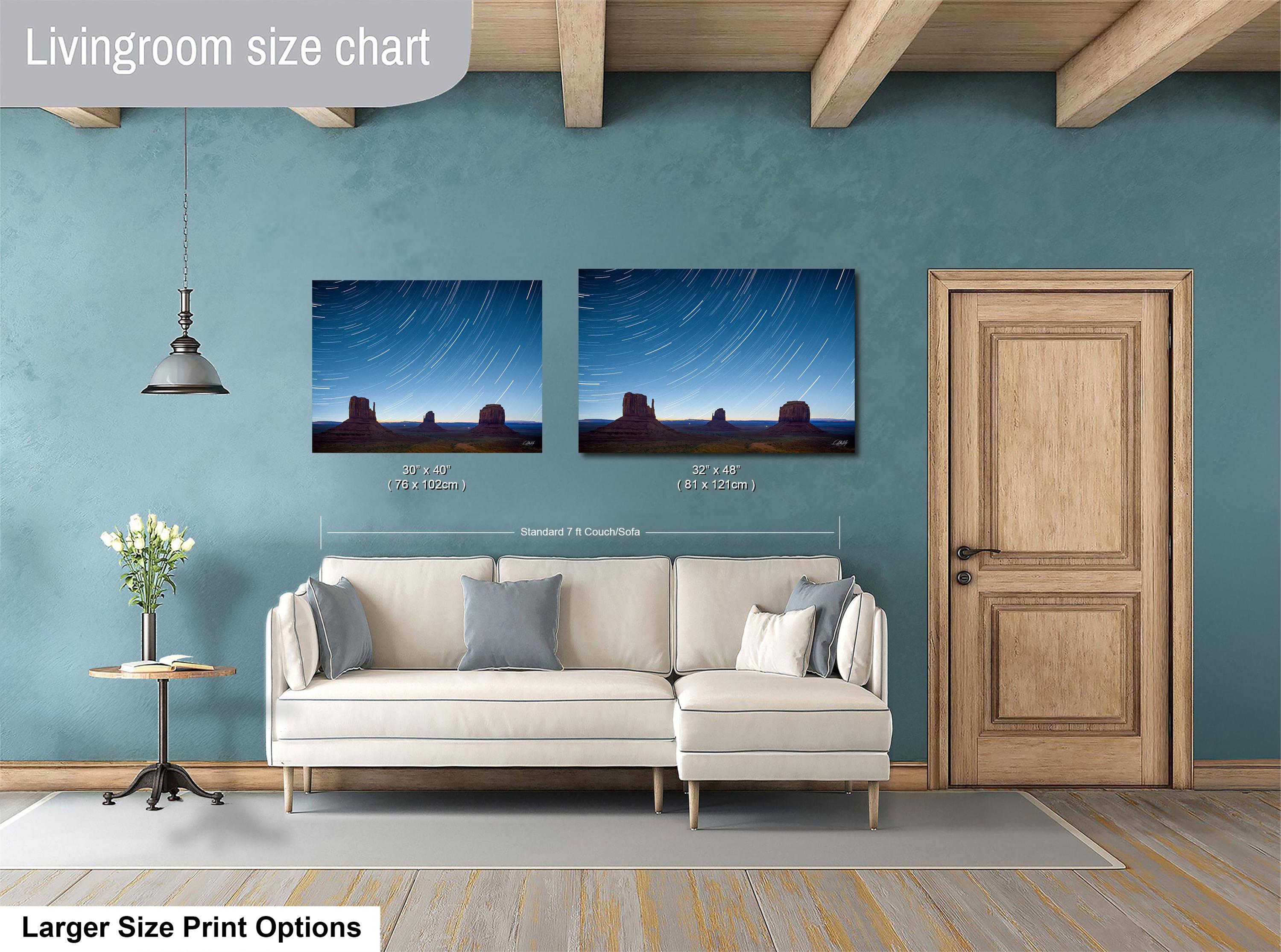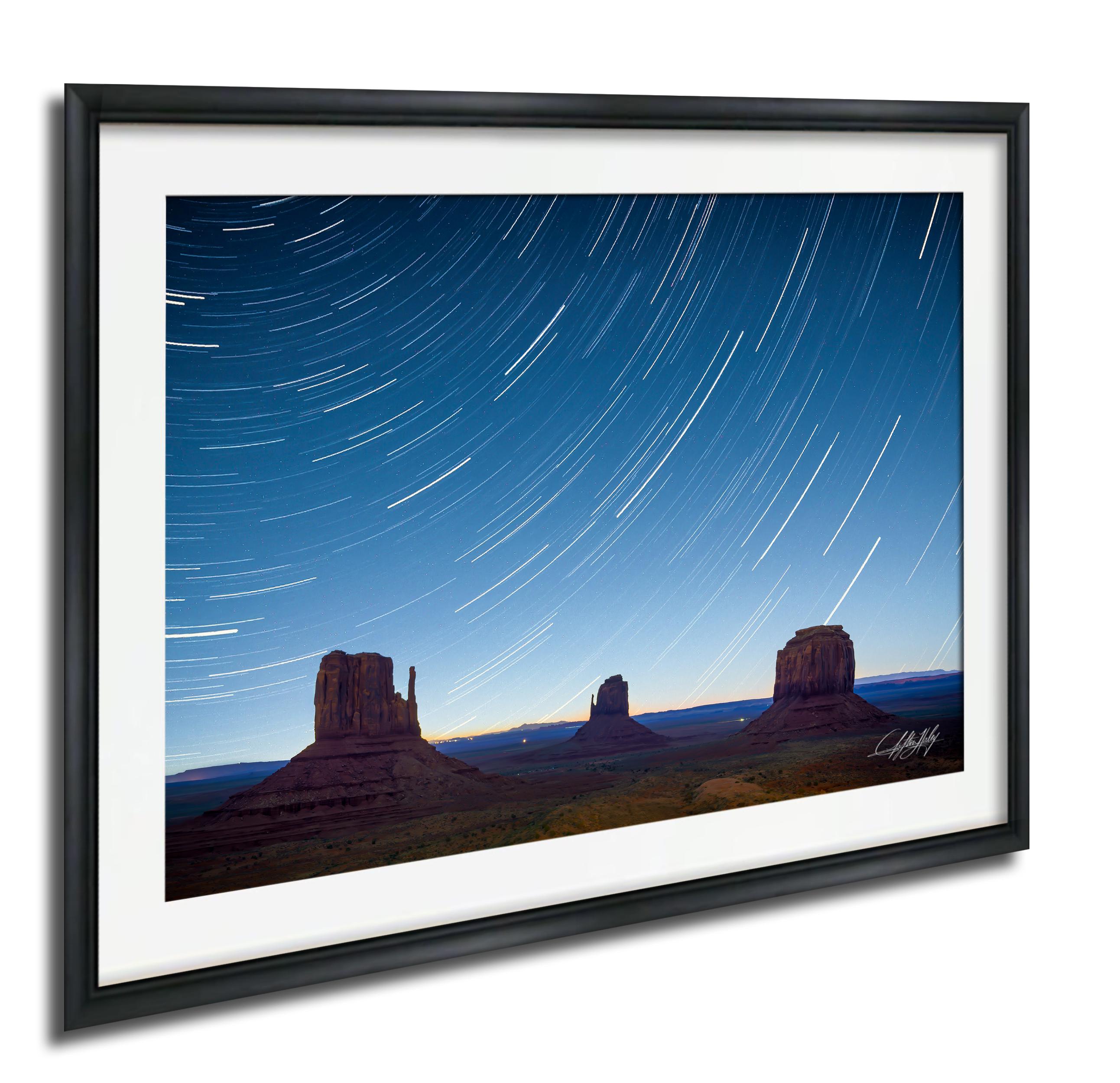Beneath the vast desert night sky, this exquisite star trails print captures the swirling dance of galaxies above Monument Valley's iconic Mittens. Inspired by the sacred lands of the Navajo Nation, this artwork invites you to bring the serene magic of desert stars artwork into your living space. Perfect for lovers of Southwest wall art and night sky home decor, it tells a story of timeless natural beauty and celestial wonder.