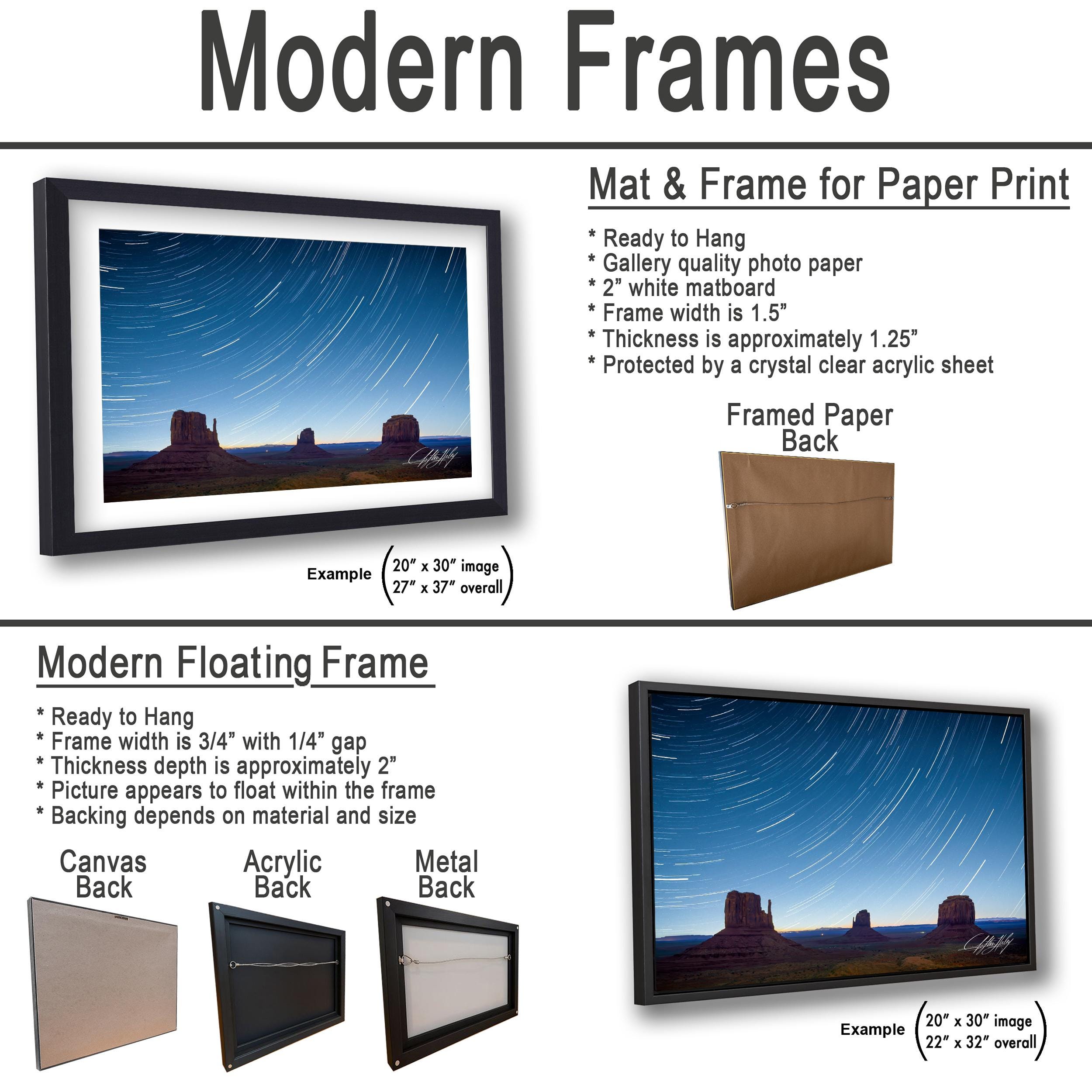 - ✅ Available framed with a 2" white mat border or mounted on floating-style frames for canvas, acrylic, and metal options