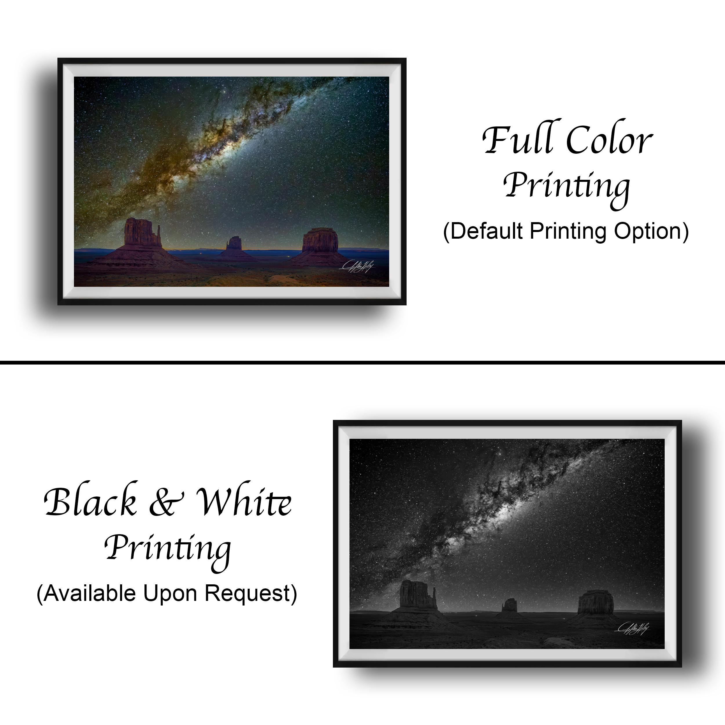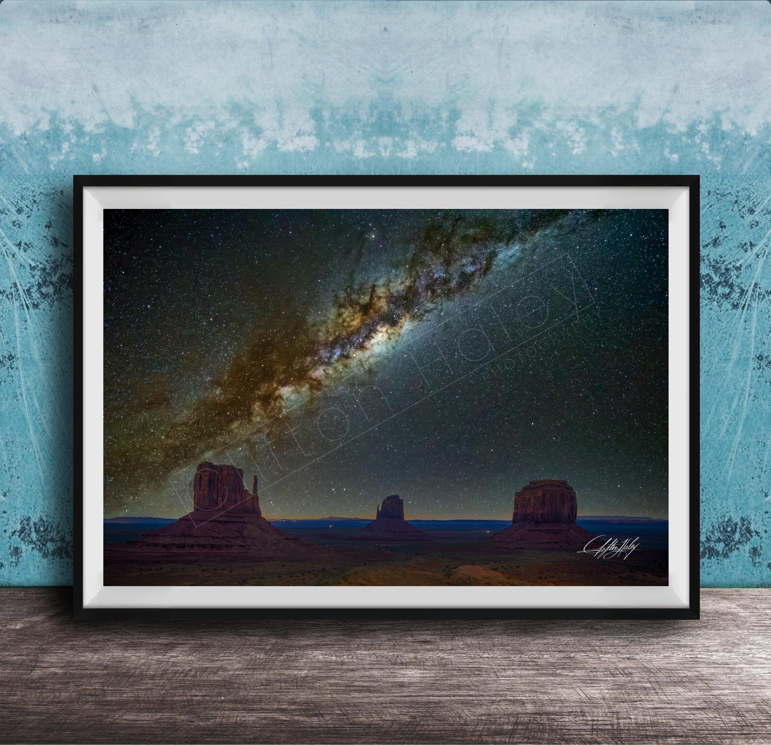 - ✅ Features the striking Milky Way night sky above Monument Valley’s mittens and Merrick Butte