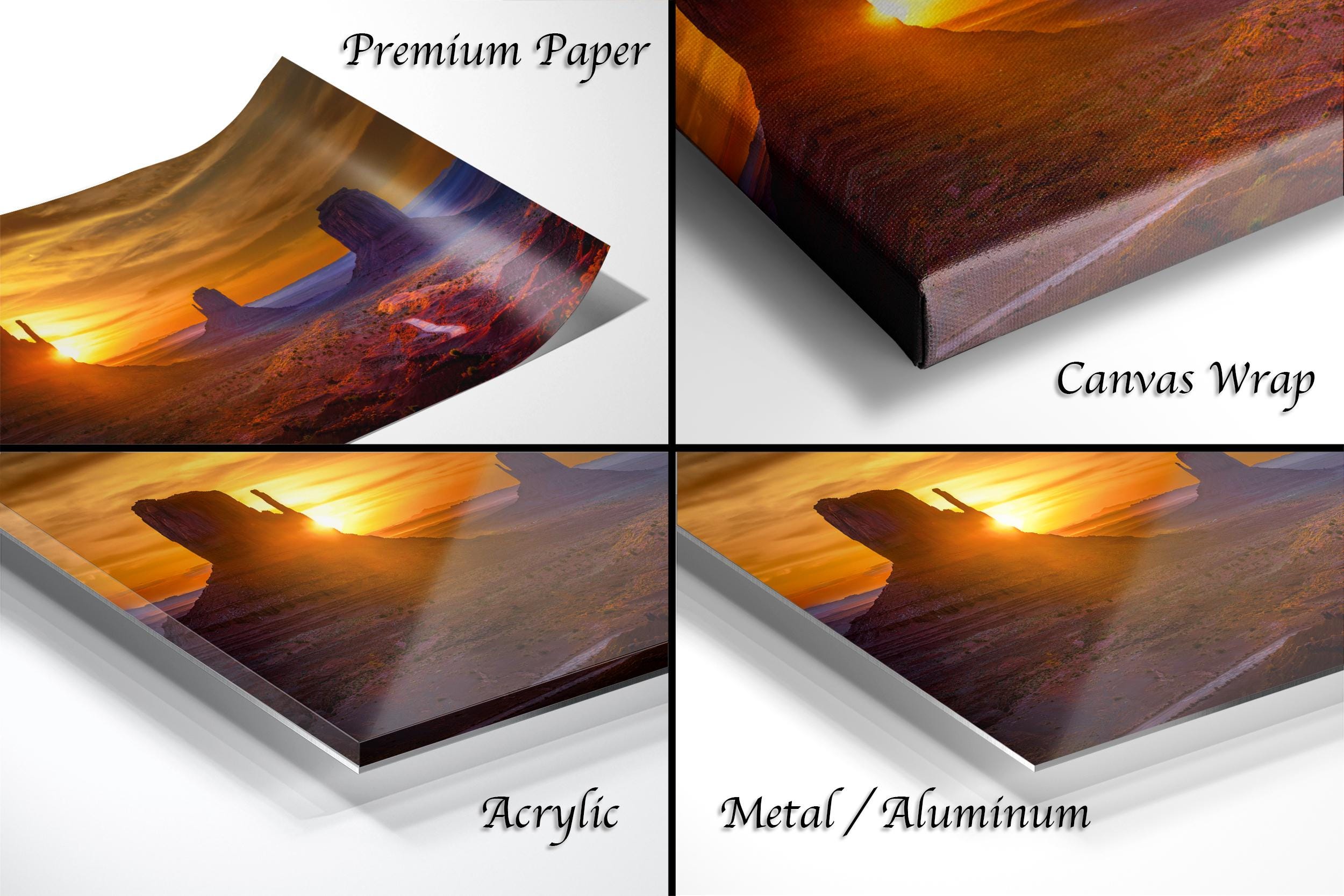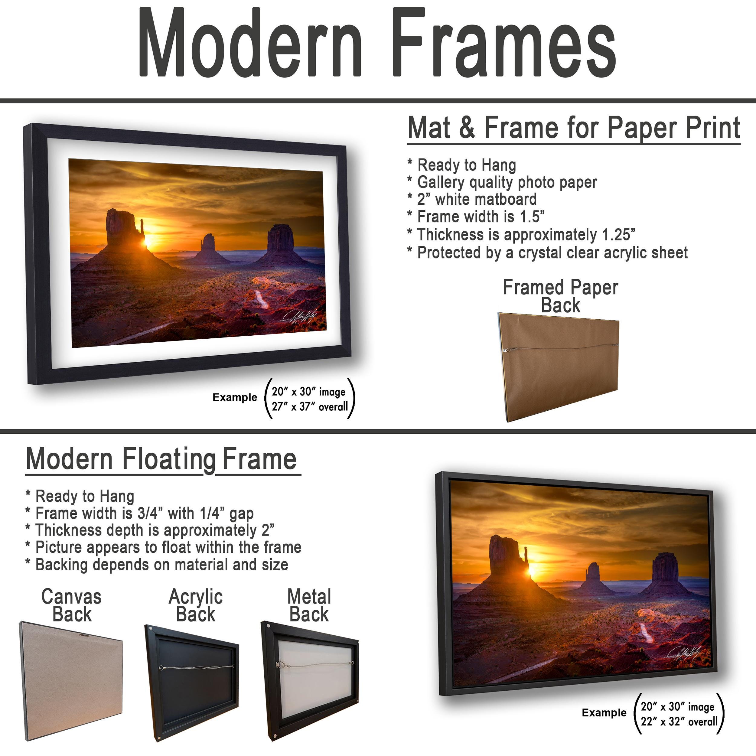 - Framed paper prints include a 2" white mat border; canvas, acrylic, and metal options feature a floating-style frame mounting.