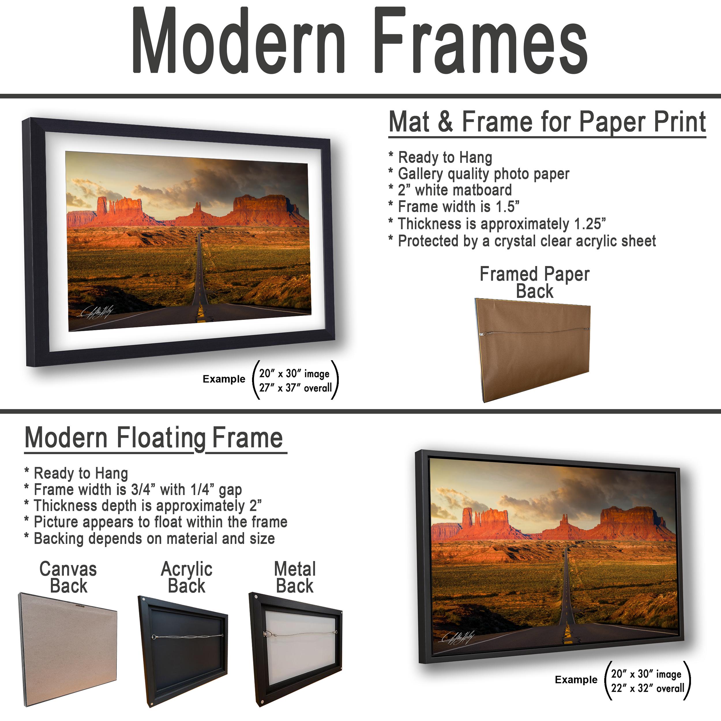 - ✅ Framed paper prints include a 2" white mat border; canvas, acrylic, and metal prints feature a floating frame style