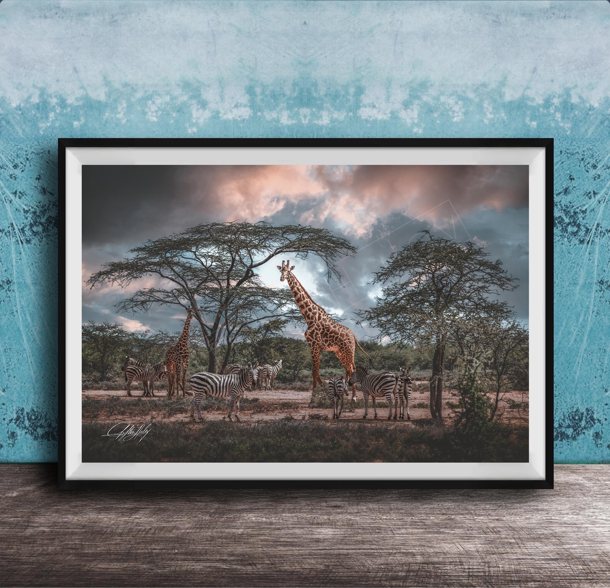Experience the majesty of safari art through this unique illustration, featuring the graceful giraffe known as Oloibor Muroo and a serene herd of zebras. This bright wall art blends maximalist animal themes with vivid colors, creating an eye-catching focal point over the bed or couch.