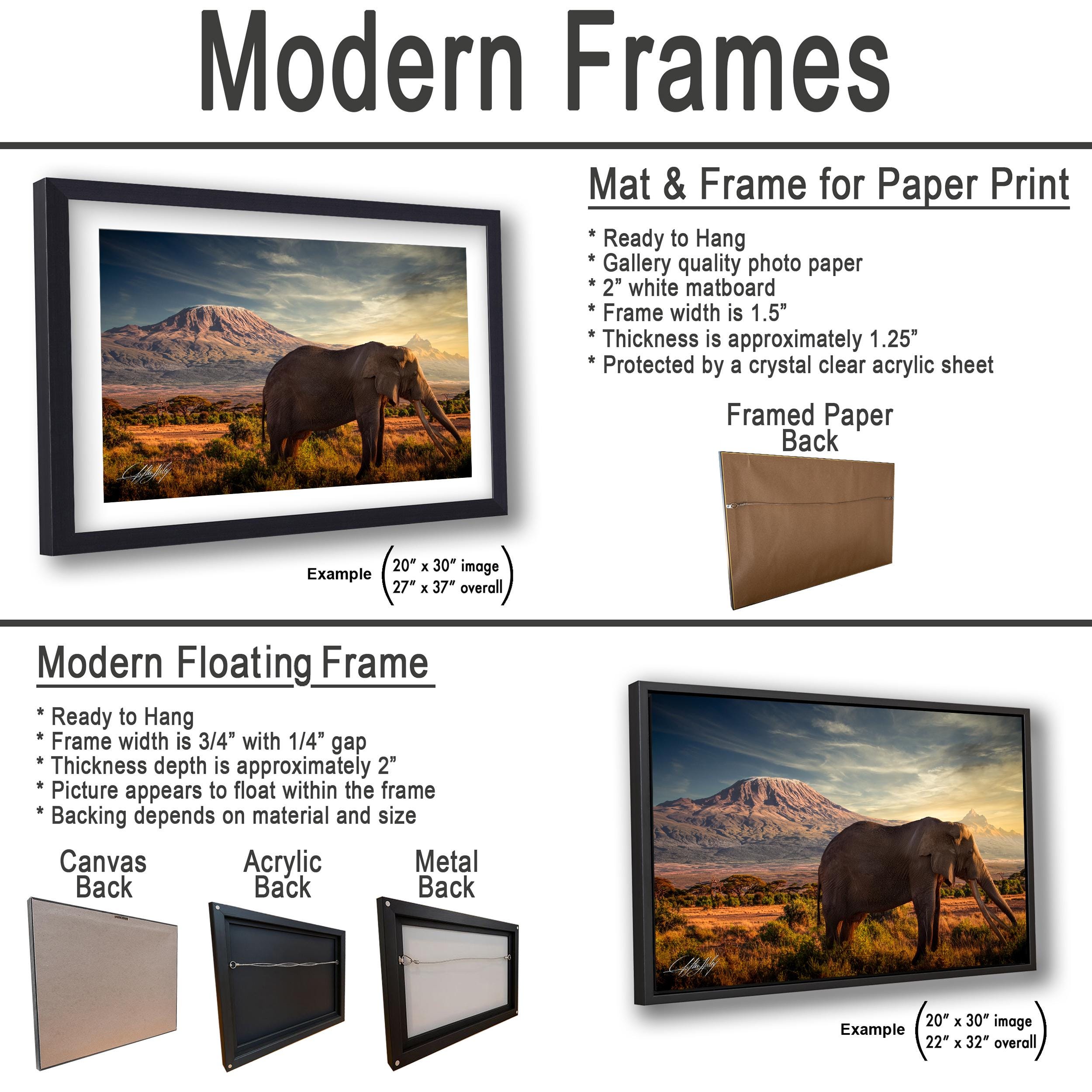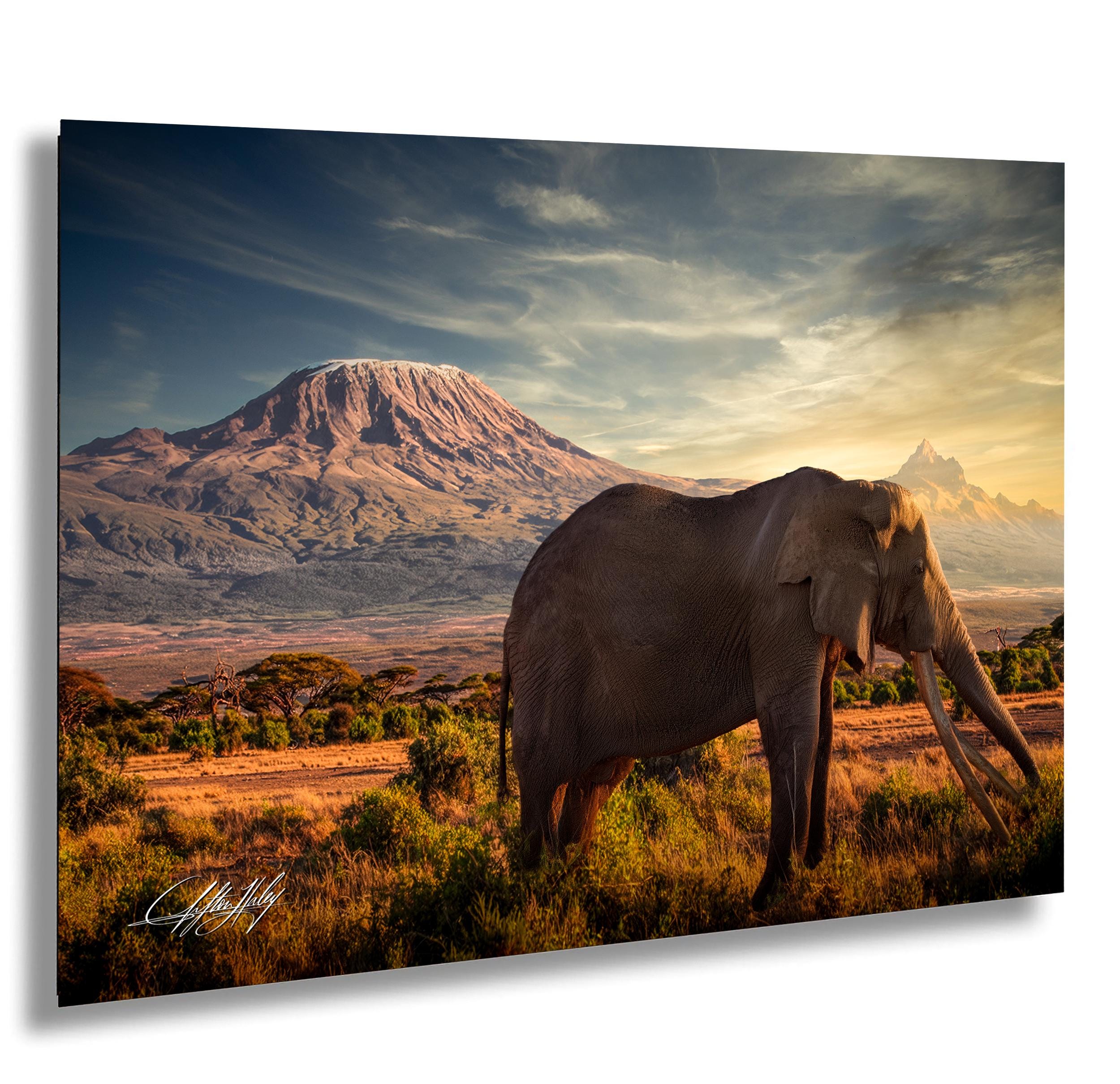 • Hand-signed artwork authenticates every print, adding value and a personal connection to the artist’s vision. • Available as framed paper prints, acrylics, aluminum/metal prints with a 2" white mat border, or canvas prints with a flush-mounted frame for a sleek finish. • Dimensions and customization options are available upon request to perfectly suit your space. • This large animal canvas portrays Craig, a rare big tusker elephant with tusks over 45 kilograms each, set against the vibrant Kenyan sunset—a tribute to Amboseli National Park’s iconic wildlife.