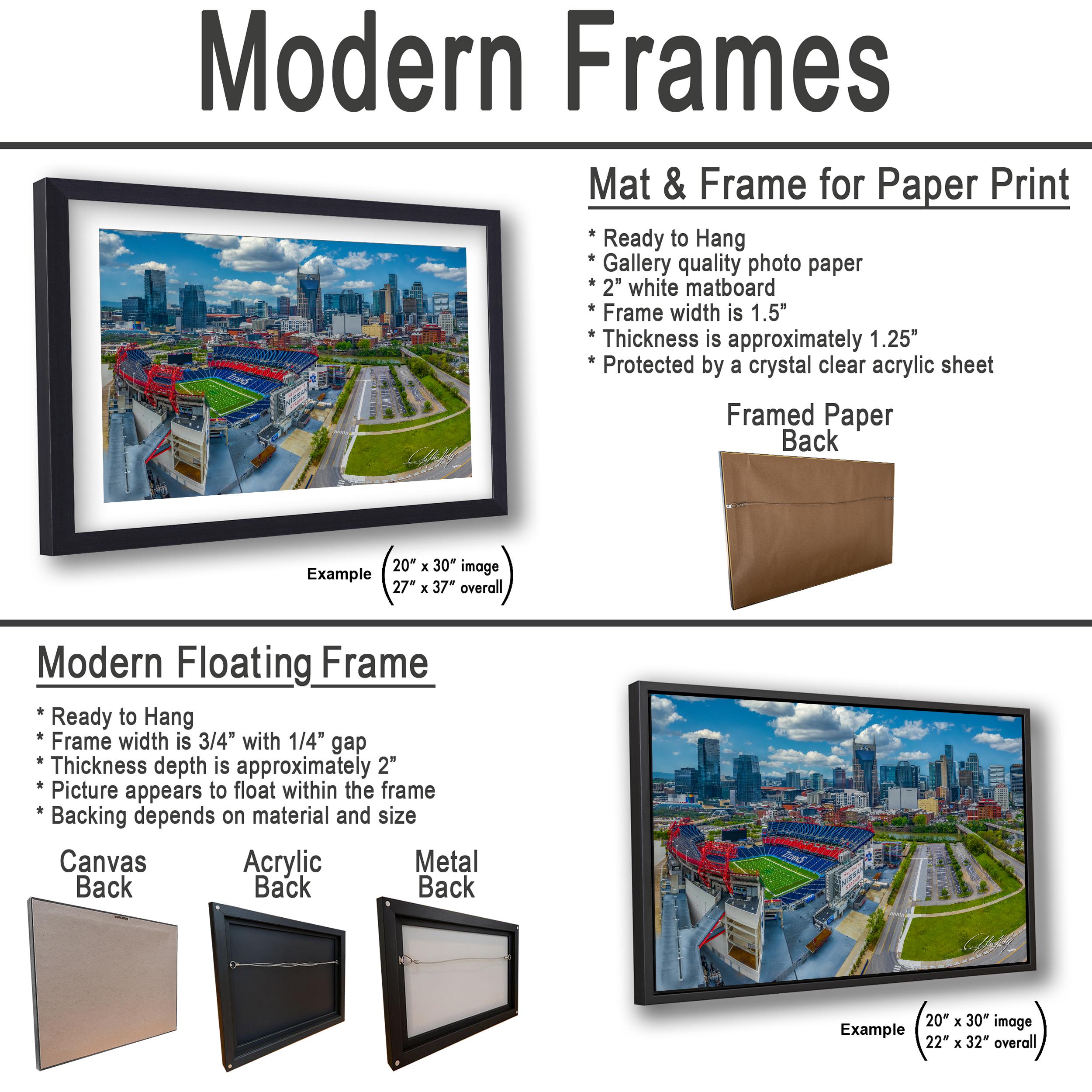 3.1) Only framed paper prints will have a 2" white mat border. 3.2) Canvas, acrylic and metal framed prints will be mounted on a "floating" style frame.