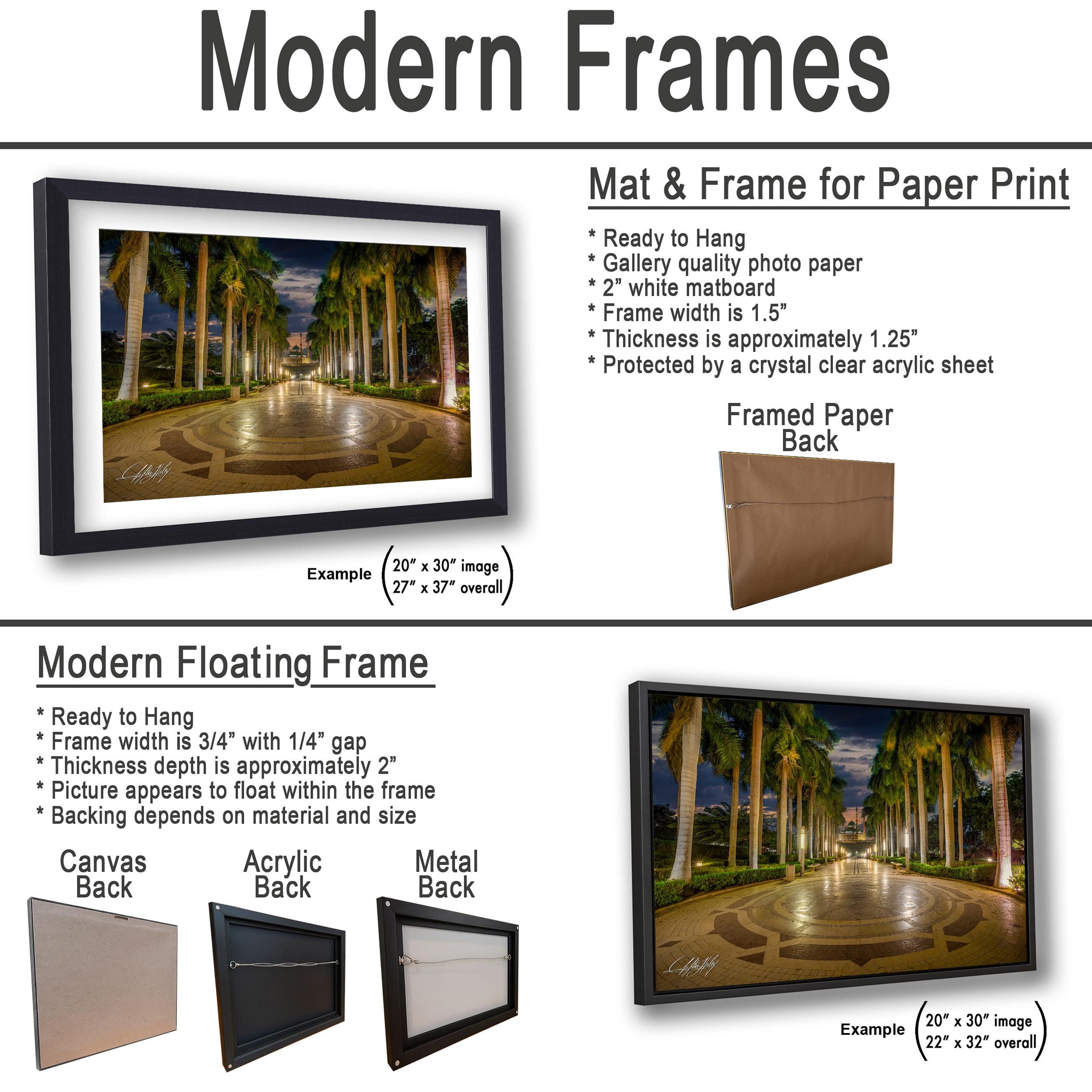3.2) Canvas, acrylic and metal framed prints will be mounted on a "floating" style frame.