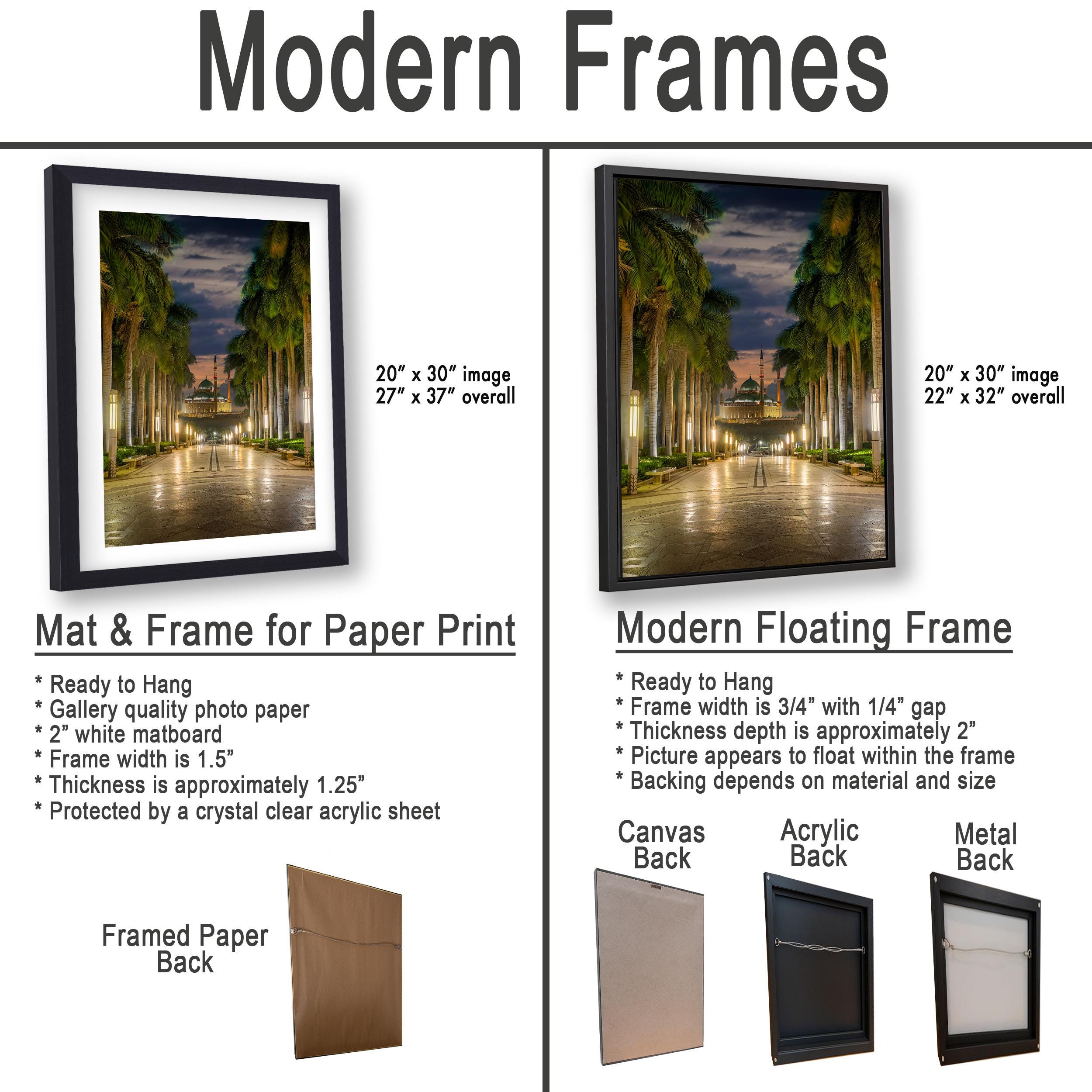 3.2) Canvas, acrylic and metal framed prints will be mounted on a "floating" style frame.
