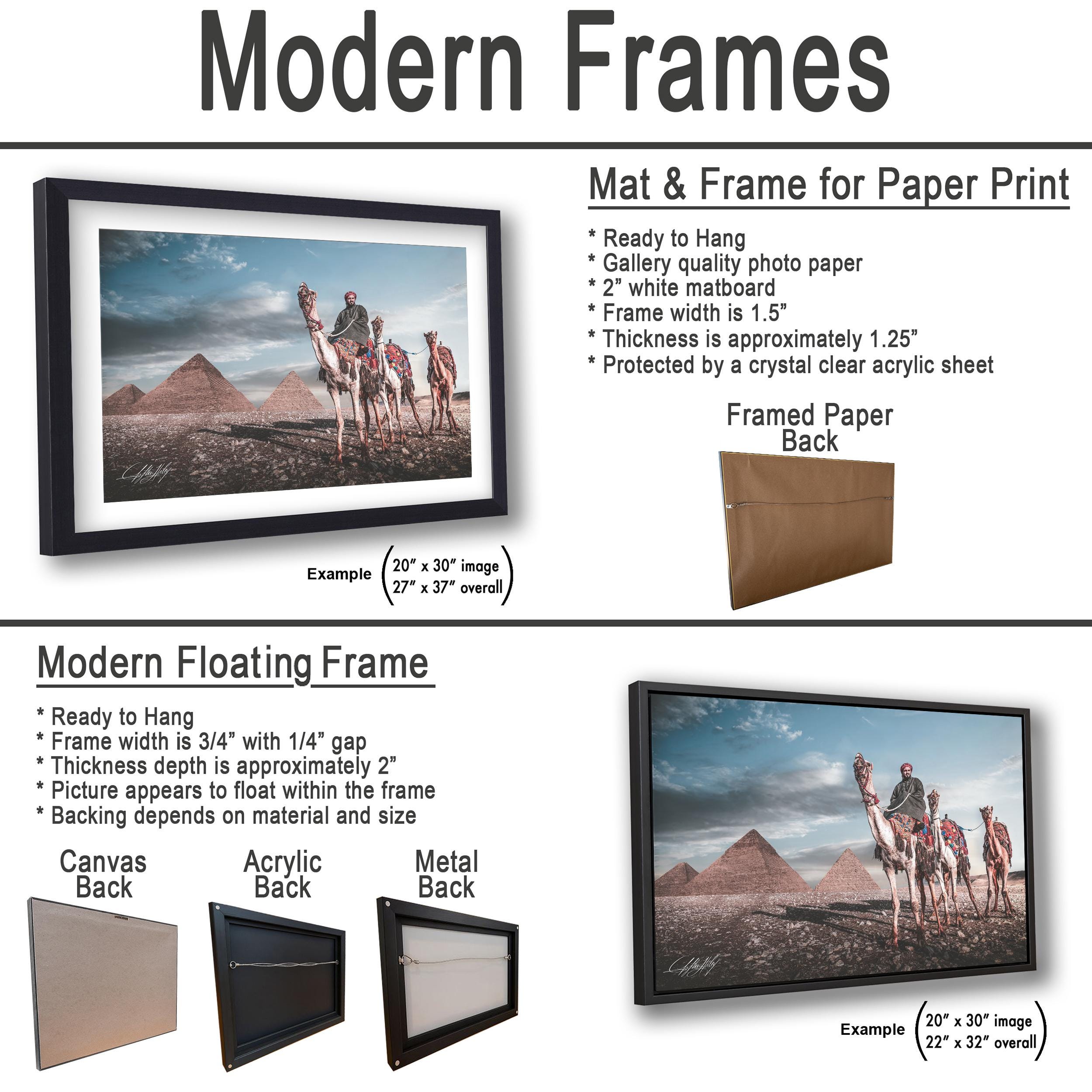 3.1) Only framed paper prints will have a 2" white mat border. 3.2) Canvas, acrylic and metal framed prints will be mounted on a "floating" style frame.
