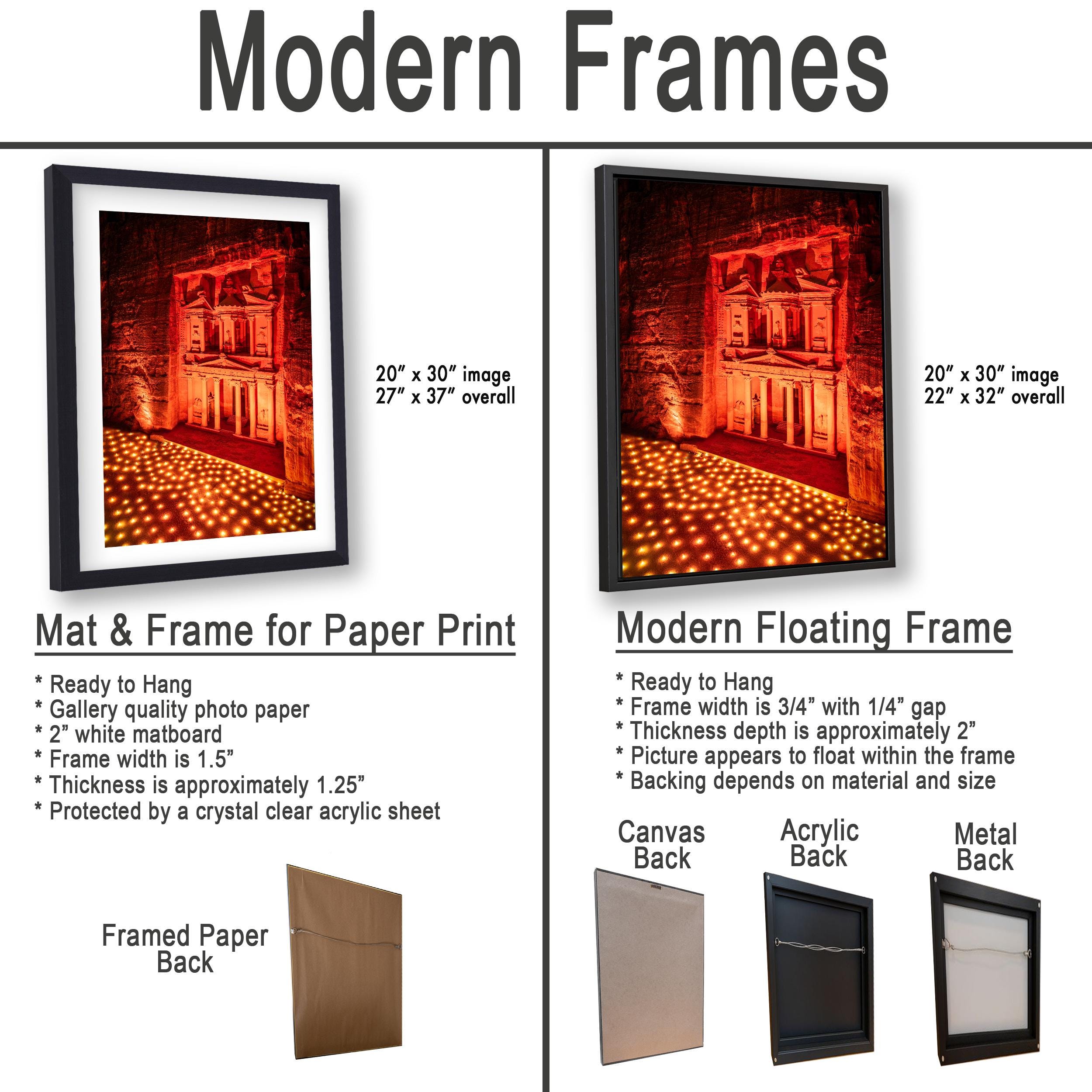 3.1) Only framed paper prints will have a 2" white mat border. 3.2) Canvas, acrylic and metal framed prints will be mounted on a "floating" style frame.