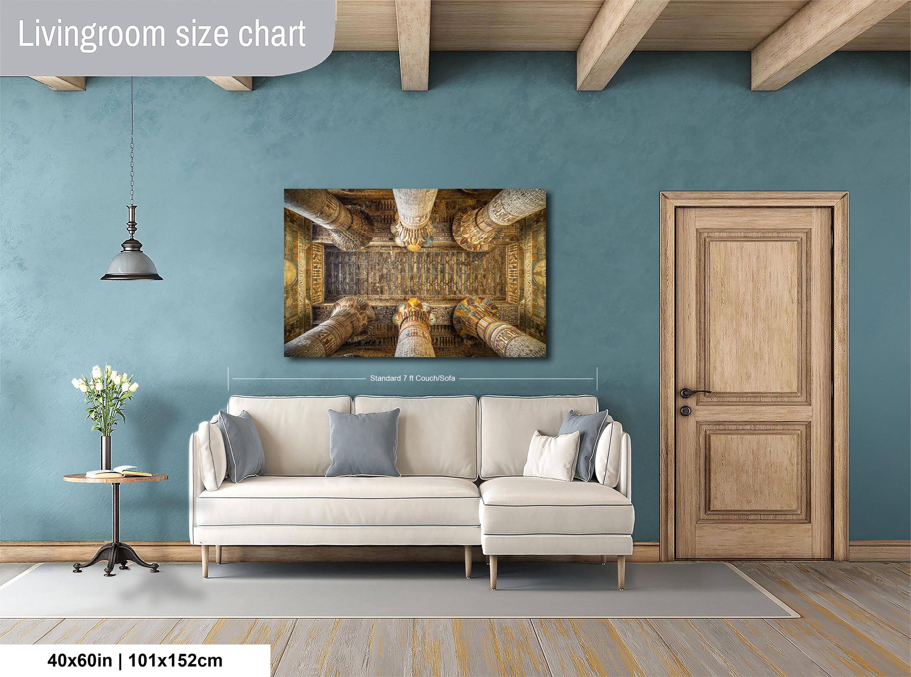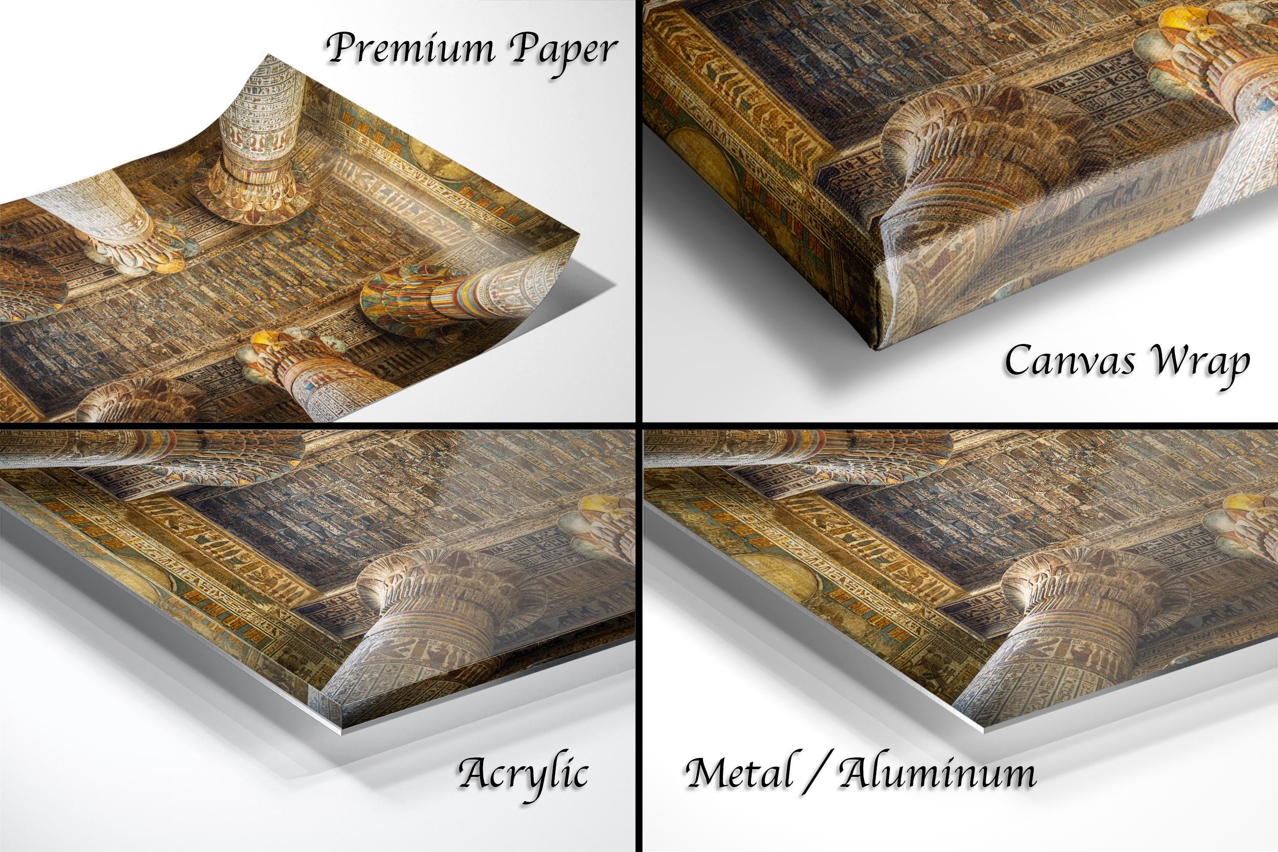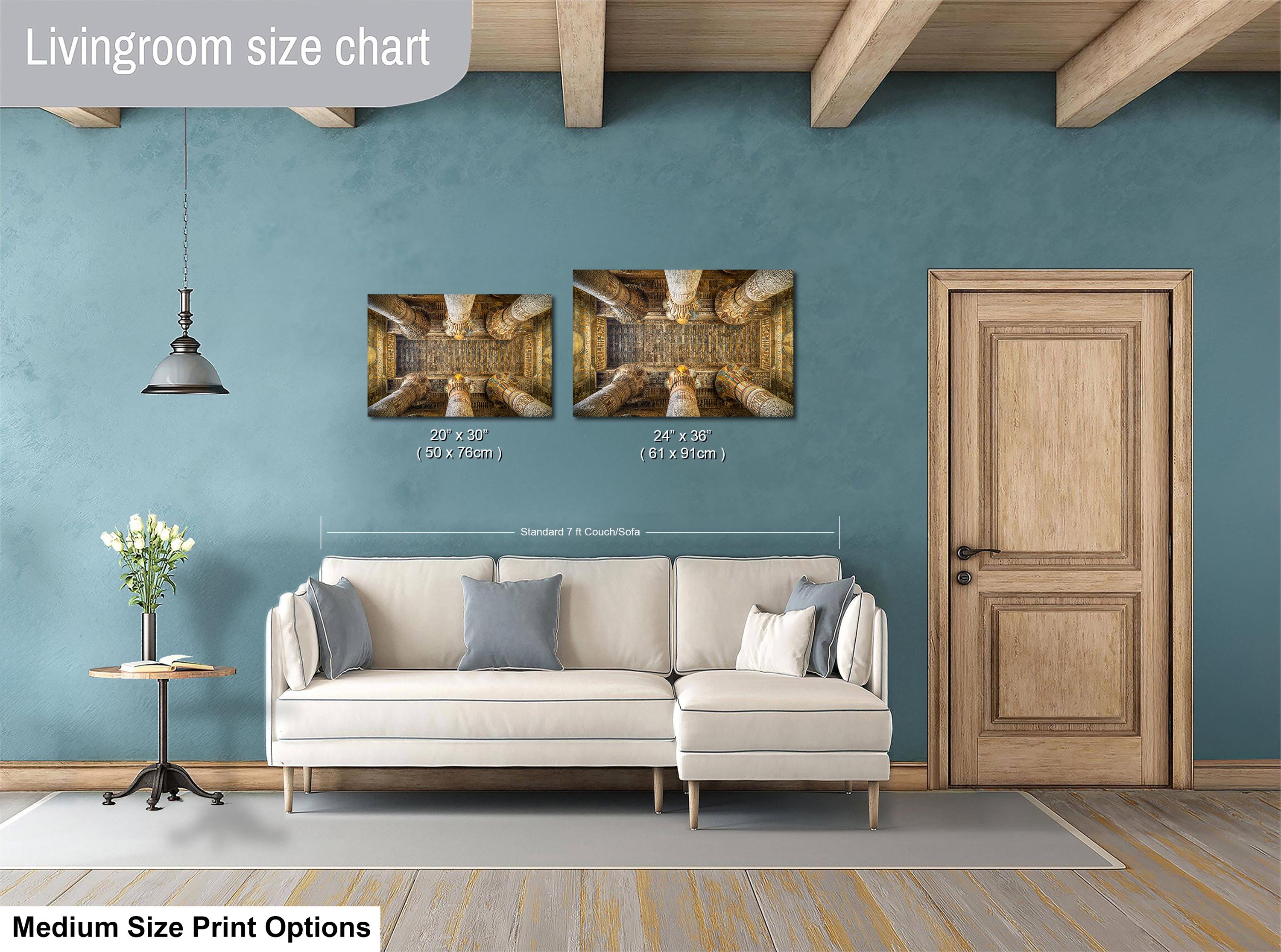 Step into a moment where ancient artistry meets timeless beauty with this Esna Temple wall decor. Inspired by the intricate hieroglyphs and lotus capitals captured in this sphinx art print, each piece invites you to experience the sacred precision of Egyptian craftsmanship. The interplay of light and shadow in the original photograph brings these columns to life, making it a stunning addition to any space.
