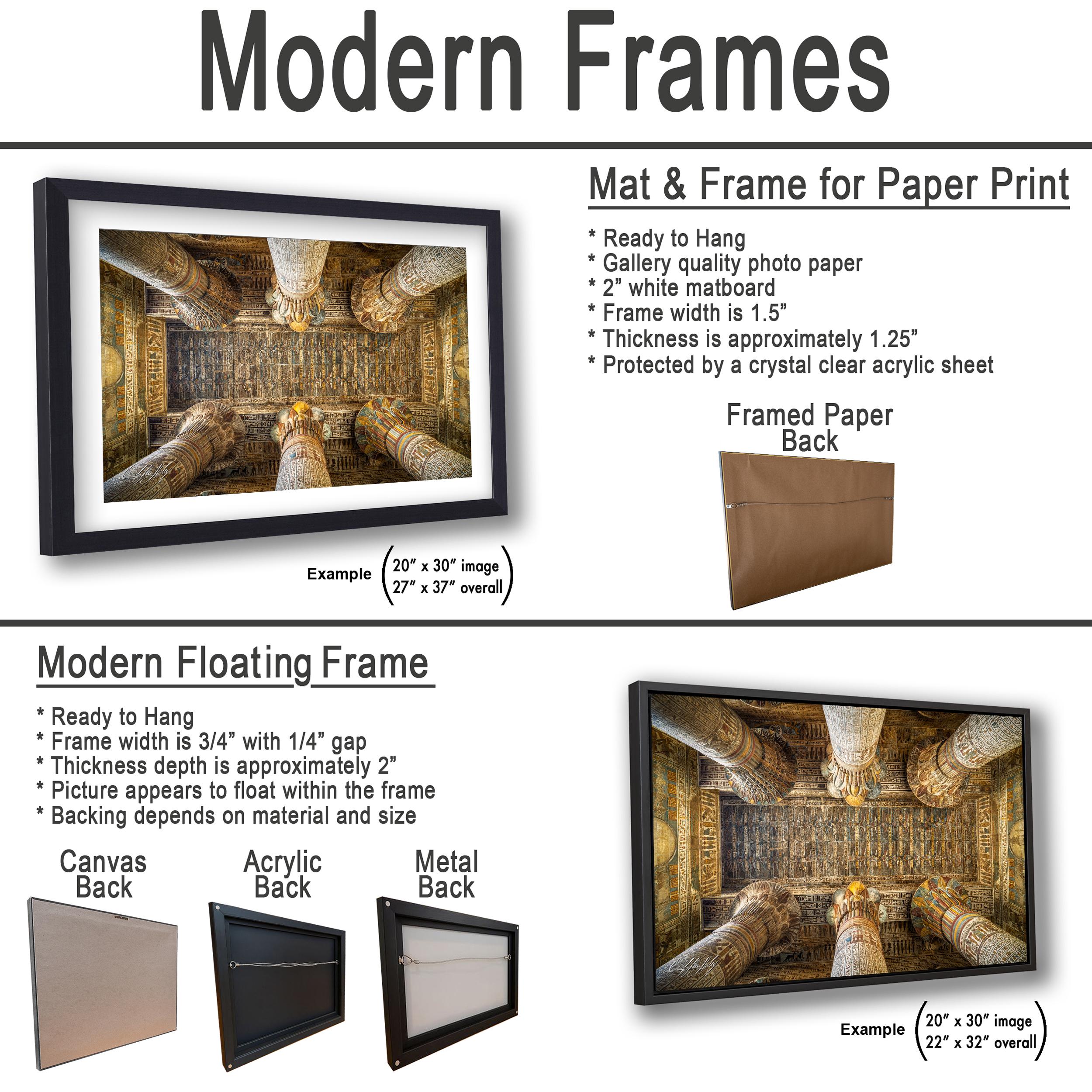 3.1) Only framed paper prints will have a 2" white mat border. 3.2) Canvas, acrylic and metal framed prints will be mounted on a "floating" style frame.