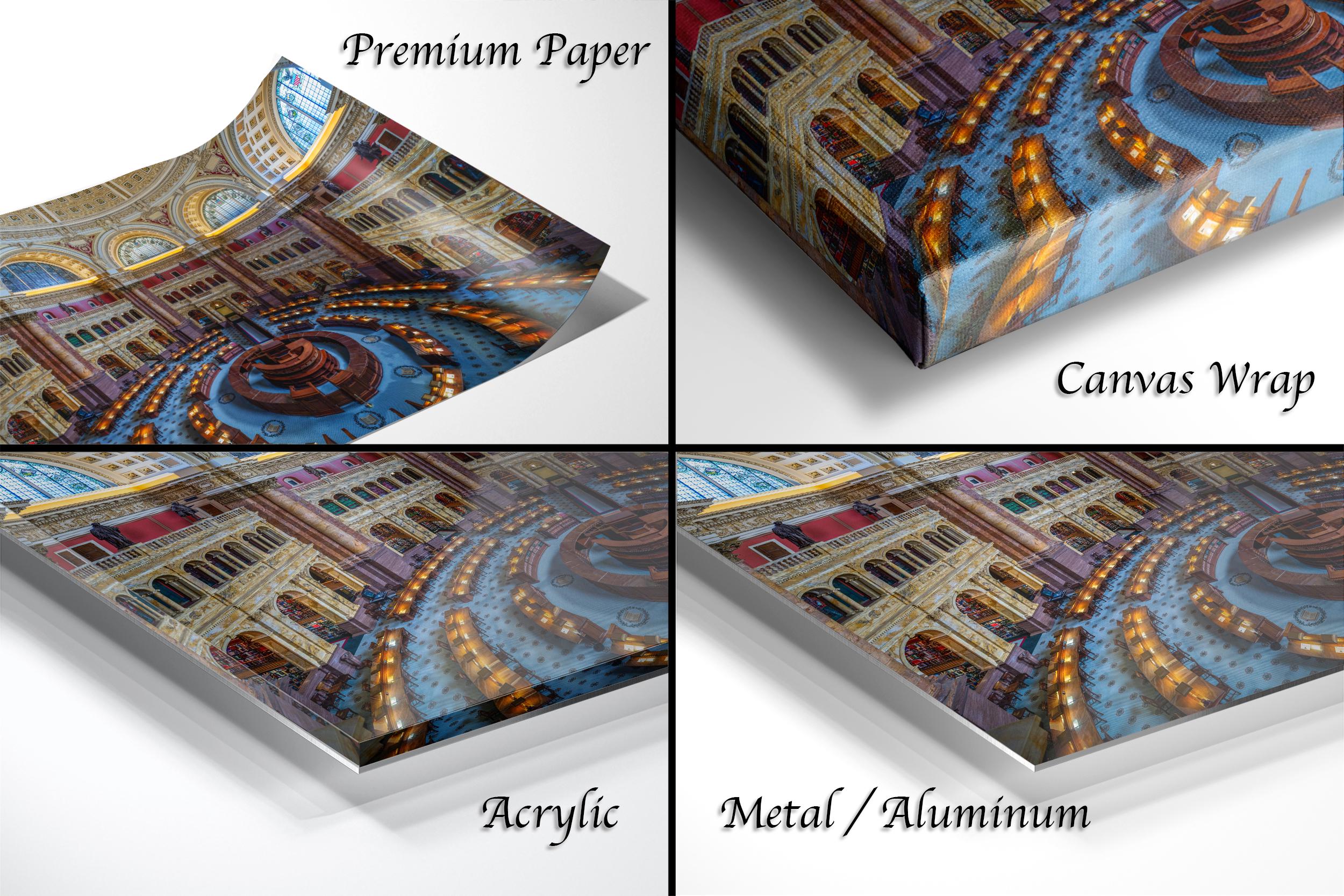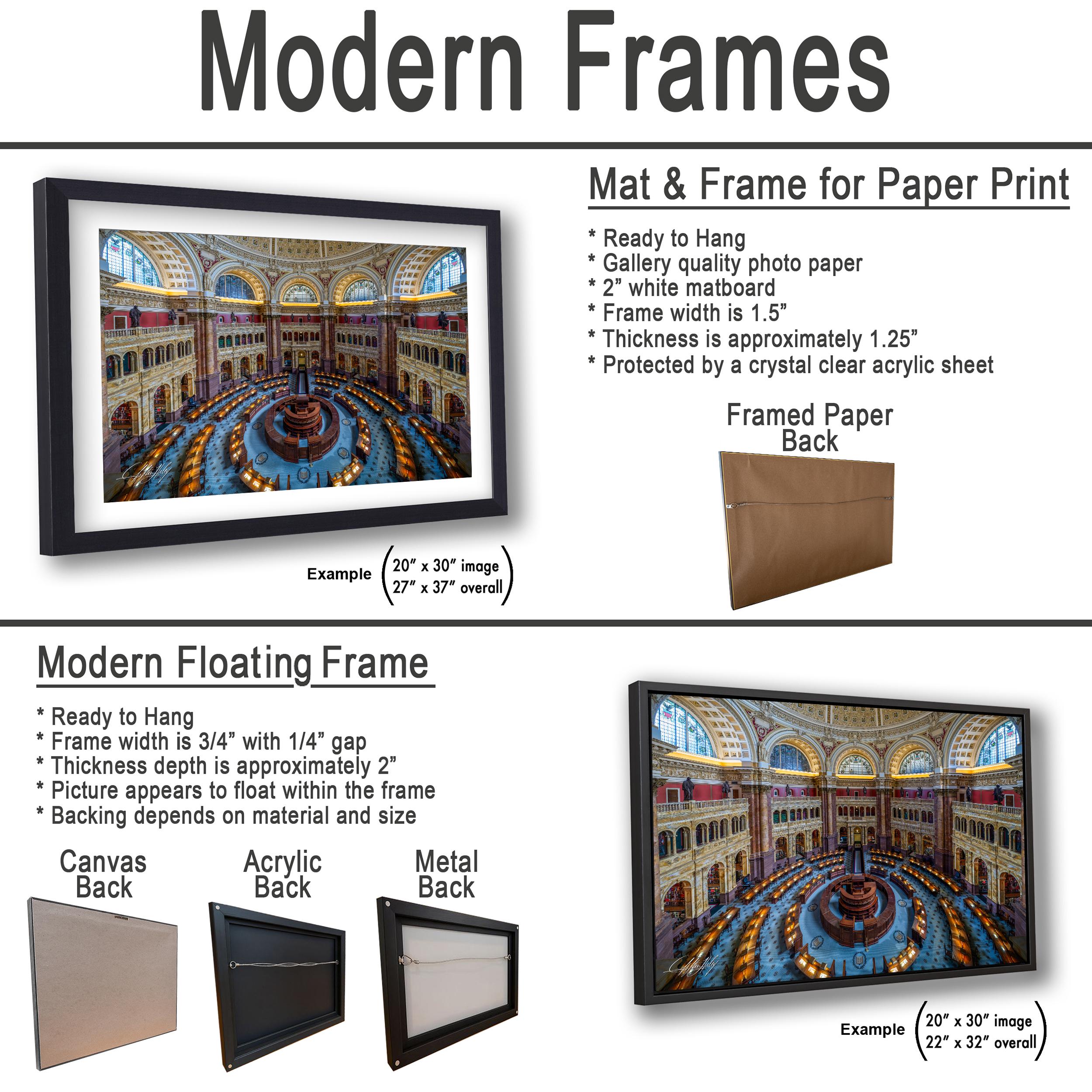 3.1) Only framed paper prints will have a 2" white mat border. 3.2) Canvas, acrylic and metal framed prints will be mounted on a "floating" style frame.