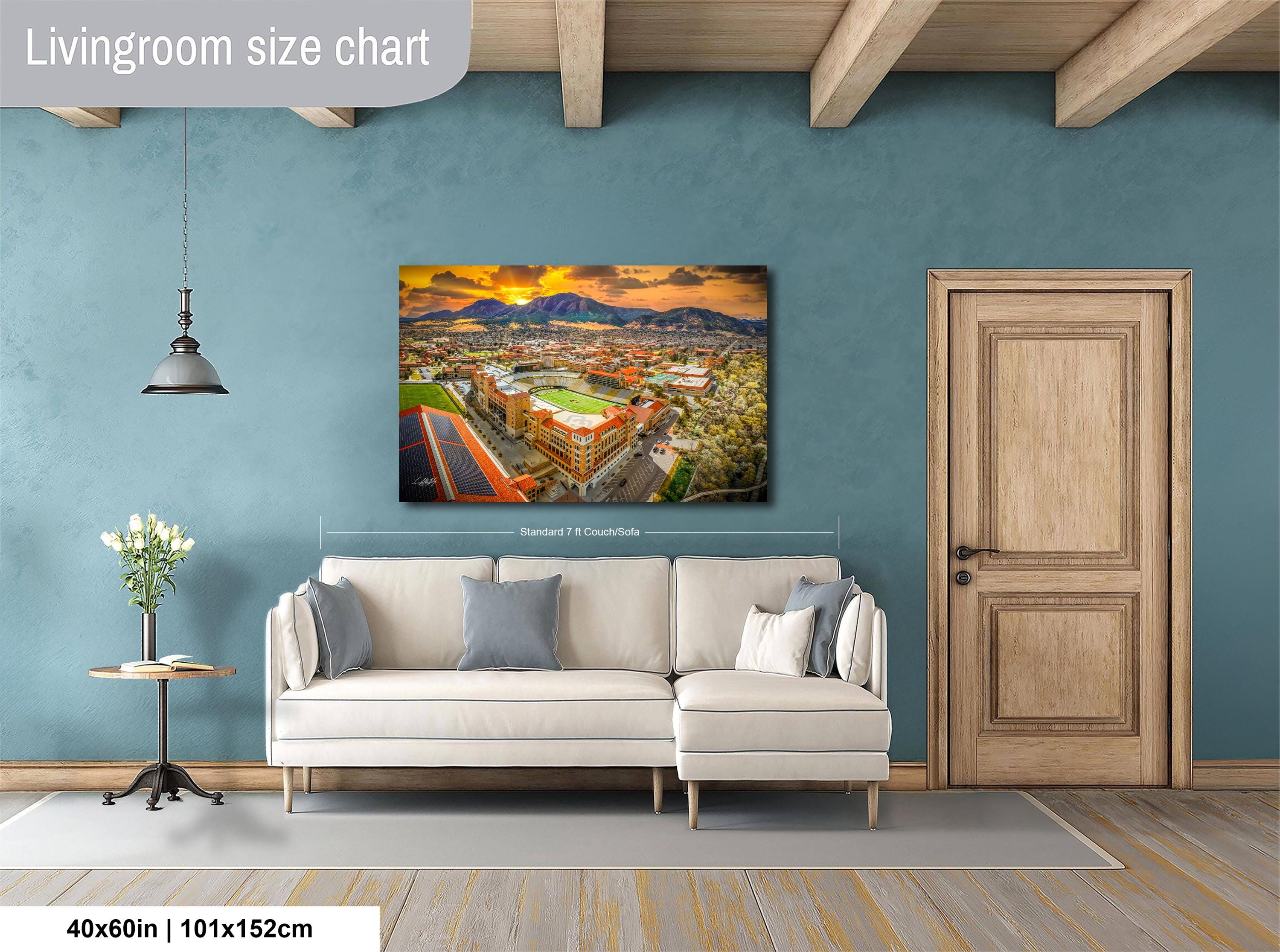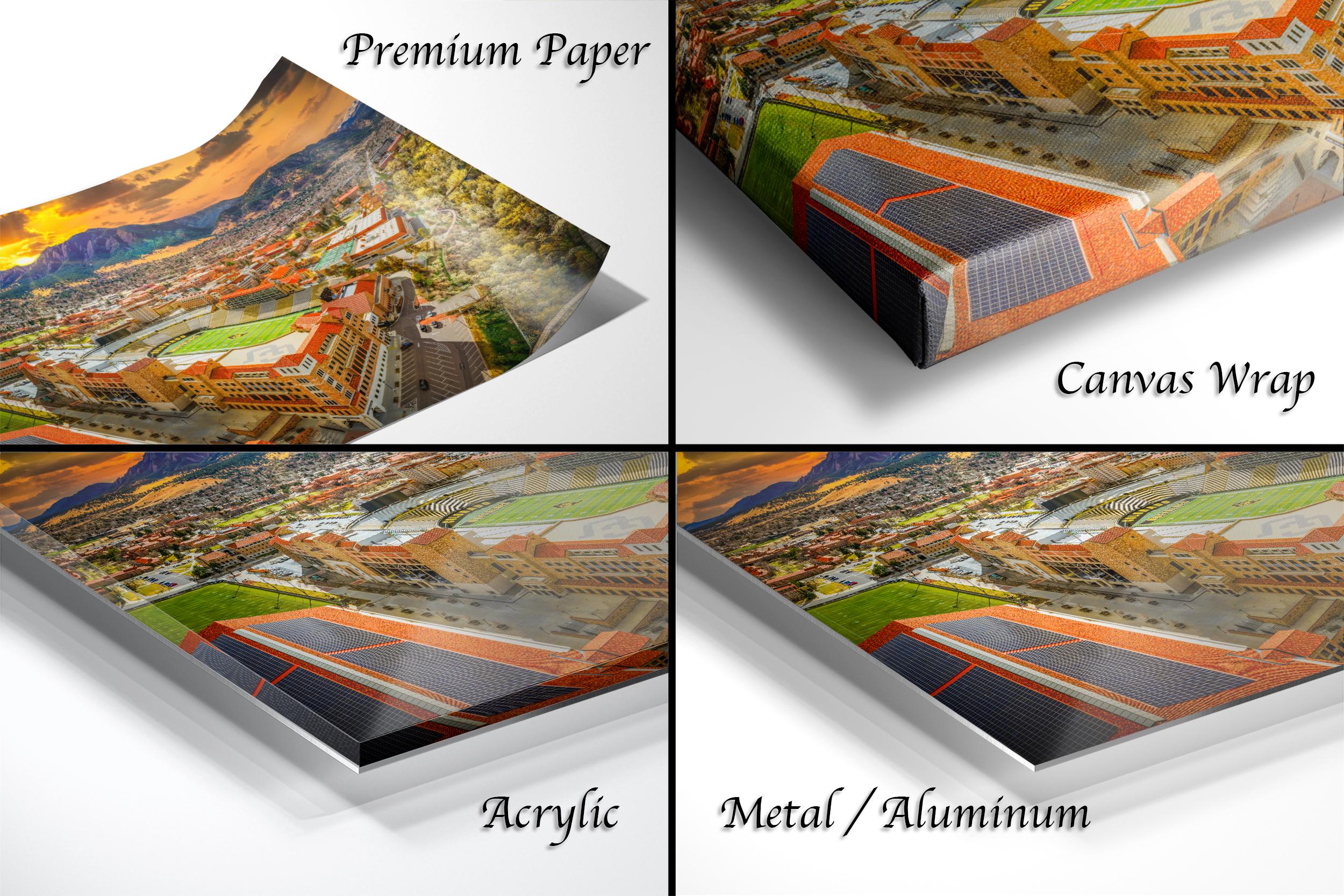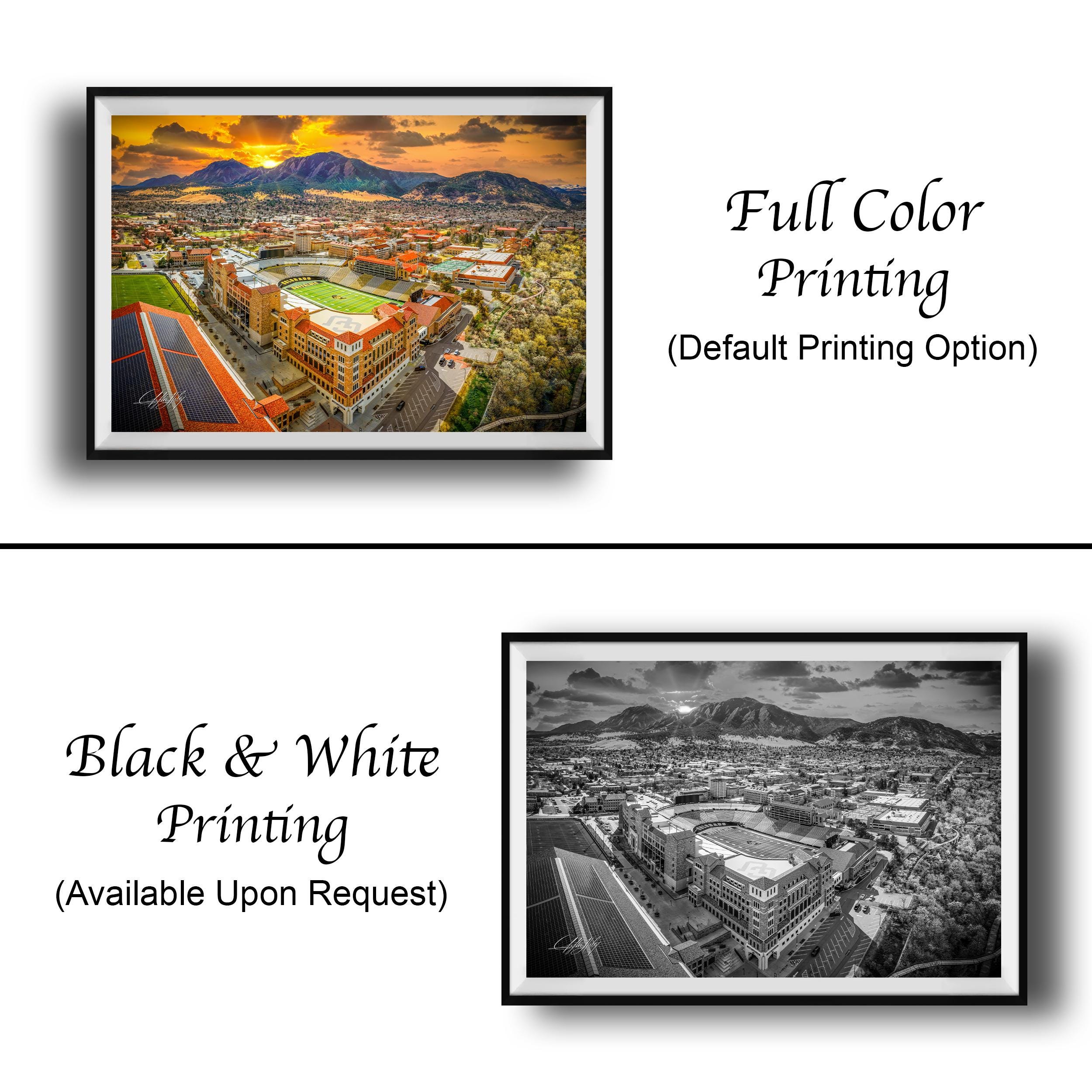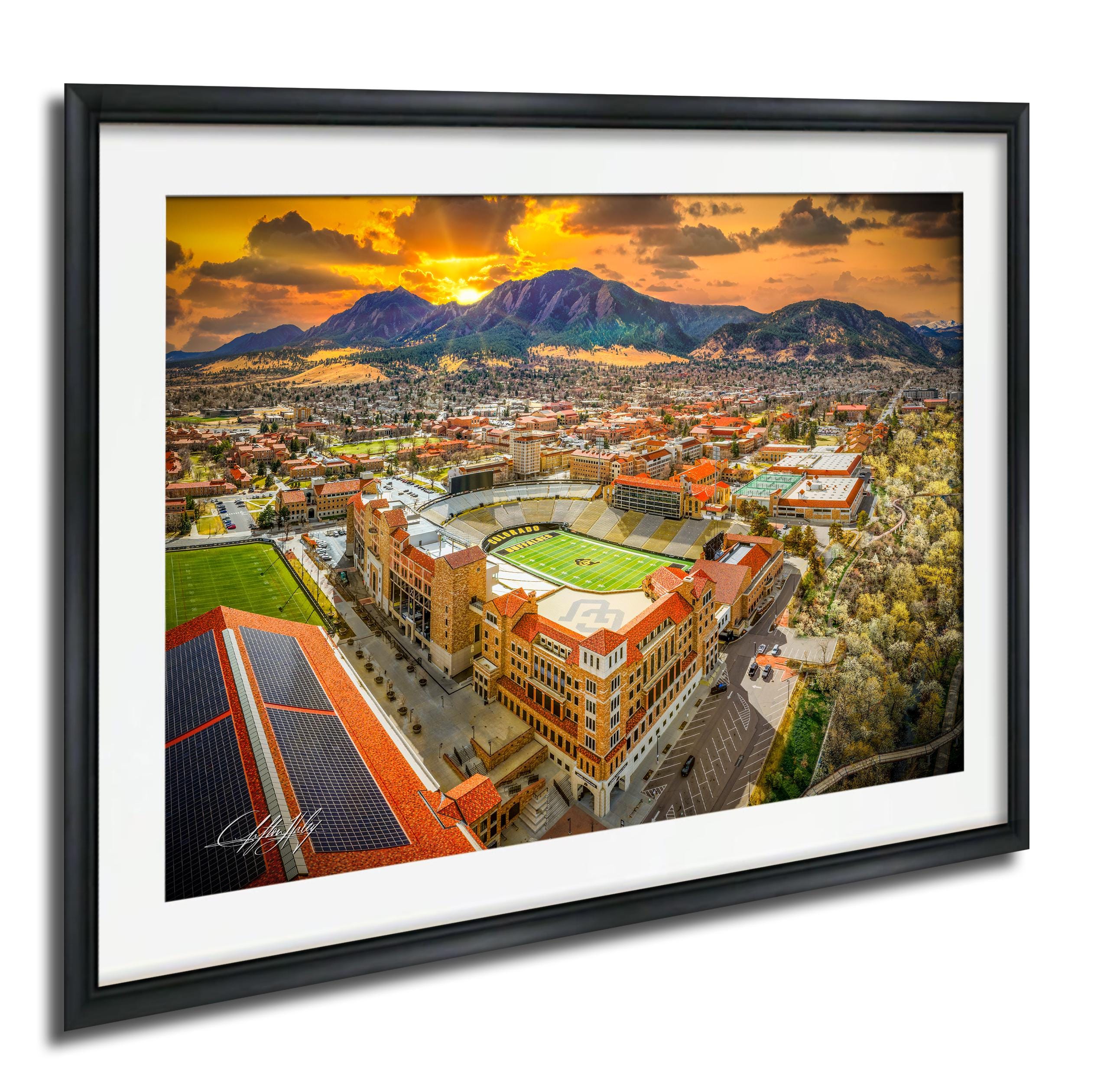 Experience the spirit of Colorado University captured in this striking fine art print, where the iconic Folsom Field and the majestic Rocky Mountains come alive at sunset. This piece celebrates the Buffalos' deep connection to their Boulder campus, blending collegiate pride with the natural beauty of the surrounding landscape. Perfect for those seeking a unique addition to their sports office or a tribute to Colorado alumni, this artwork brings the vibrant energy of NCAA stadium art into any space.