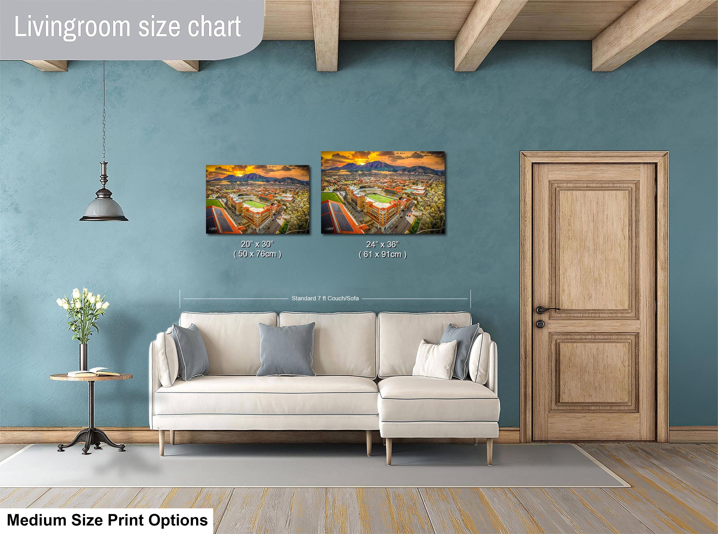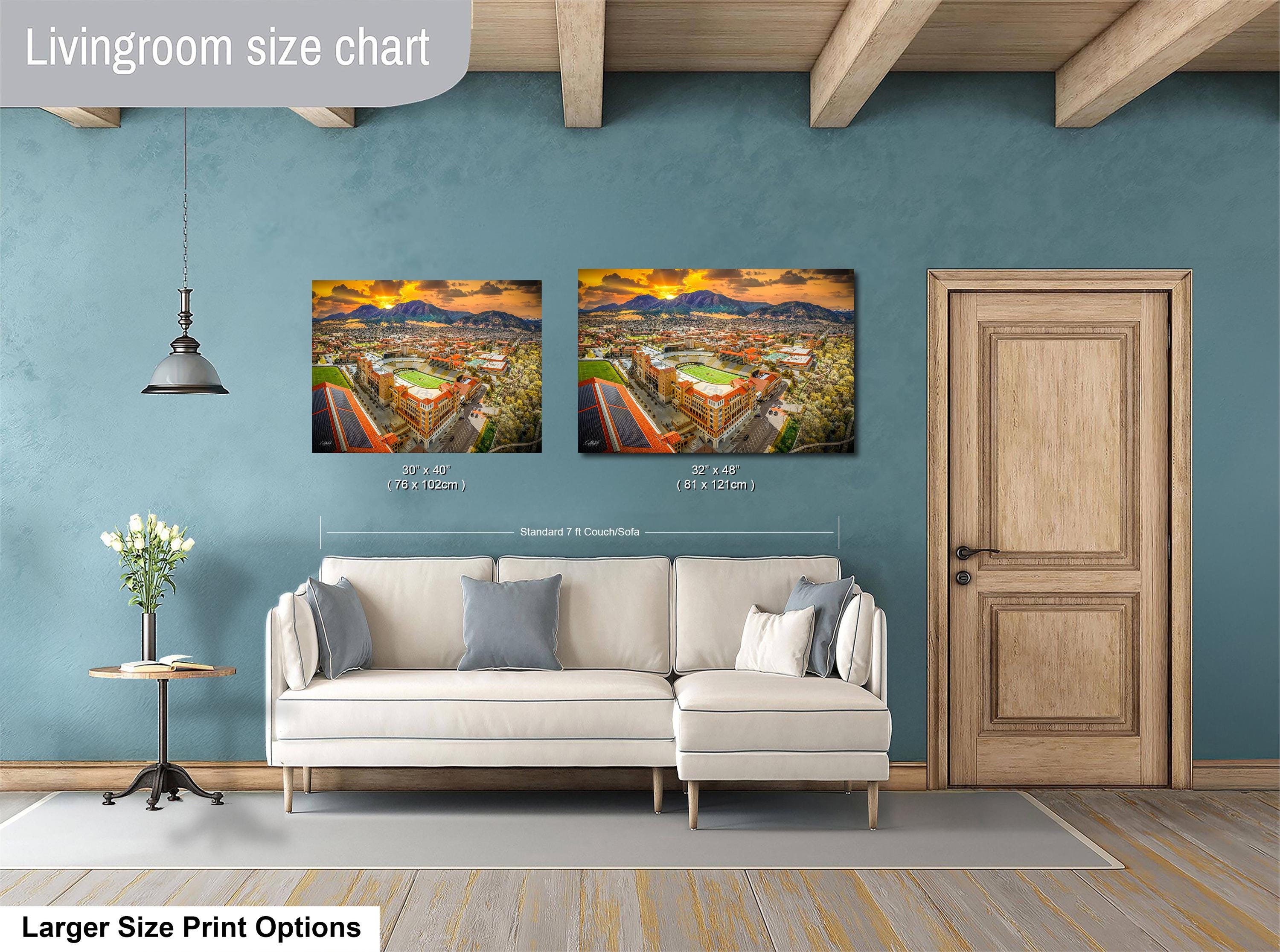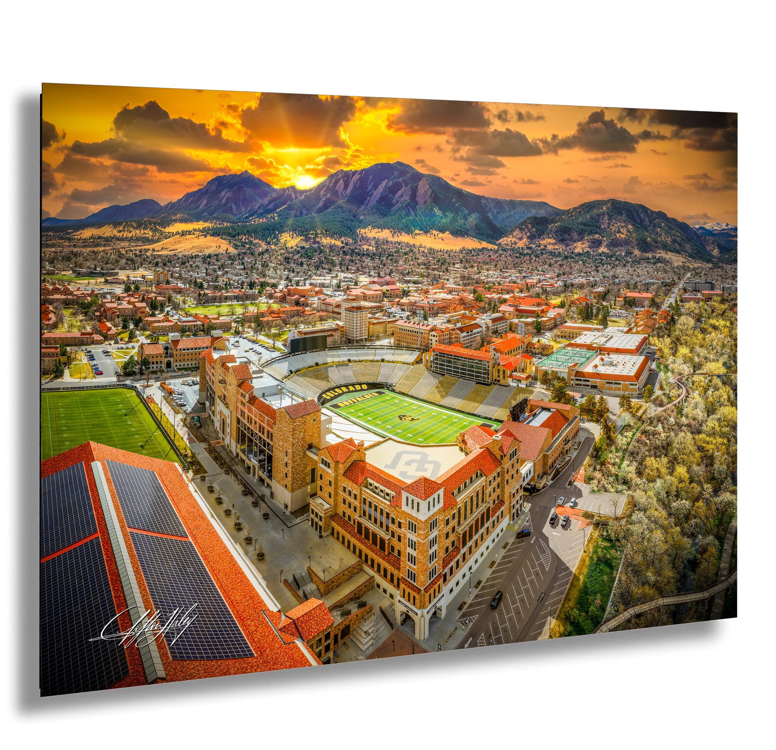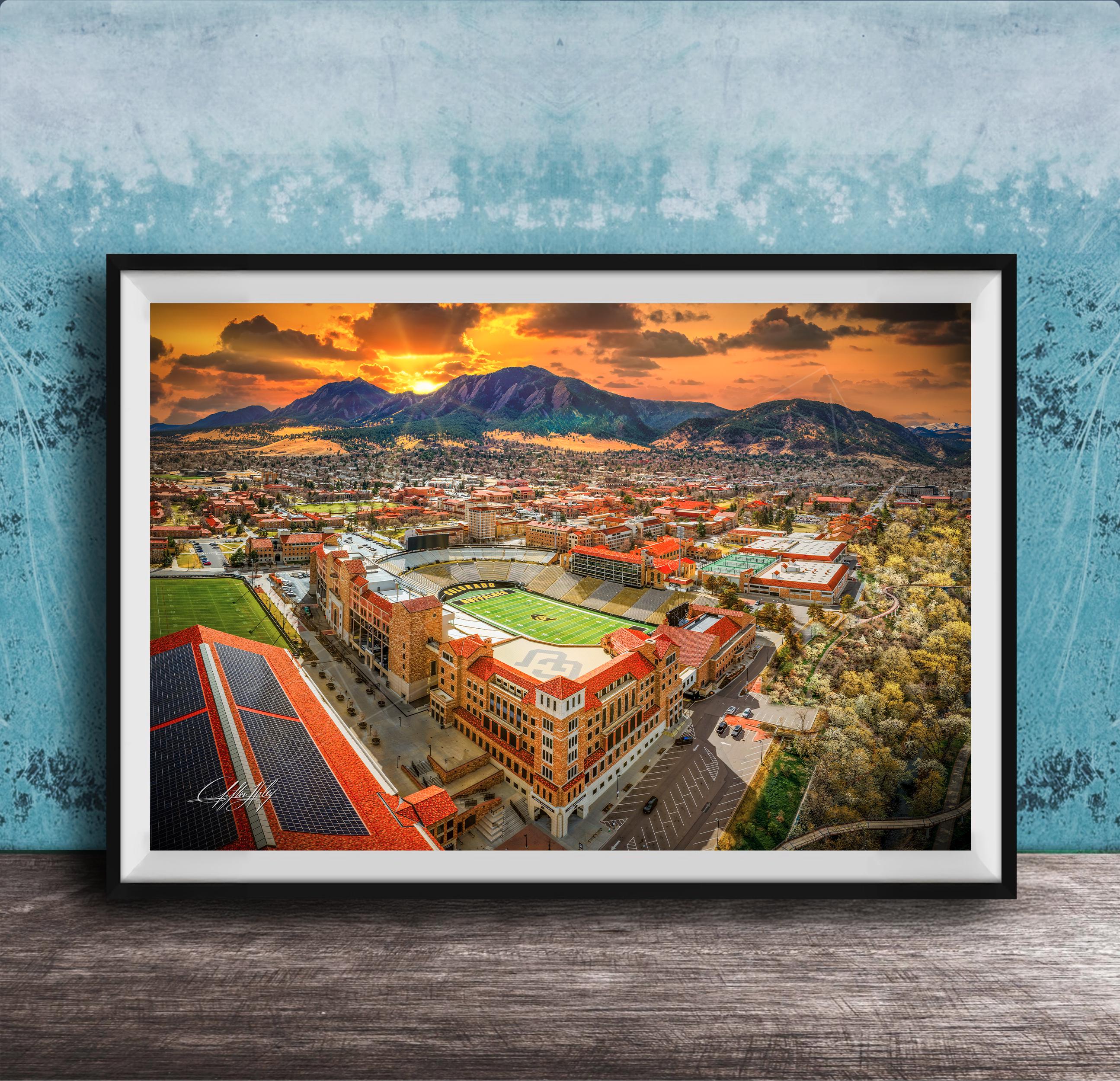 Experience the spirit of Colorado University captured in this striking fine art print, where the iconic Folsom Field and the majestic Rocky Mountains come alive at sunset. This piece celebrates the Buffalos' deep connection to their Boulder campus, blending collegiate pride with the natural beauty of the surrounding landscape. Perfect for those seeking a unique addition to their sports office or a tribute to Colorado alumni, this artwork brings the vibrant energy of NCAA stadium art into any space.