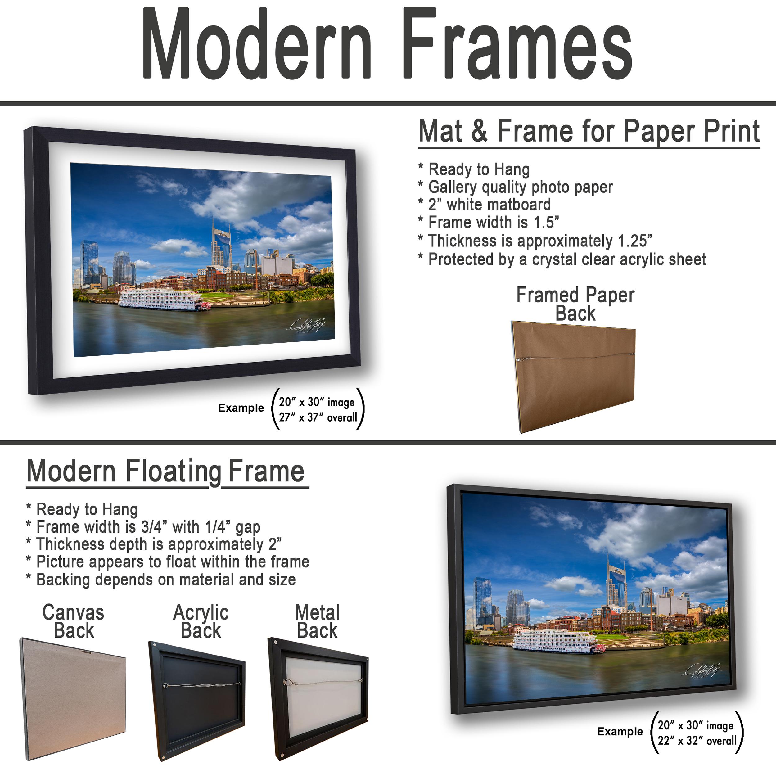 3.2) Canvas, acrylic and metal framed prints will be mounted on a "floating" style frame.