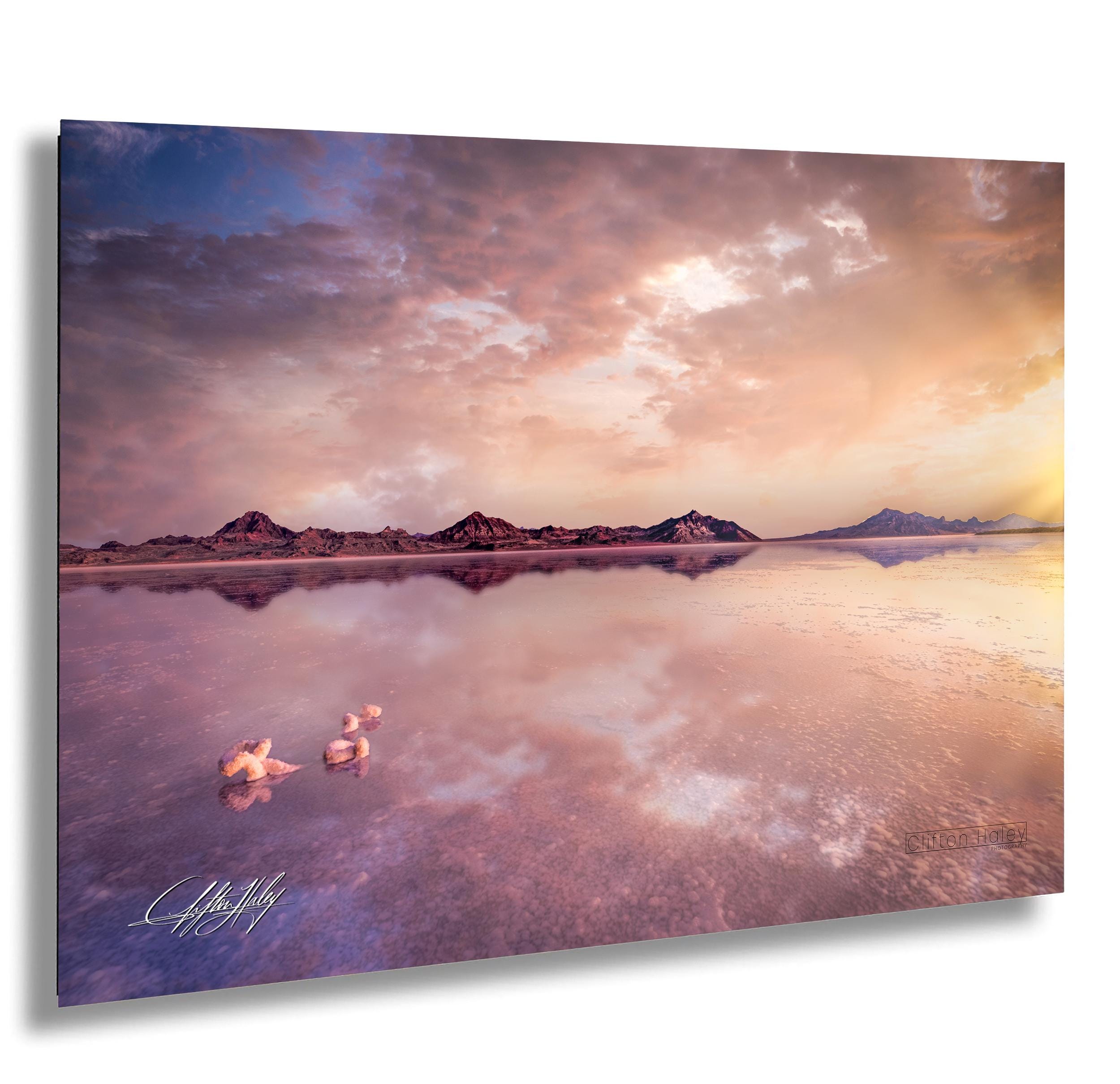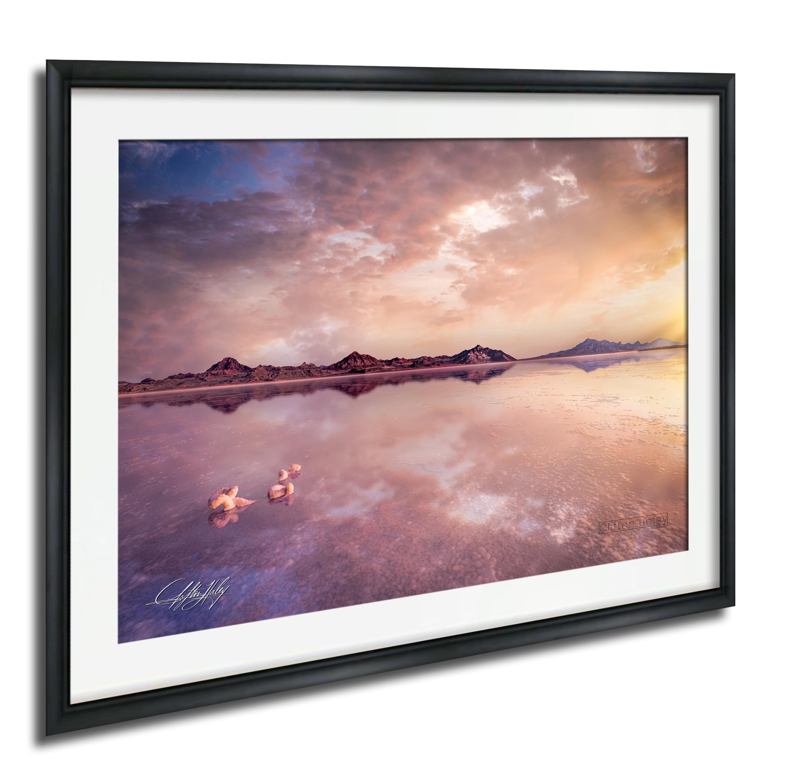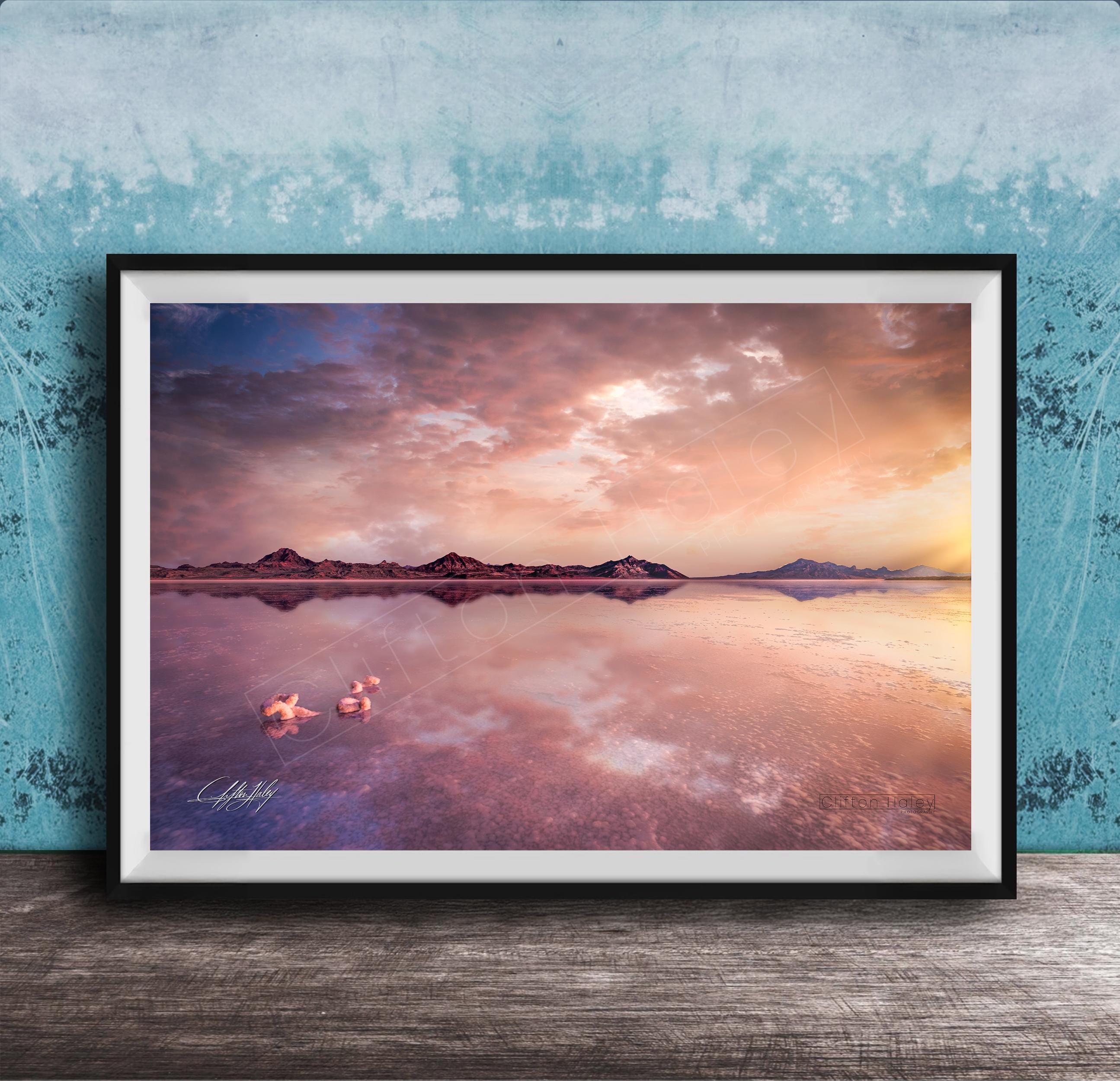 Experience the breathtaking beauty of Bonneville Salt Flats sunrise photo print, capturing a serene pink sky landscape that transforms any space with its tranquil outdoor photography charm. This fine art photo print brings a unique touch of nature wall decor, perfect for those who appreciate racing cars decor or desert sunrise gifts.