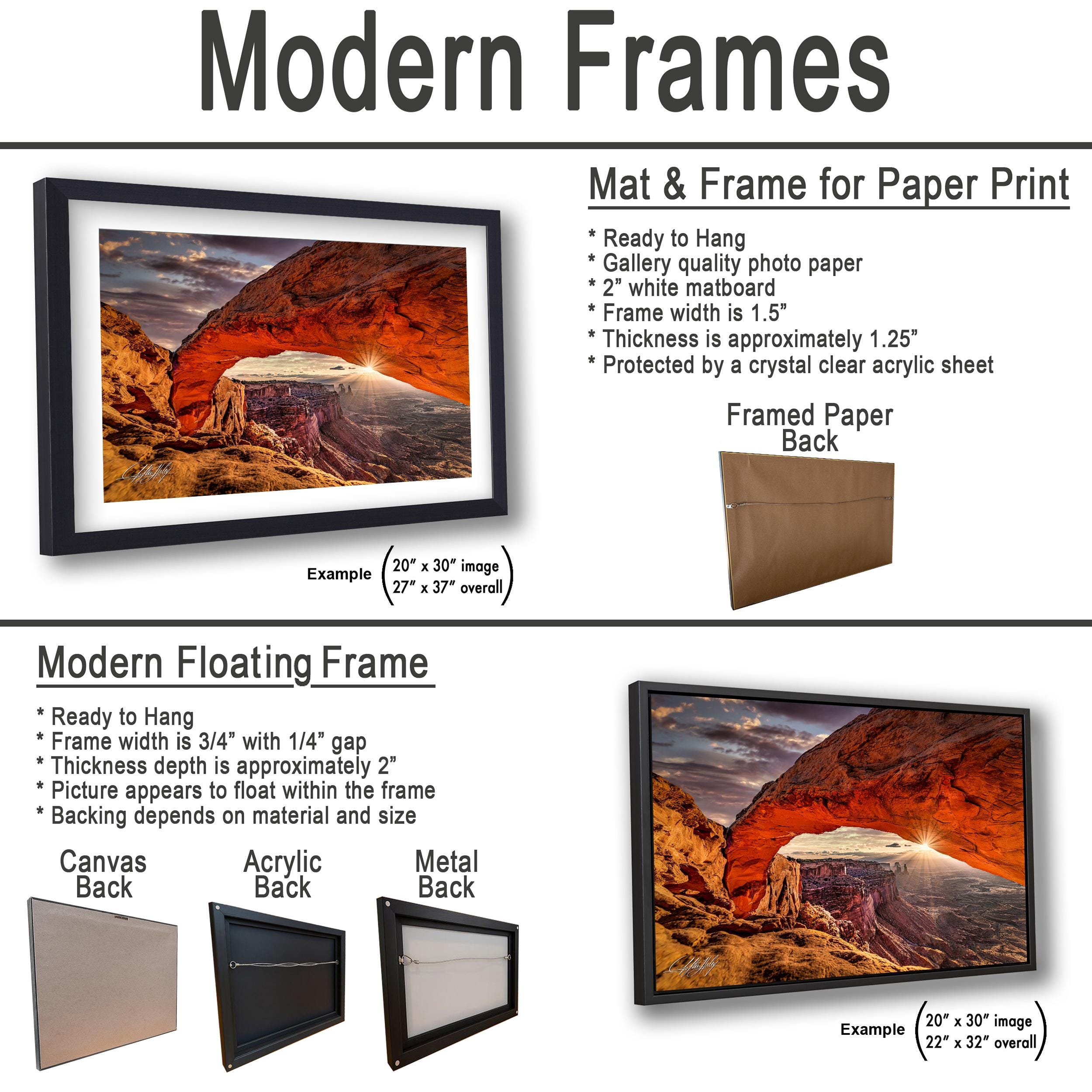 3.1) Only framed paper prints, acrylics and aluminum/metal prints will have a 2" white mat border. 3.2) Canvas prints will be a flush mounted (no mat border) to the frame.