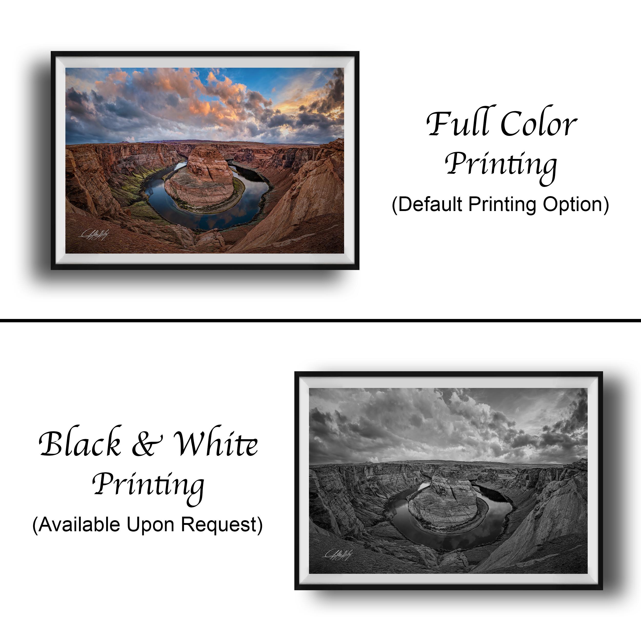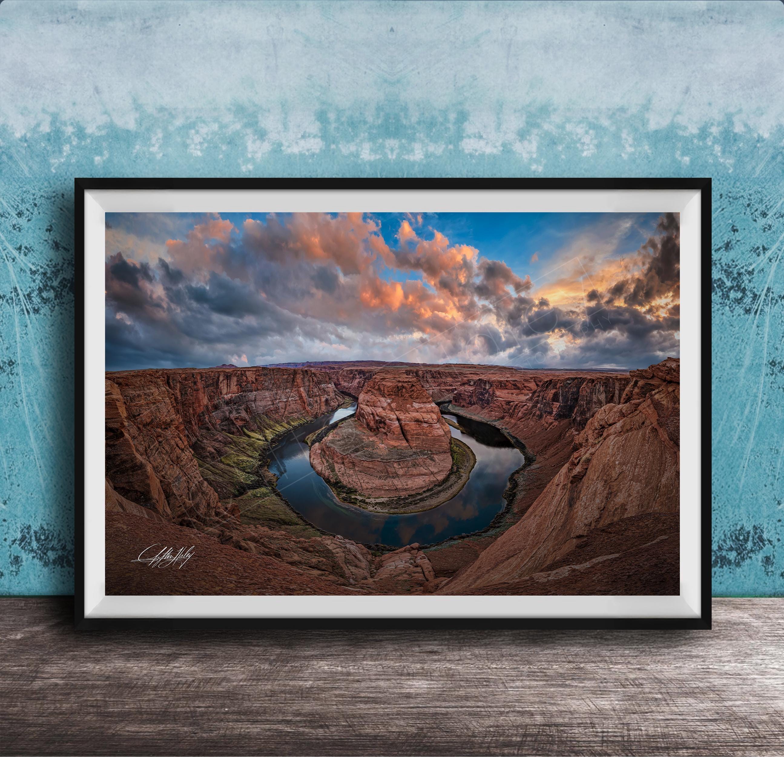 This fine art photography print showcases the iconic Horseshoe Bend, a natural wonder that transforms with golden light and vivid hues at sunrise and sunset. Perfect for lovers of desert landscape art and southwest decor, this unique photo print brings the scenic canyon view into your home or office.