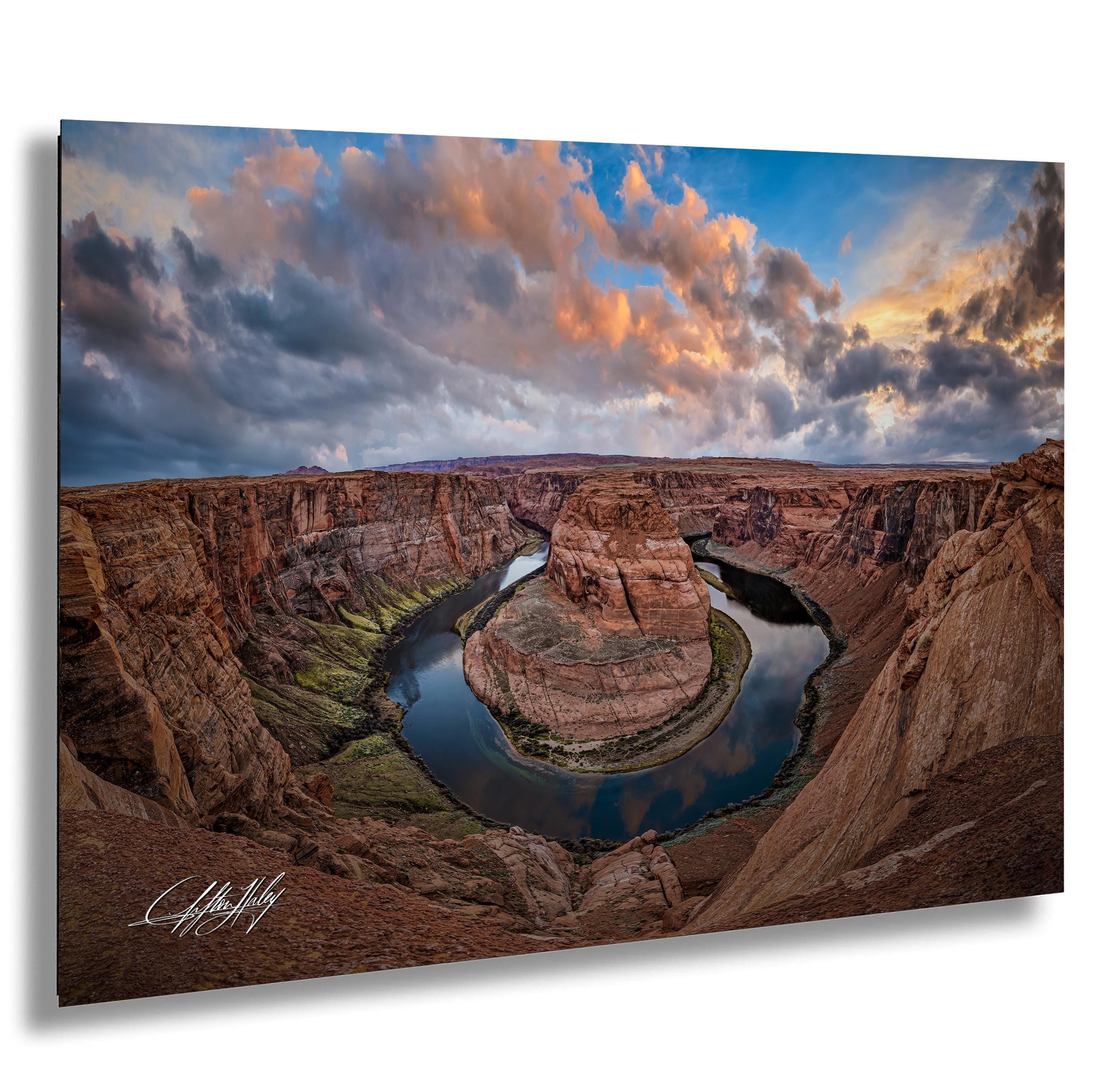 Experience the breathtaking beauty of Horseshoe Bend with this stunning Arizona wall art, capturing colorful landscapes and the warm glow of sunrise in vibrant metal art.