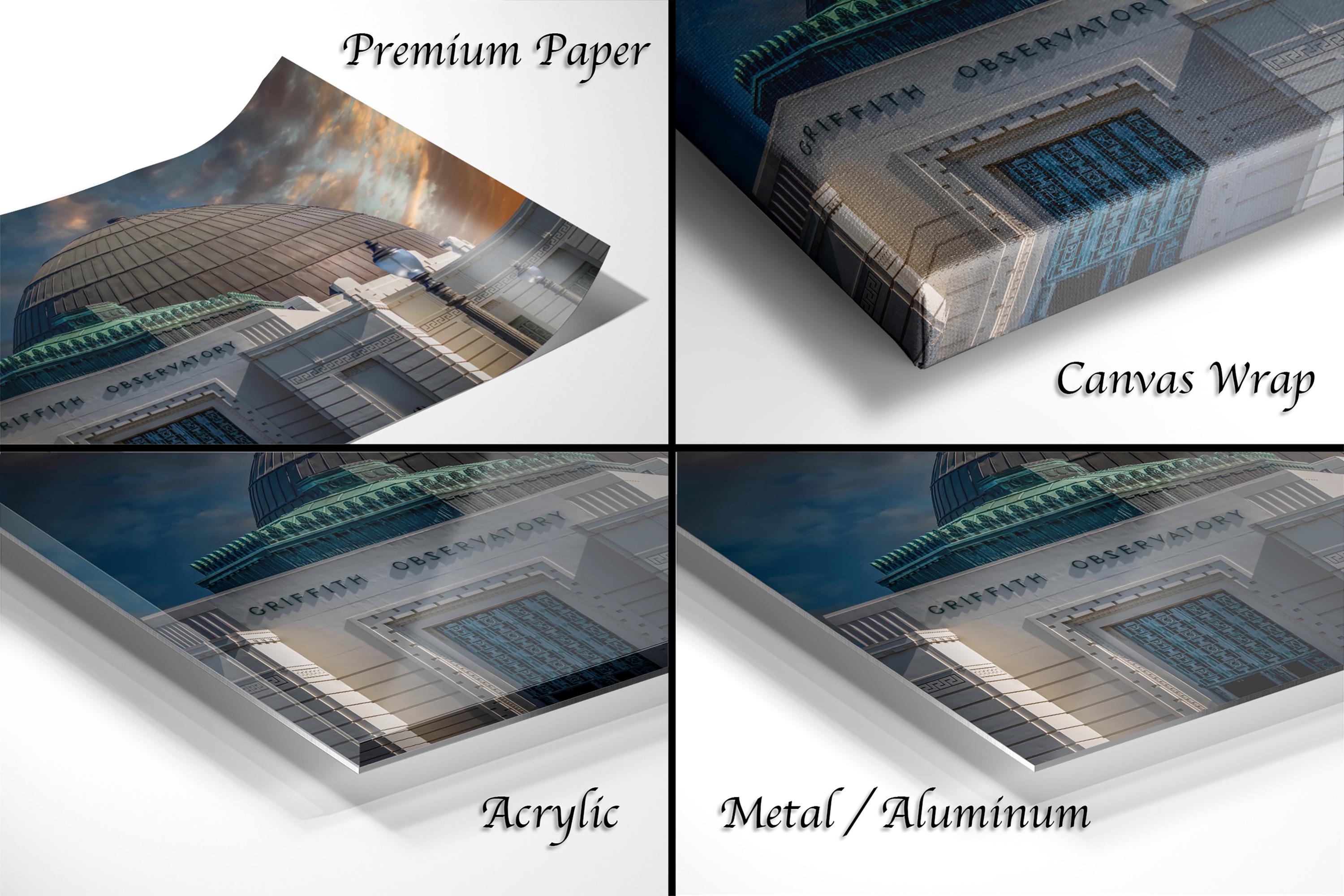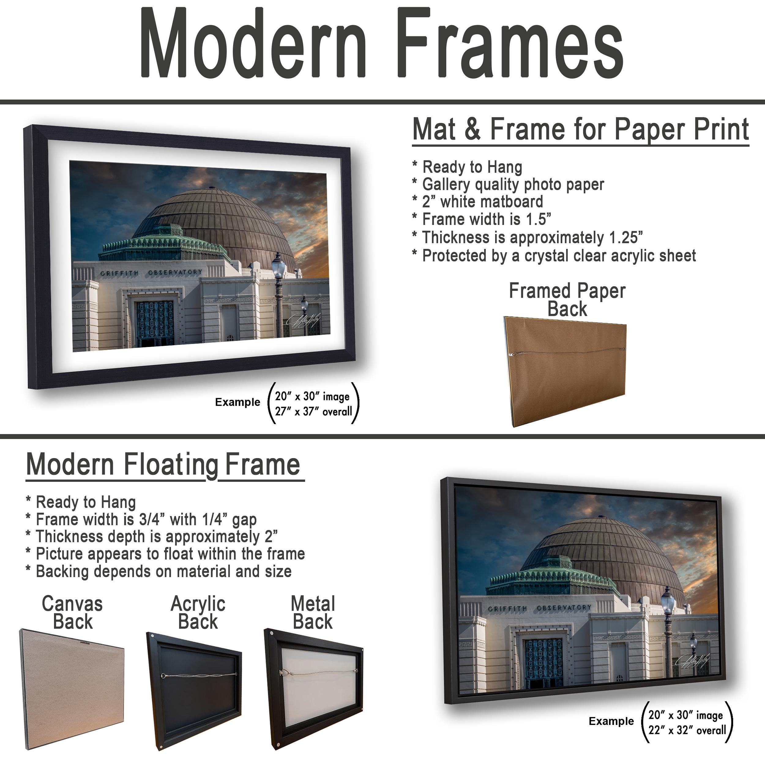 3.1) Only framed paper prints, acrylics and aluminum/metal prints will have a 2" white mat border. 3.2) Canvas prints will be a flush mounted (no mat border) to the frame.