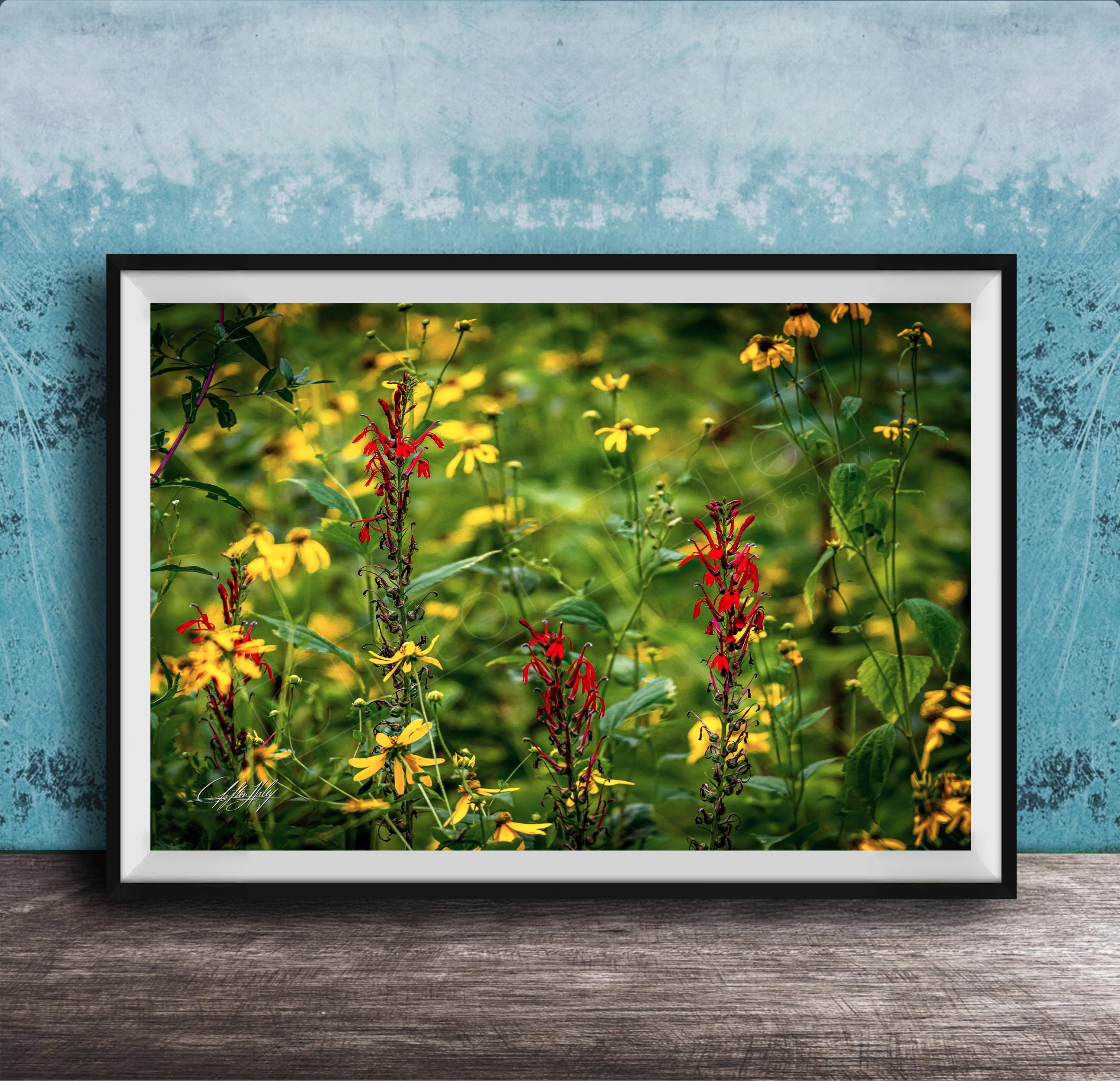 Immerse yourself in the scenic mountain view of Cades Cove with this exquisite wildflower landscape print. Each image is a unique photography artwork showcasing summer flower fields in their natural habitat, making it an ideal nature wall decor piece.