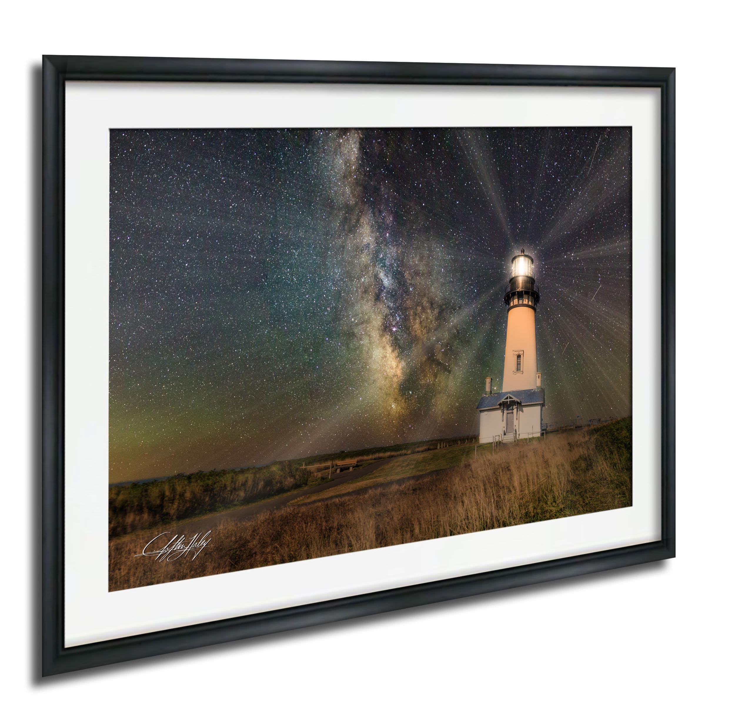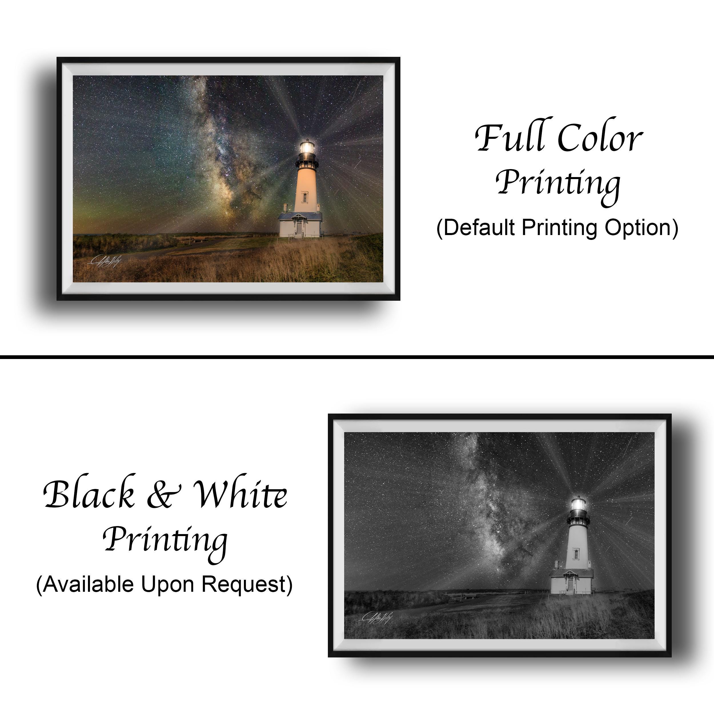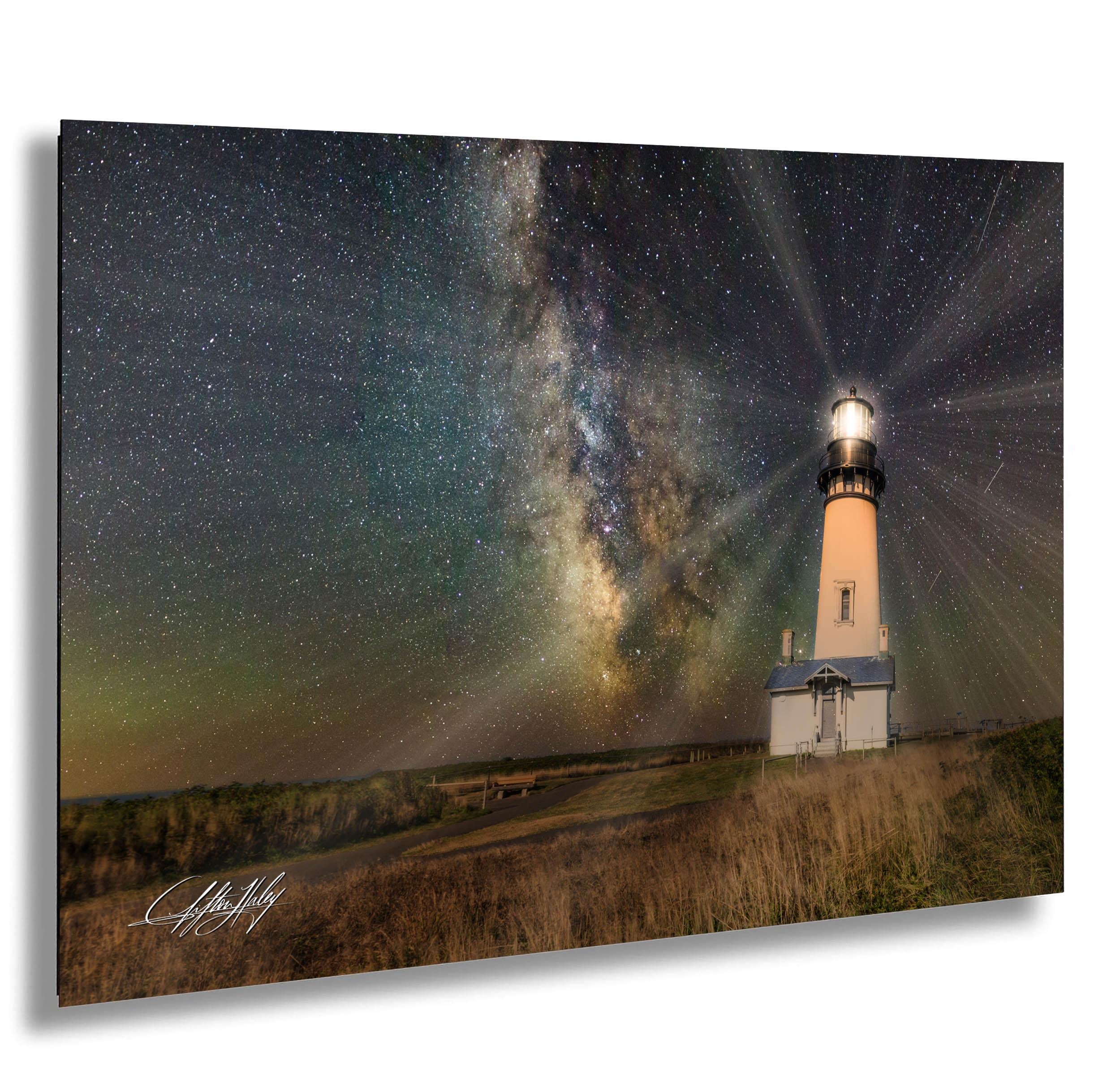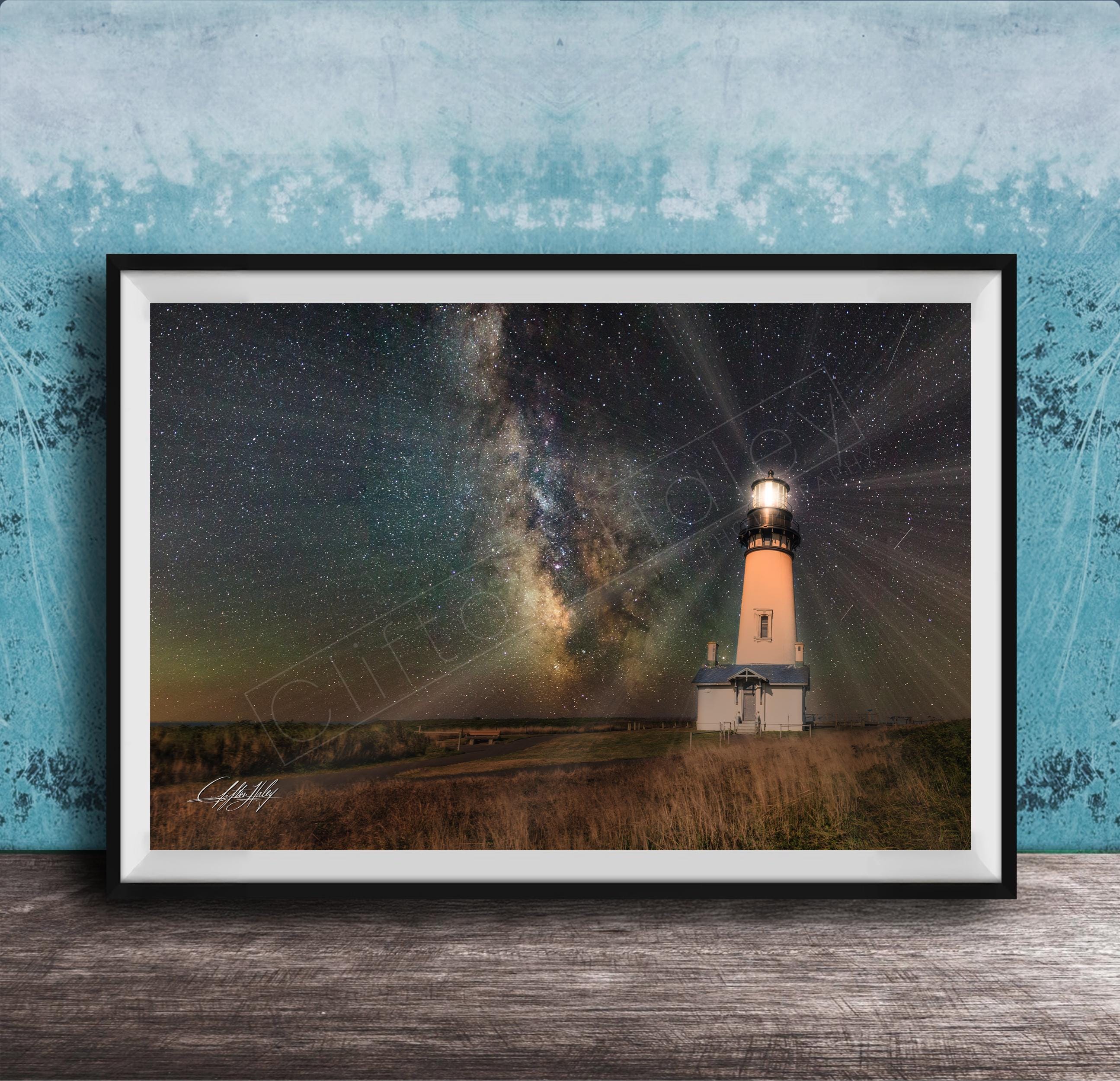 As the sun dipped below the horizon, this custom fine art print immortalizes the majestic Yaquina Lighthouse perched atop a rugged cliff. The scene showcases the crashing waves of the Pacific Ocean, a celestial river of stars in the Milky Way sky, and the iconic beacon light guiding ships safely. Every detail—from the rocky path leading to the lighthouse to the star-studded sky—is captured with precision and passion.