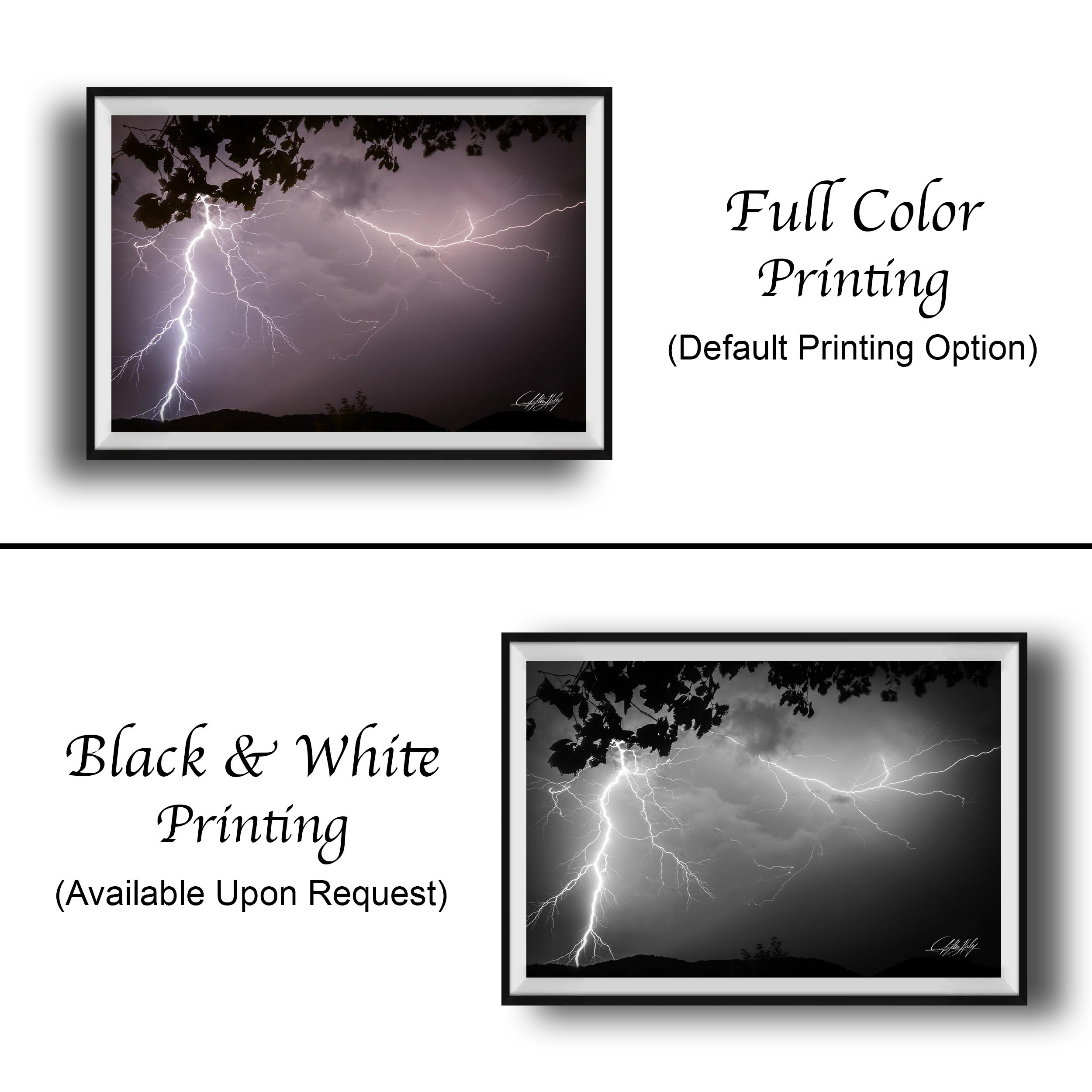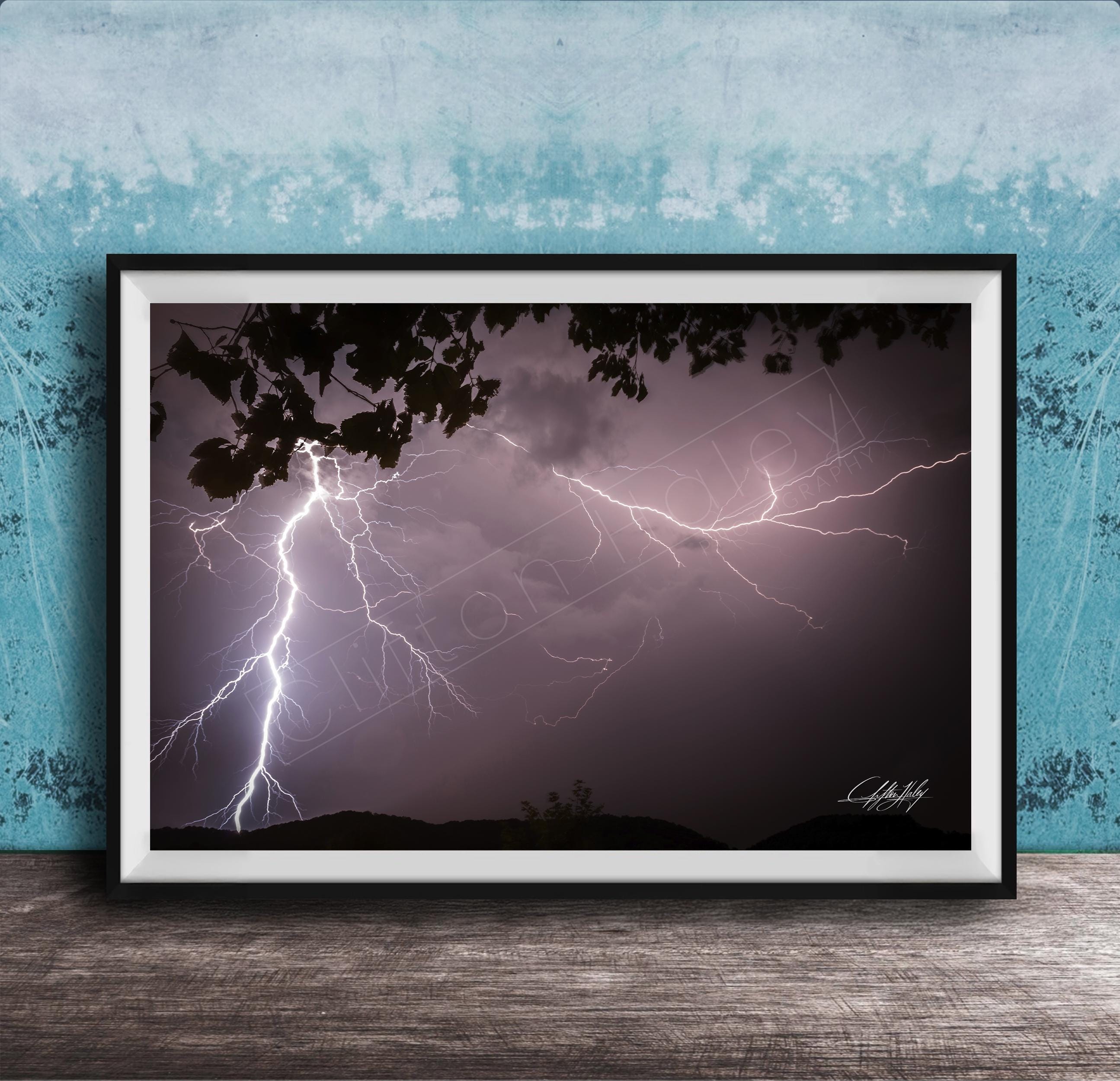 Witness the fierce beauty of nature with this striking lightning storm art, capturing a dramatic East Tennessee storm in vivid detail. Perfect for enthusiasts of dark sky photography, this artist signed print brings the raw power and electric energy of a powerful storm photo right into your living space. The unique storm artwork tells a story of two paths illuminated by lightning, making it an unforgettable weather wall decor centerpiece.