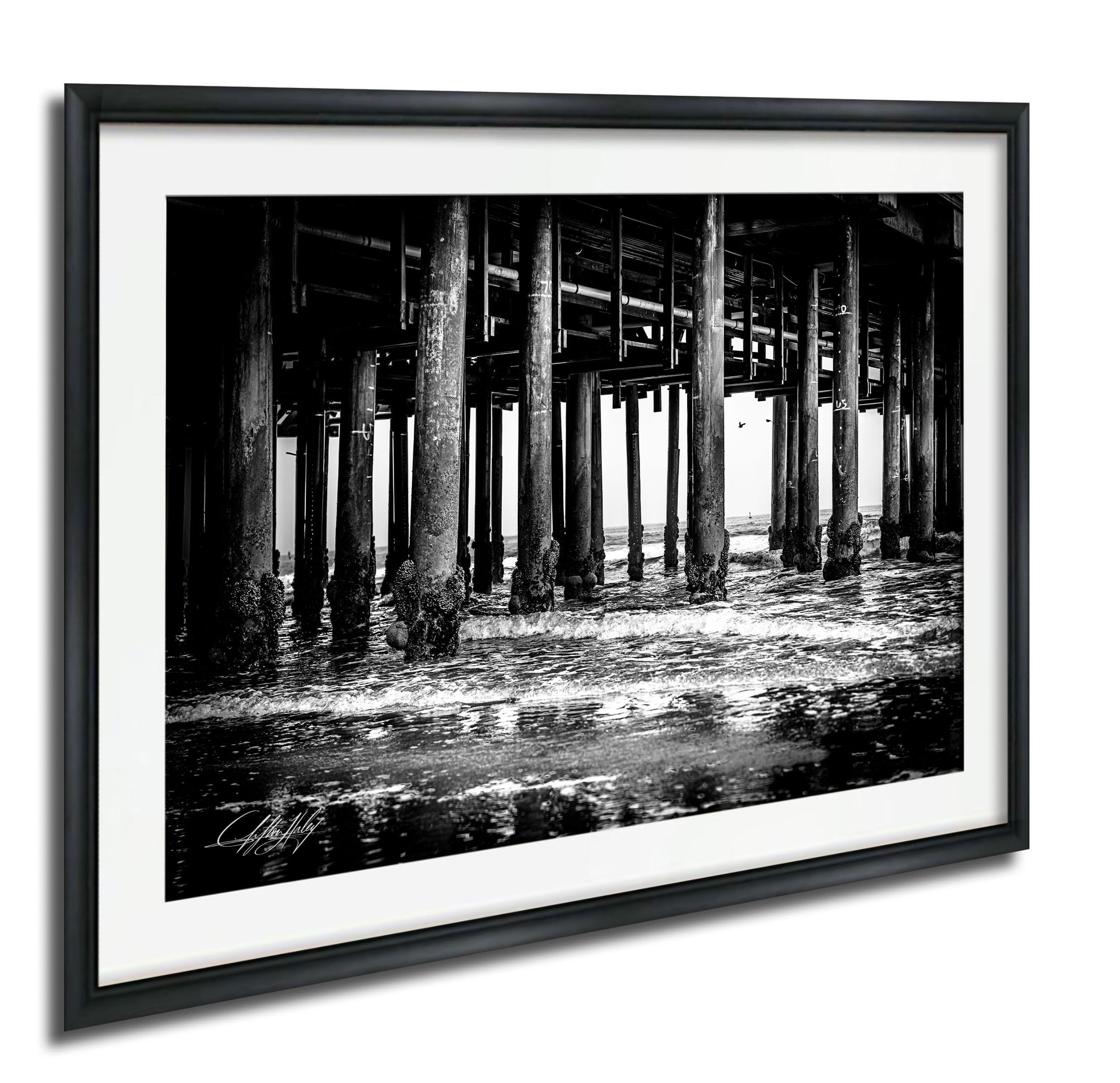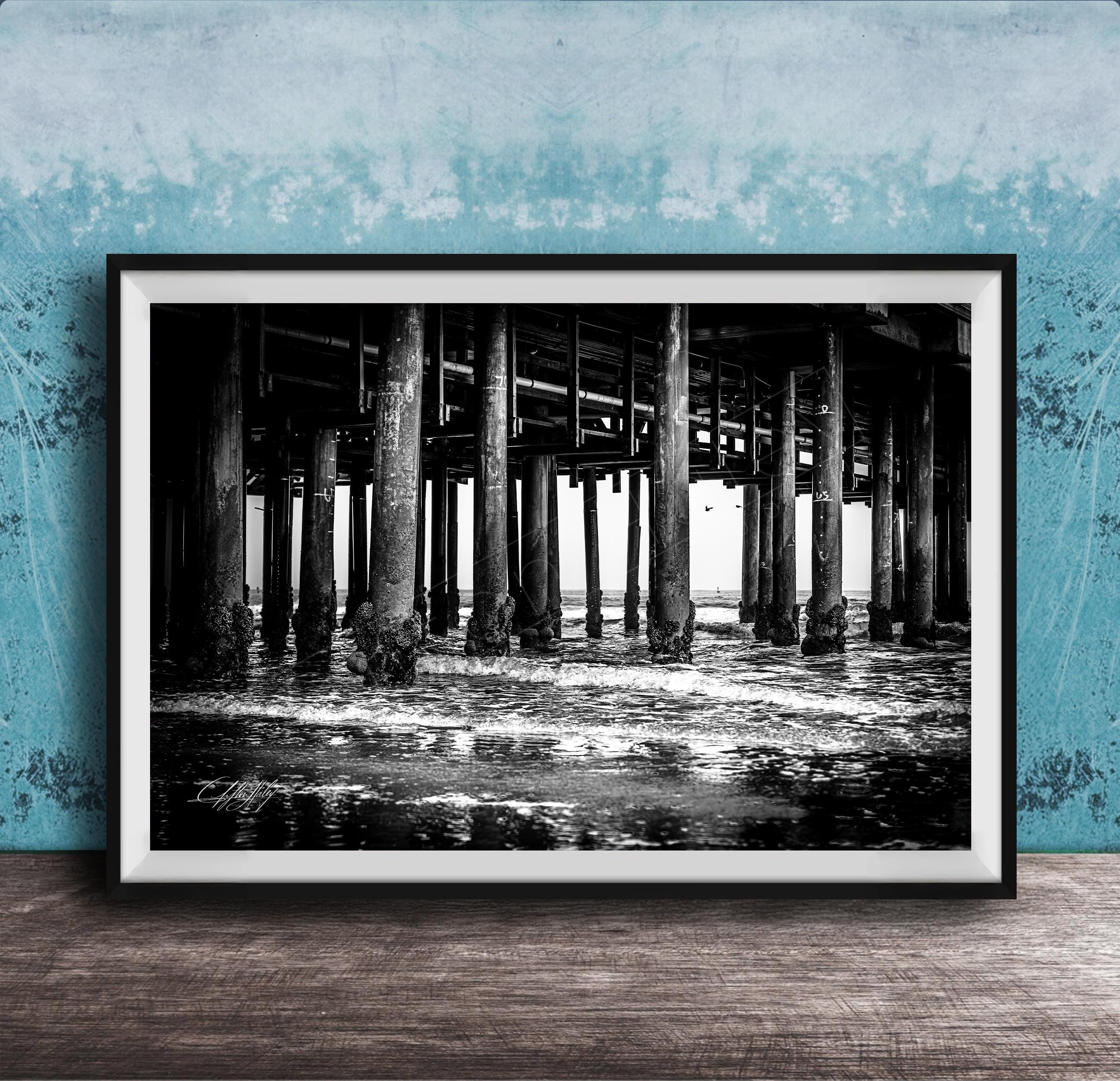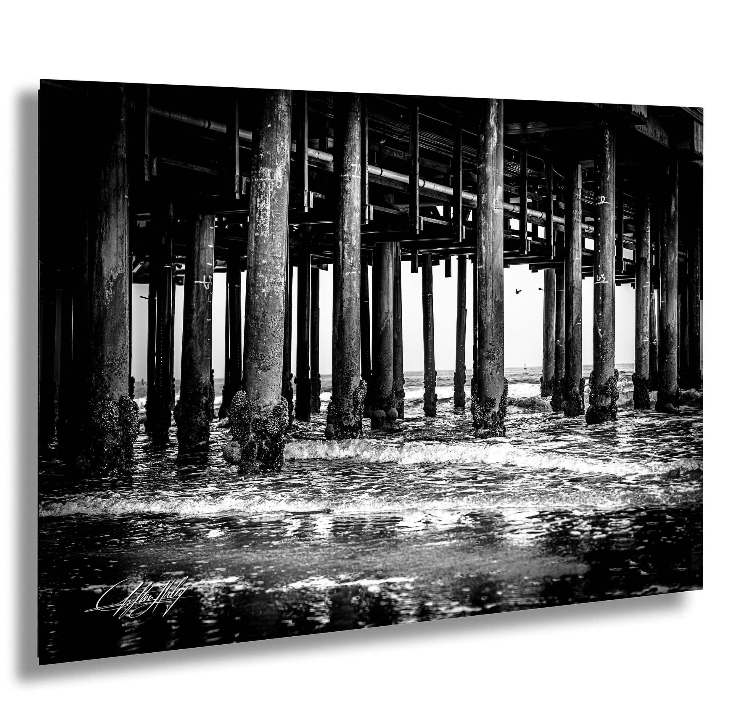 I stand at the edge of the Santa Monica Pier, staring out at the vast expanse of the Pacific Ocean. The sun is just starting to set, casting a warm orange glow across the water. I quickly set up my camera, adjusting the settings for the perfect shot of the underside of the pier.