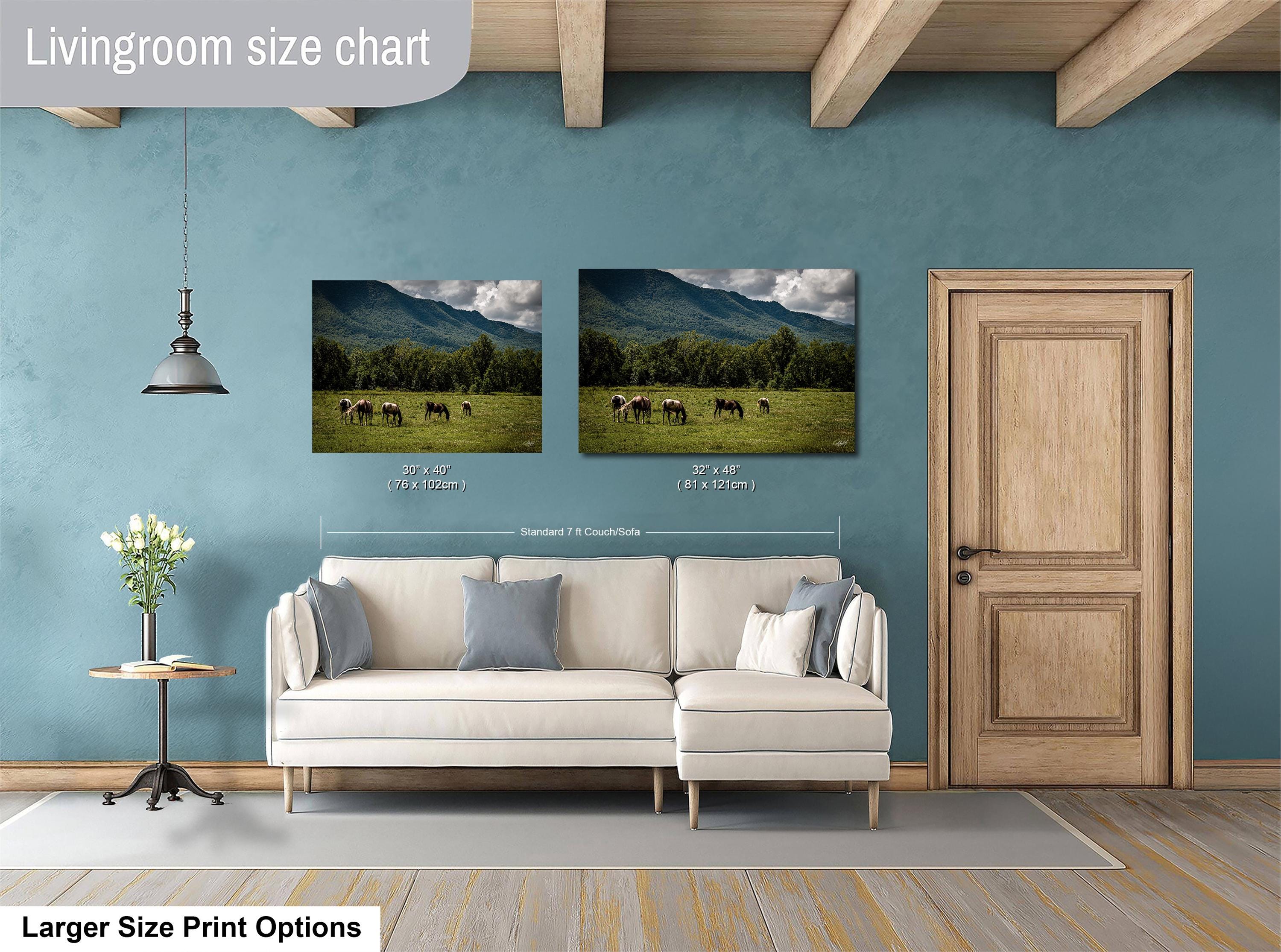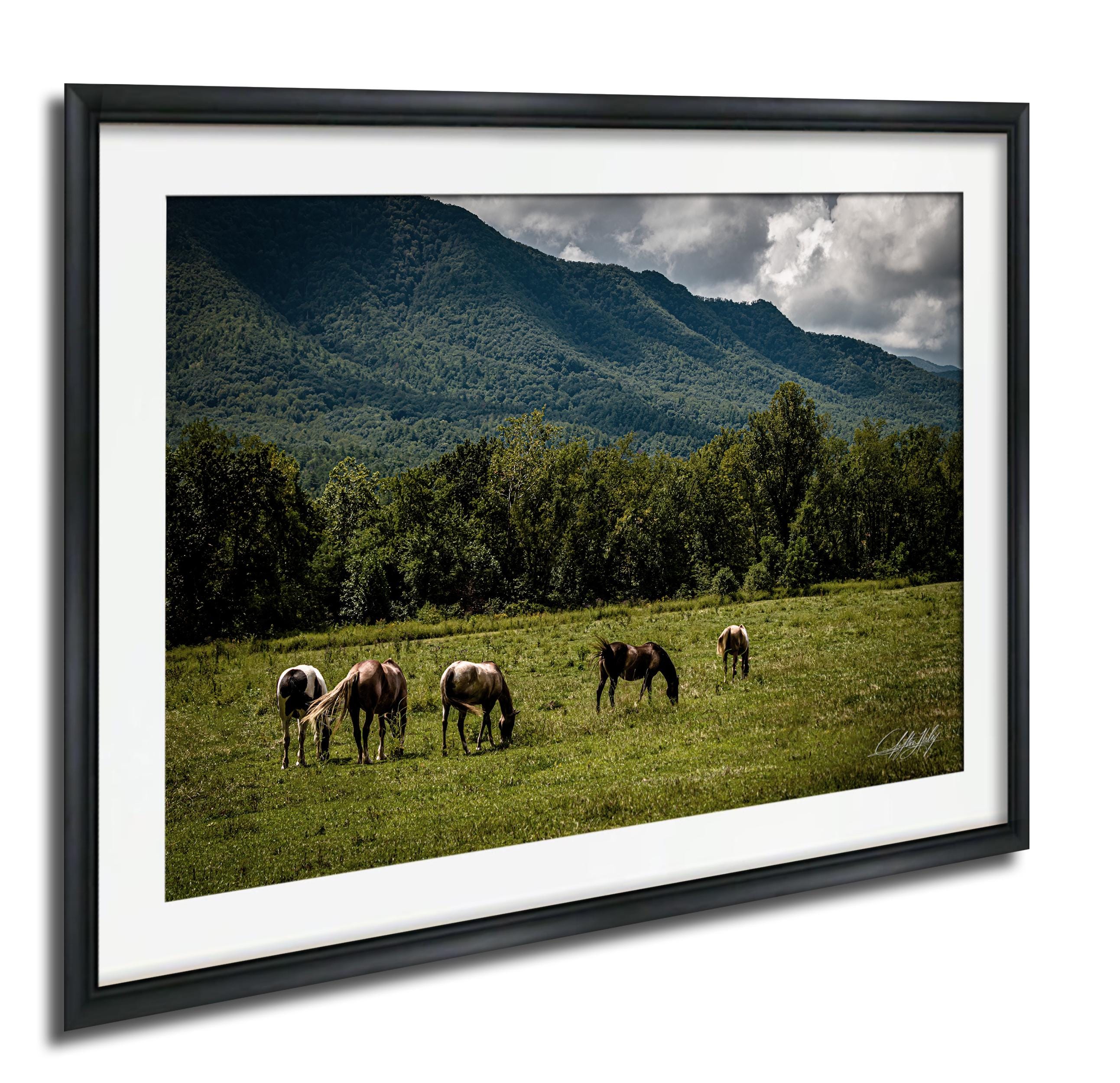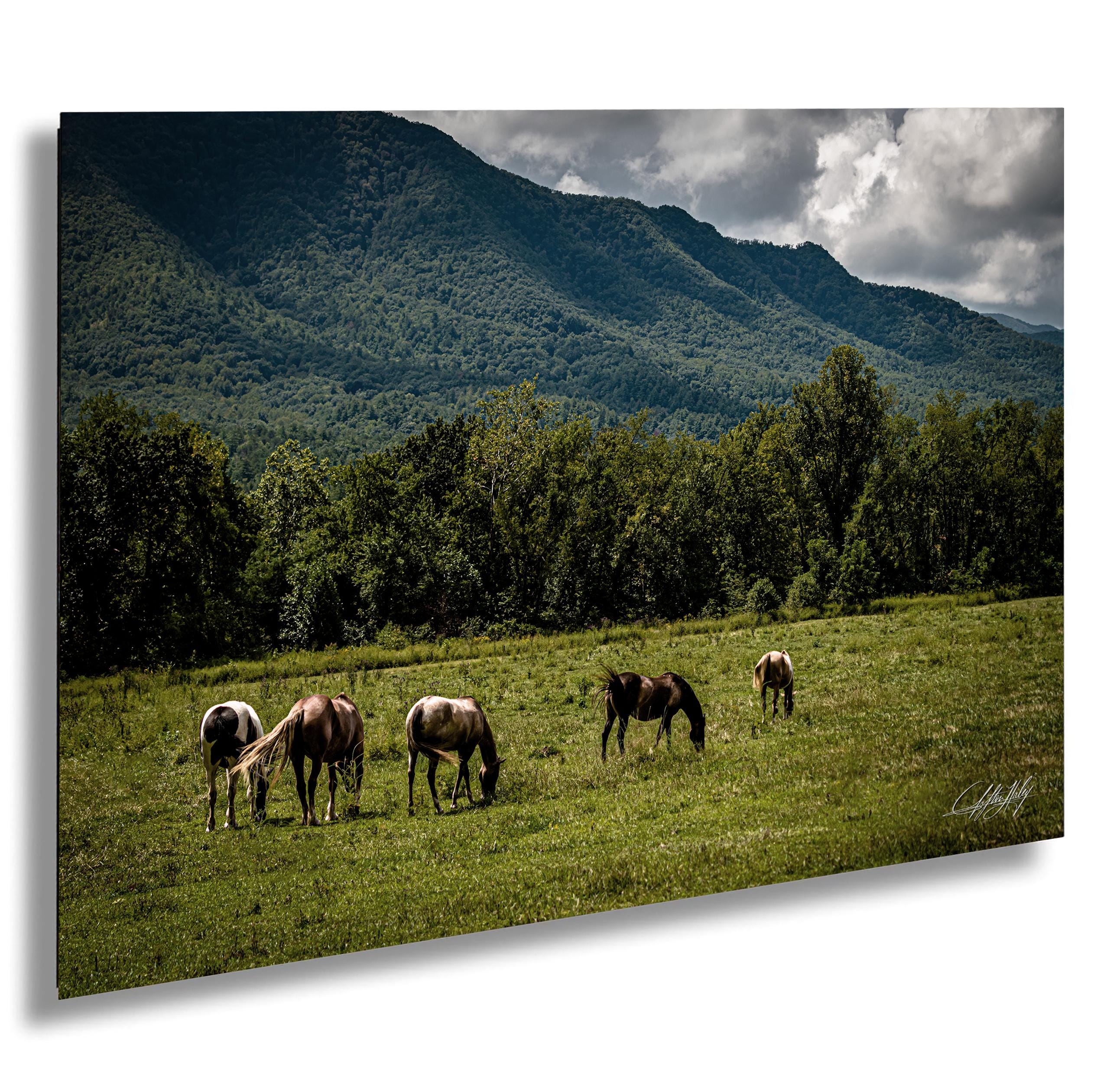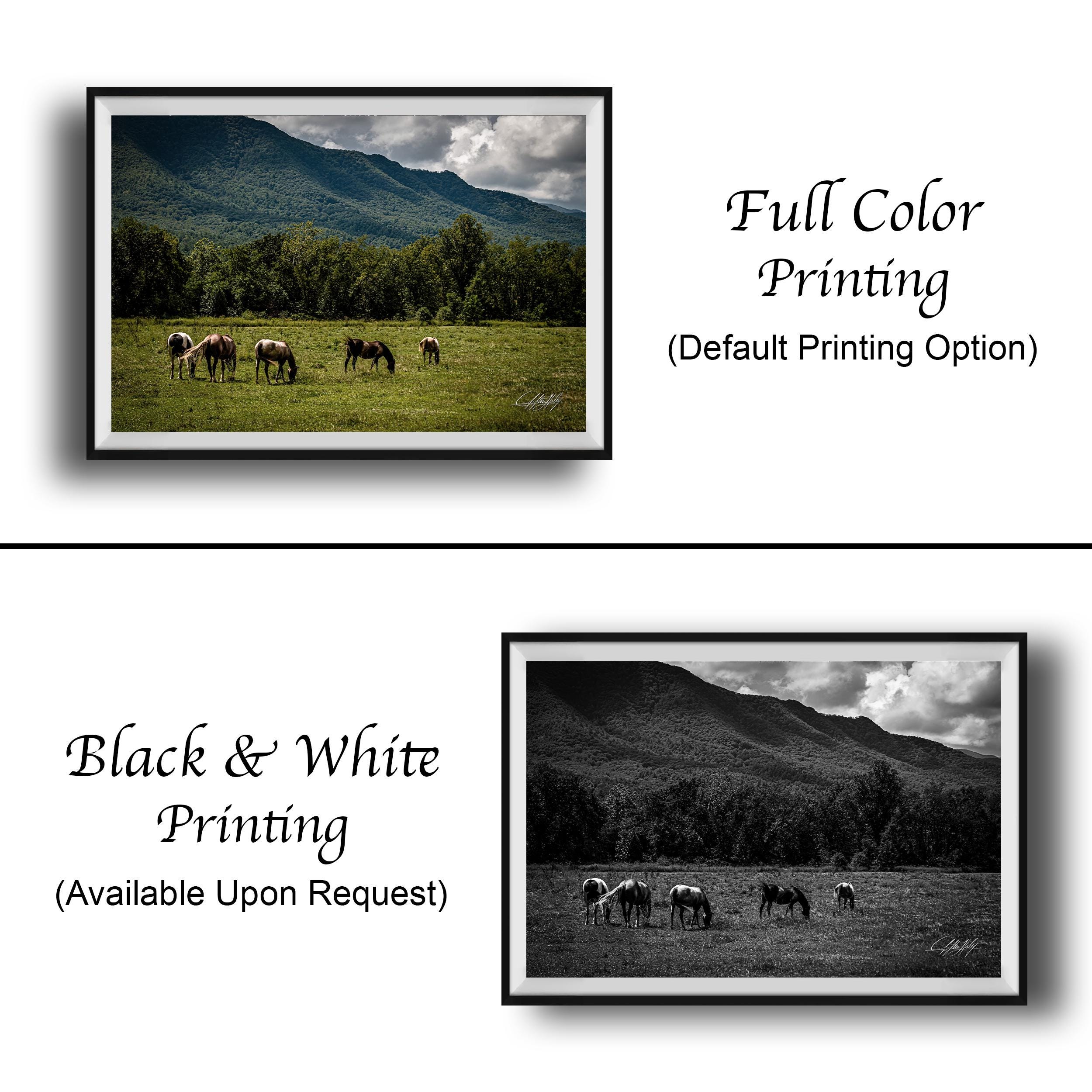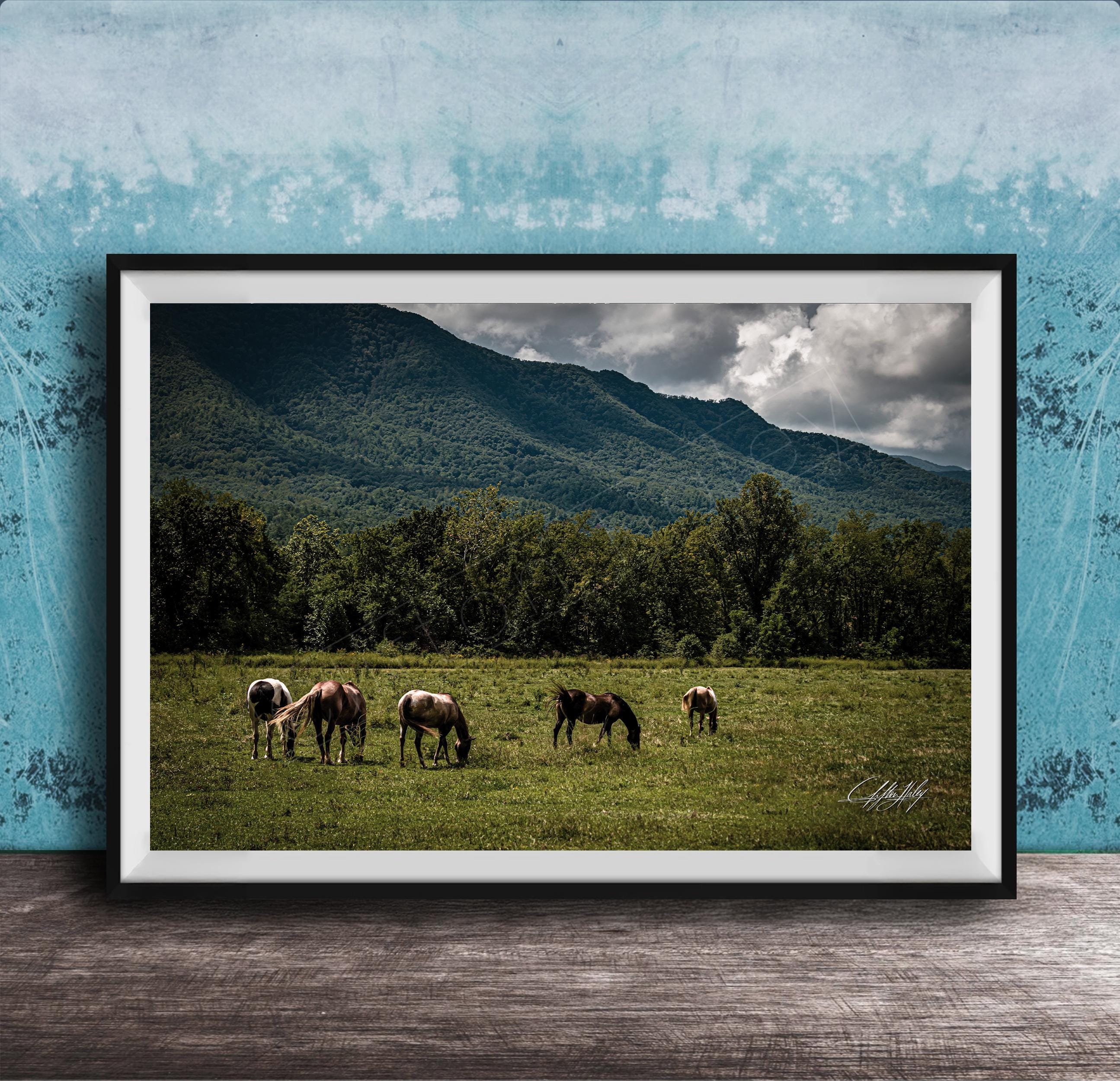 Immerse yourself in the beauty of the Appalachian Mountains with this stunning Cades Cove Horses Print, a perfect blend of East Tennessee Wildlife Art and Rustic Cabin Decor. The intricately detailed horses grazing against a backdrop of lush greenery capture the serene spirit of Cades Cove, making it an exceptional Horse Lover Gift and Scenic Nature Wall Art that elevates any space with authentic charm.