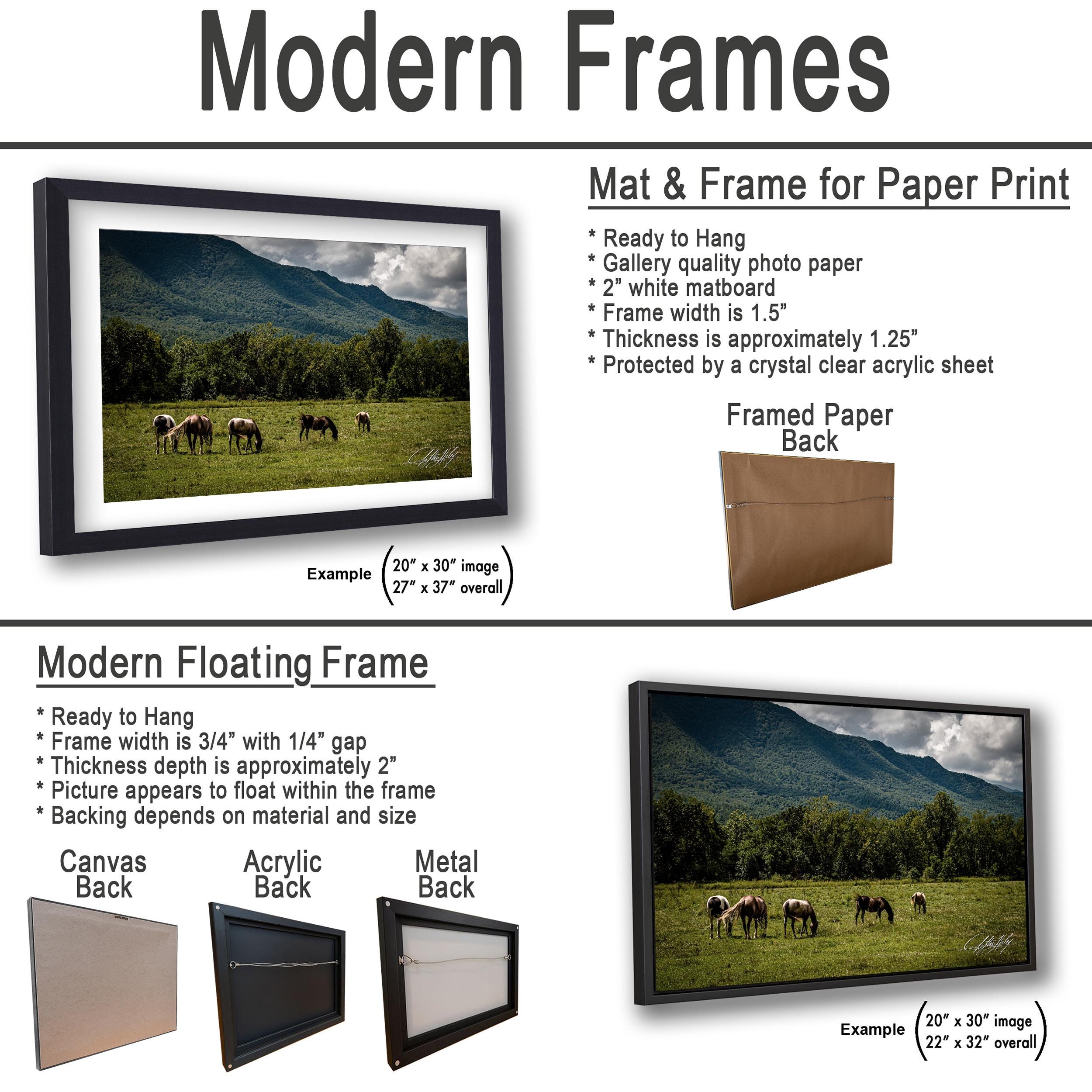 3.1) Only framed paper prints, acrylics and aluminum/metal prints will have a 2" white mat border. 3.2) Canvas prints will be a flush mounted (no mat border) to the frame.