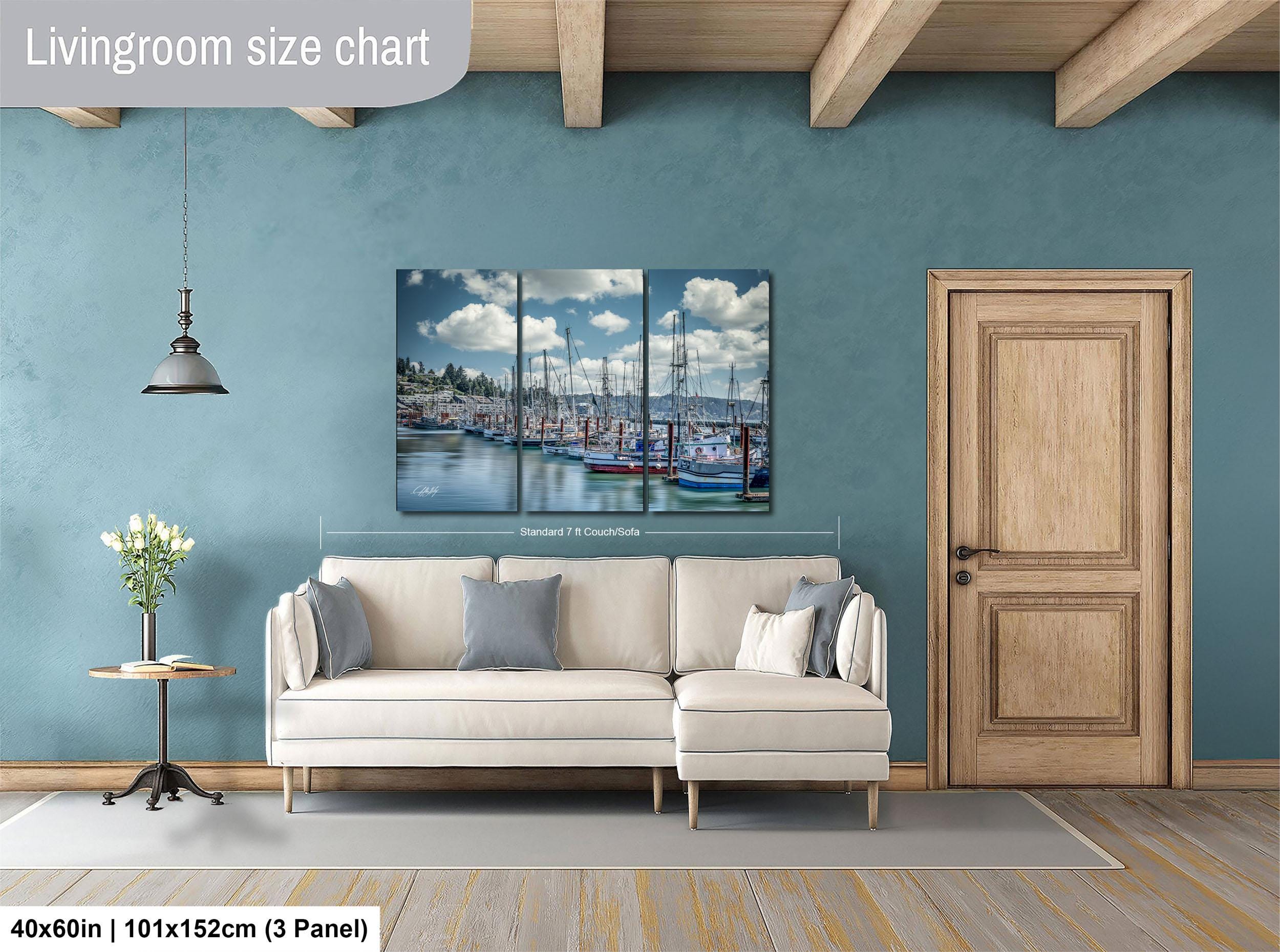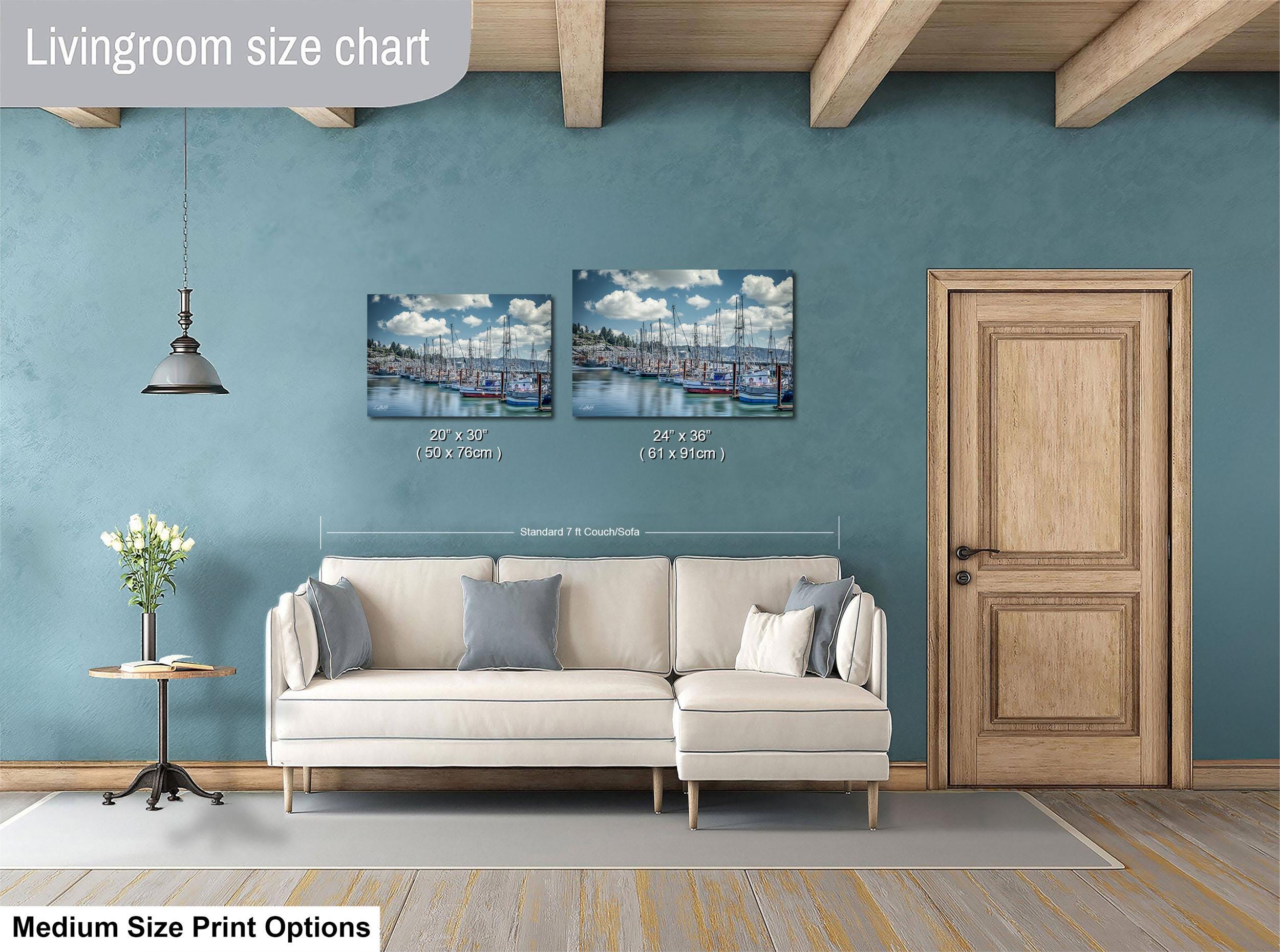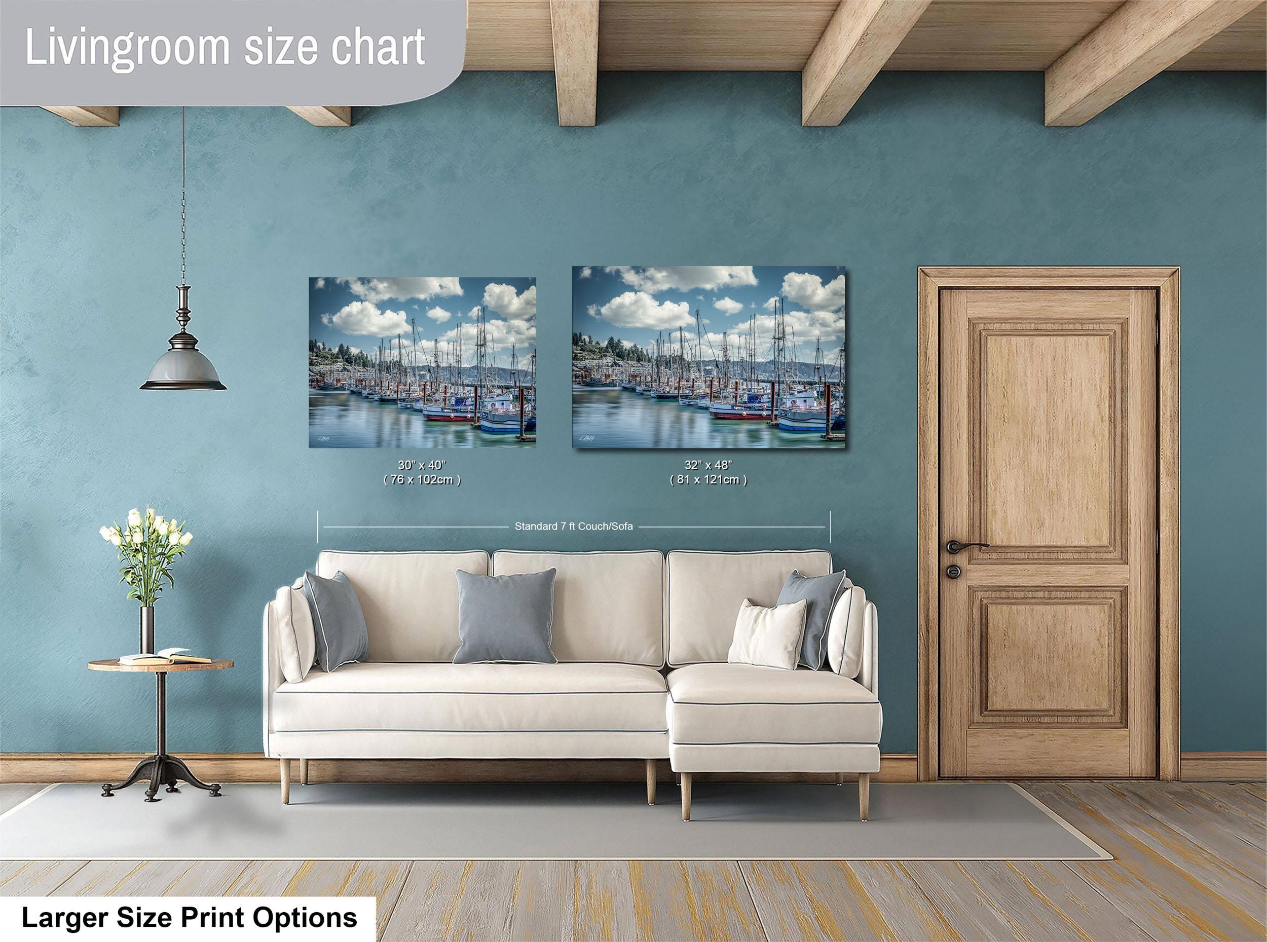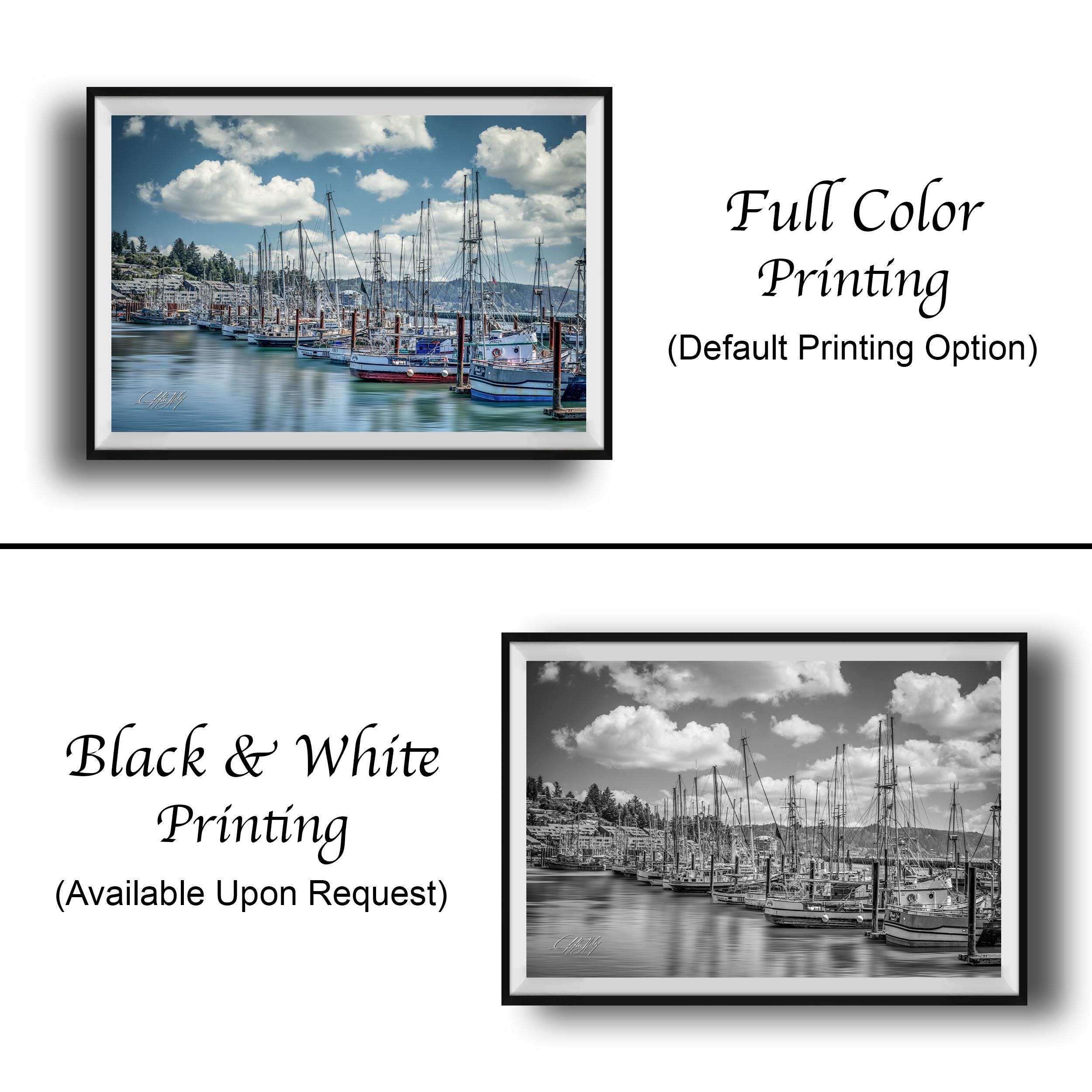 Each photograph is a unique, made-to-order piece that showcases the scenic ocean view and harbor boats gently bobbing on the water. The wooden pier and coastline view add depth and texture to the composition, making it an ideal nautical wall art for lovers of maritime landscapes.