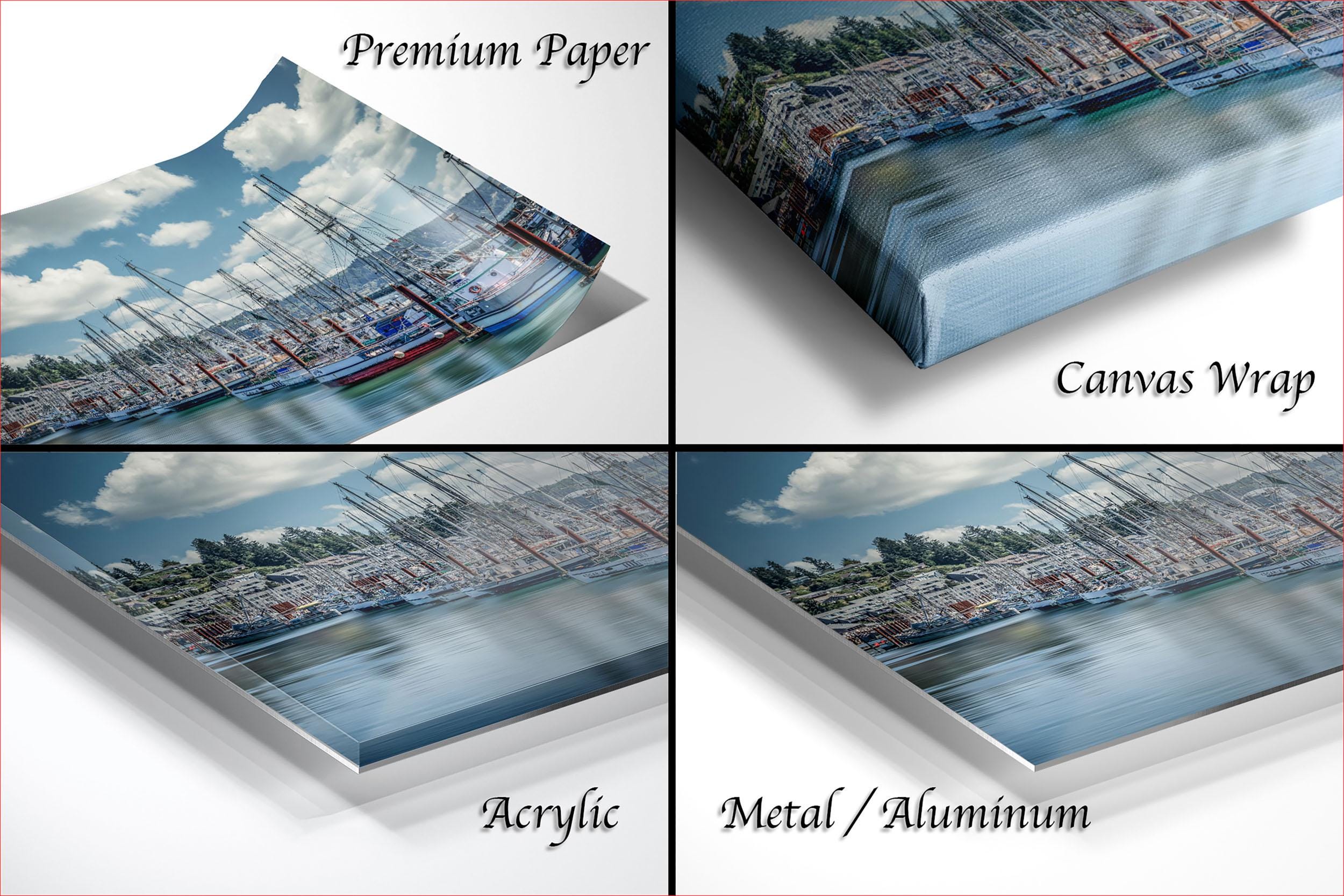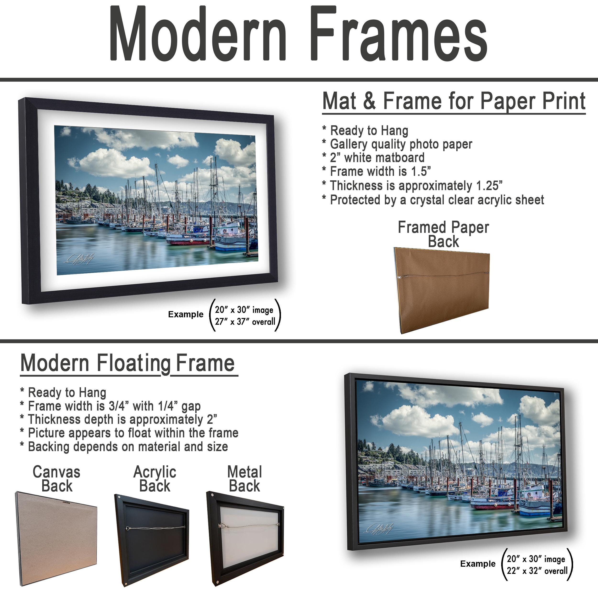3.1) Only framed paper prints, acrylics and aluminum/metal prints will have a 2" white mat border. 3.2) Canvas prints will be a flush mounted (no mat border) to the frame.