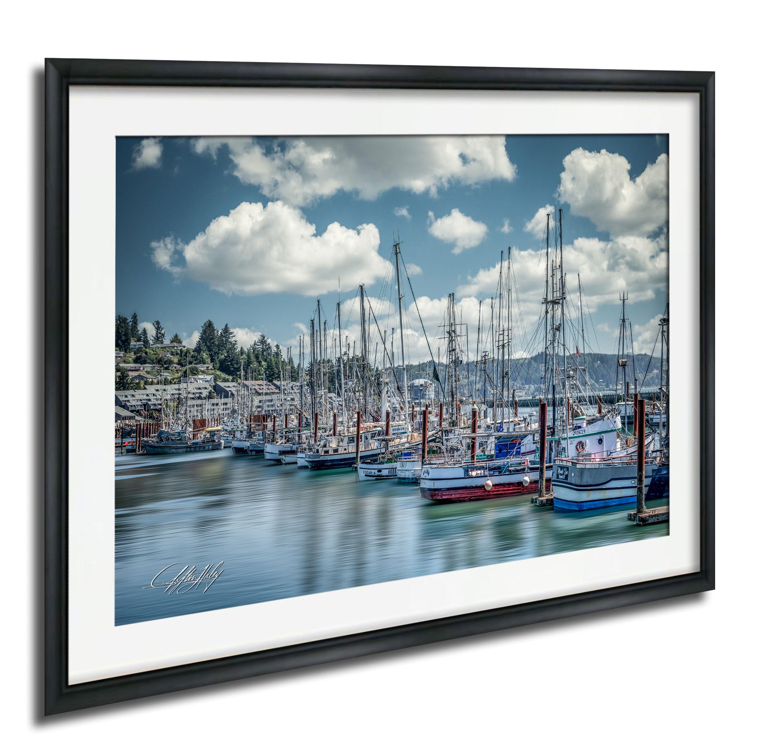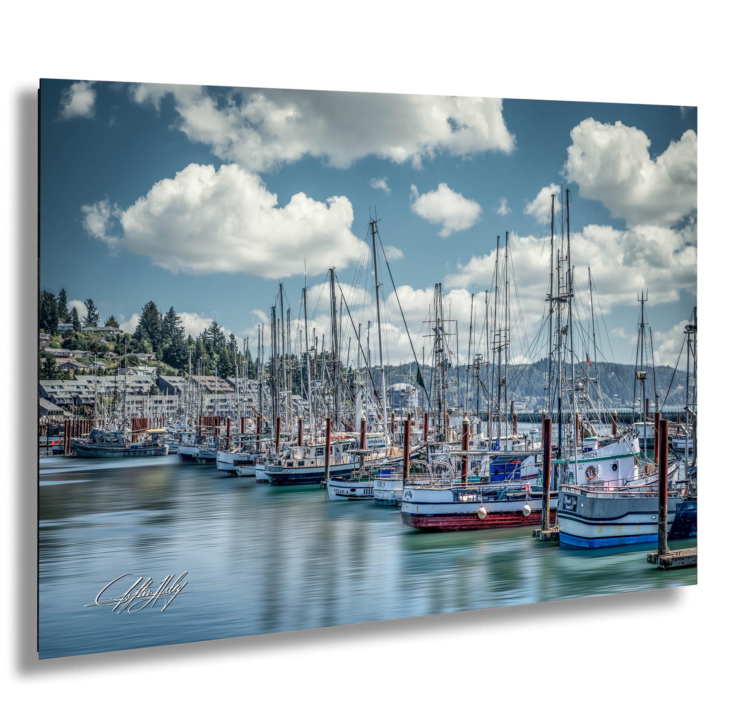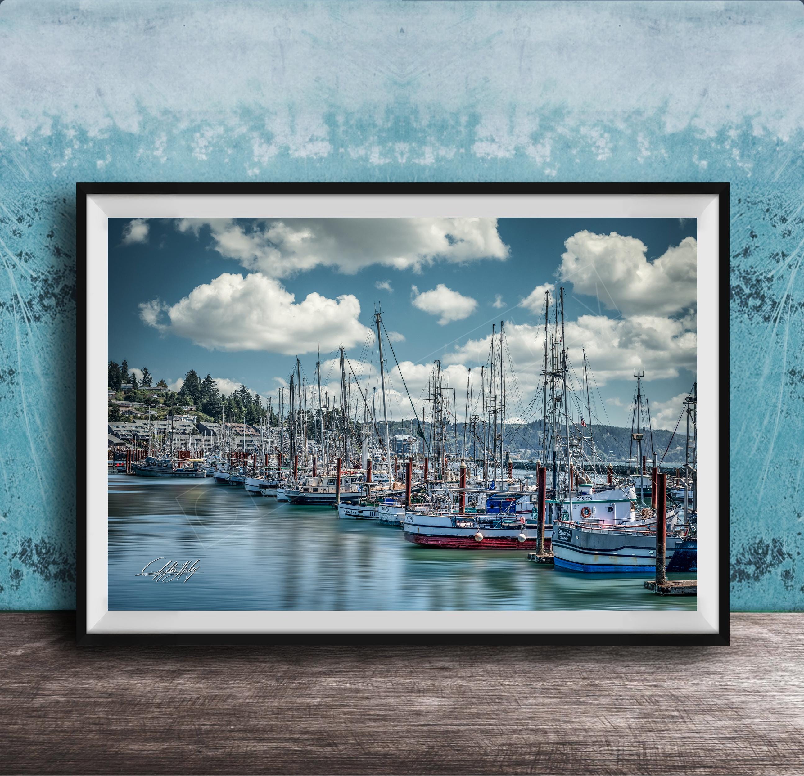 Newport Harbor pier photography captures the serene beauty of sailboat masts, sunset harbor views, and water reflections along the Oregon coast. This fine art print transports you to a peaceful coastal scene where the salty sea air mingles with the gentle sounds of seagulls cawing overhead.