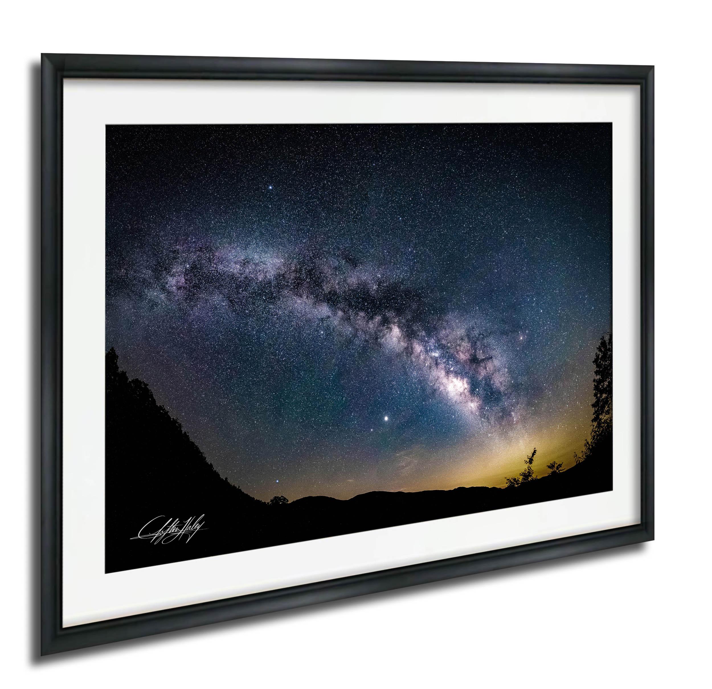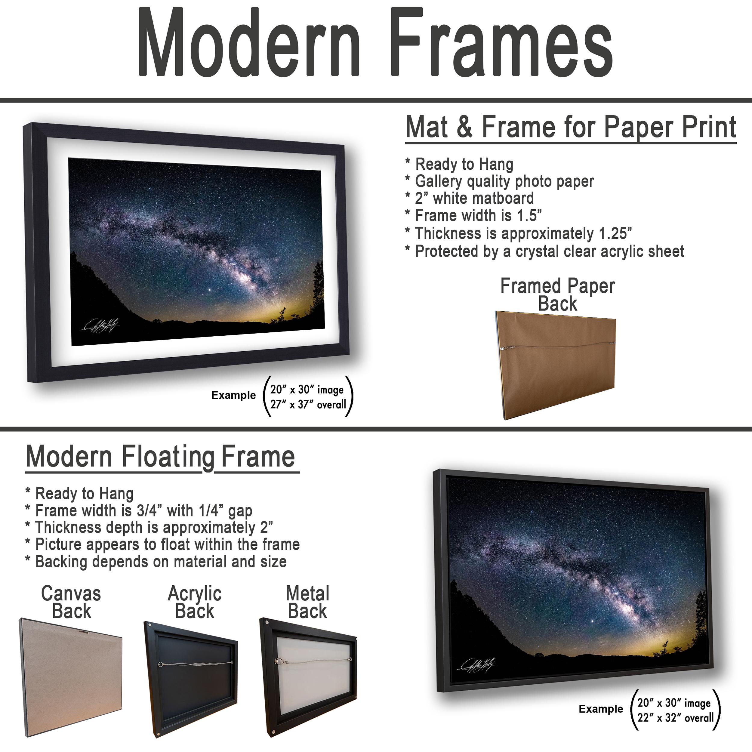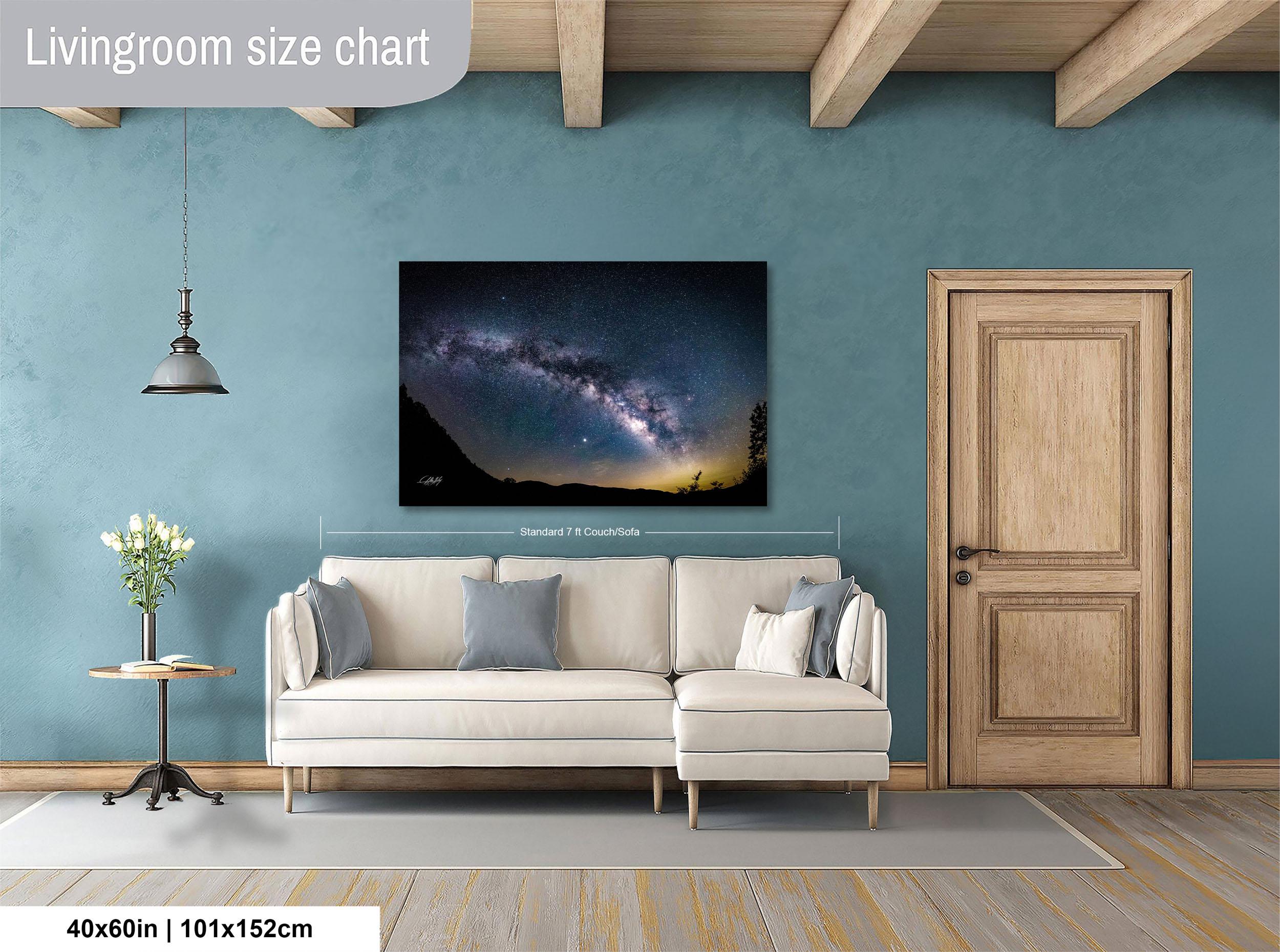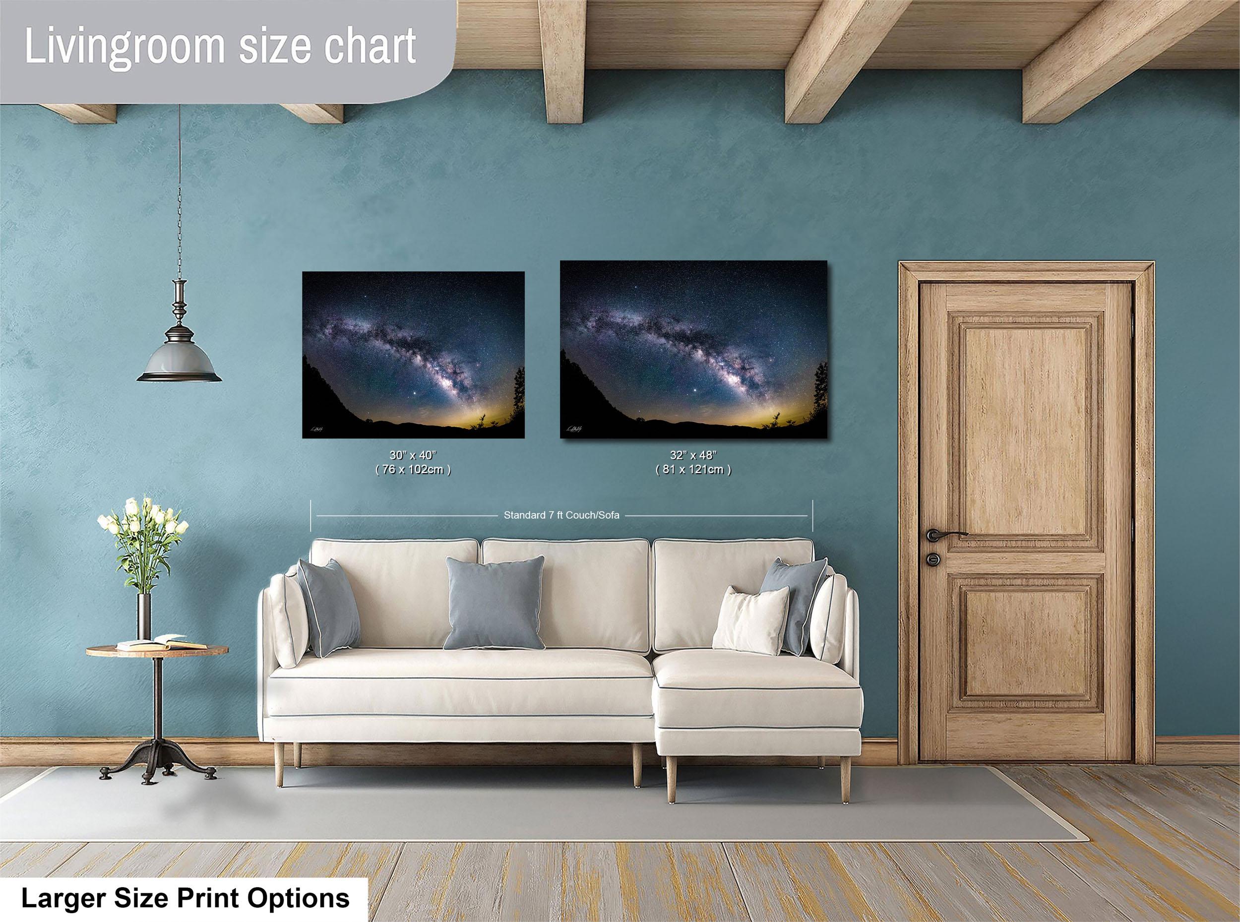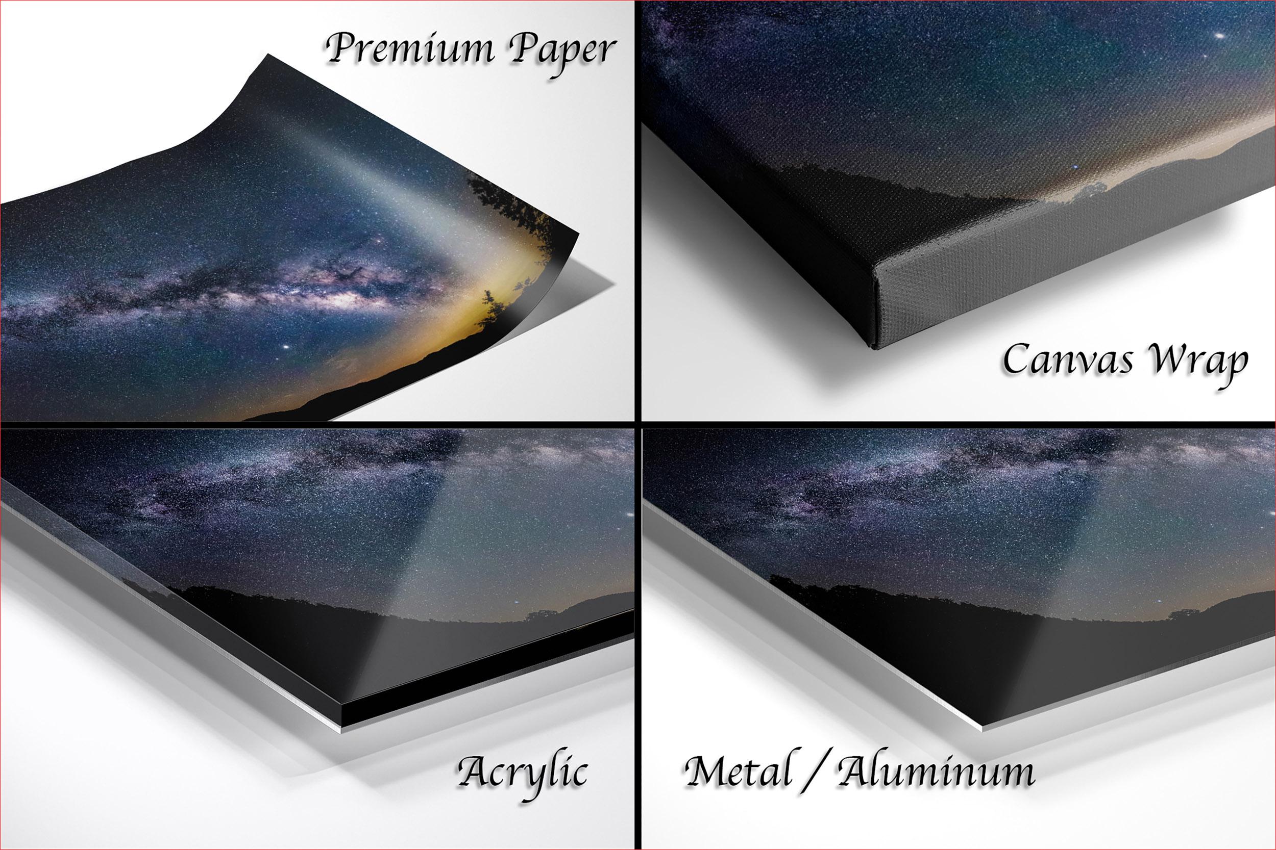 • Custom made-to-order fine art: each Milky Way night scene is carefully created just for you, ensuring a one-of-a-kind piece. • Artist's signature authenticates every print, adding a personal touch to your celestial canvas art. • Available as framed paper prints, acrylics, aluminum/metal prints with a 2" white mat border, or flush-mounted canvas prints without a border.