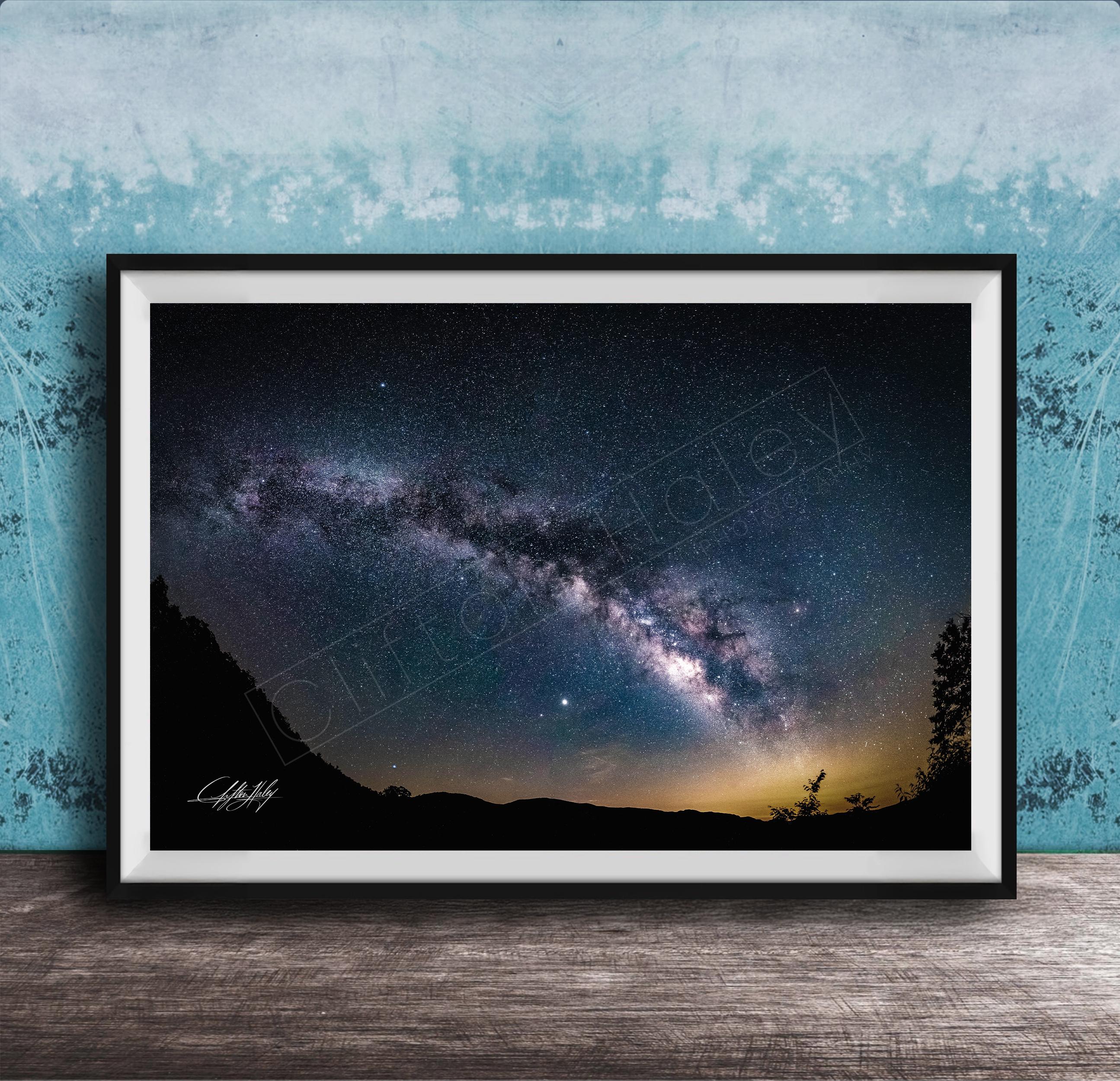 This starry night print evokes the quiet majesty of the Cherohala Skyway's vast universe, where planets like Jupiter, Saturn, and Mars shine brightly. Its vivid colors and cosmic detail make it an exceptional nature wall decor statement for any space.